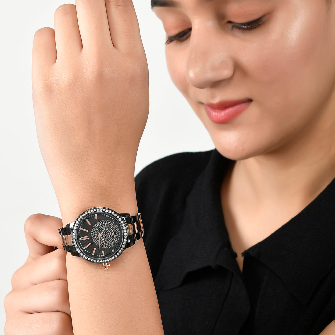 A beautiful black dial studded watch for women in a two tone plating. The analog watch has been made from quality stainless steel and will match with all your outfits.