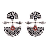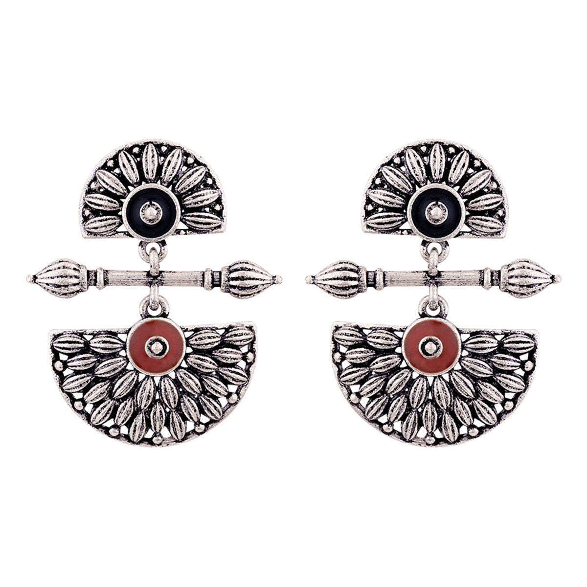 Lightly embellished brass drop earrings with oxidized silver plating. Good for casual wear. This piece of jewelry comes with the Voylla assurance of quality and durability.
