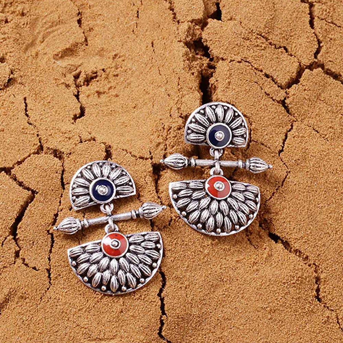 Dreamy Enamel earrings inspired by Jaipur's block printing art. Hand crafted from nickel free brass and given silver plating. Good for ethnic looks.Weight (Gms): 11.6Size (LxW)(Inch): 1.85*1.35Material: BrassPlating: Silver PlatingColor: SilverSales Package: 2 EarringsProduct Code: 8907617929064