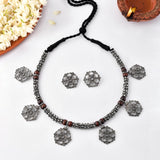 Oxidised plated brass jewellery set featuring a light embellishments and meenakari design. The beaded necklace and matching earrings are lightweight, comfortable and versatile. Pair the set with a casual Indo-Western or Bohemian outfit. Also a good match for traditional looks.Caring...