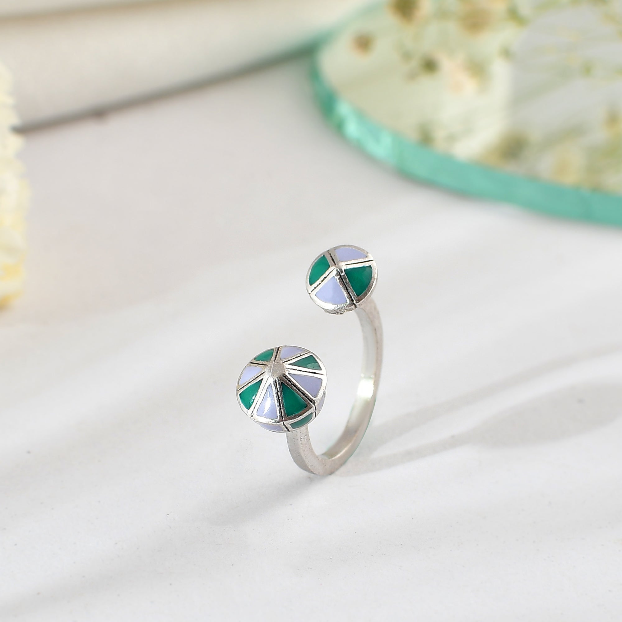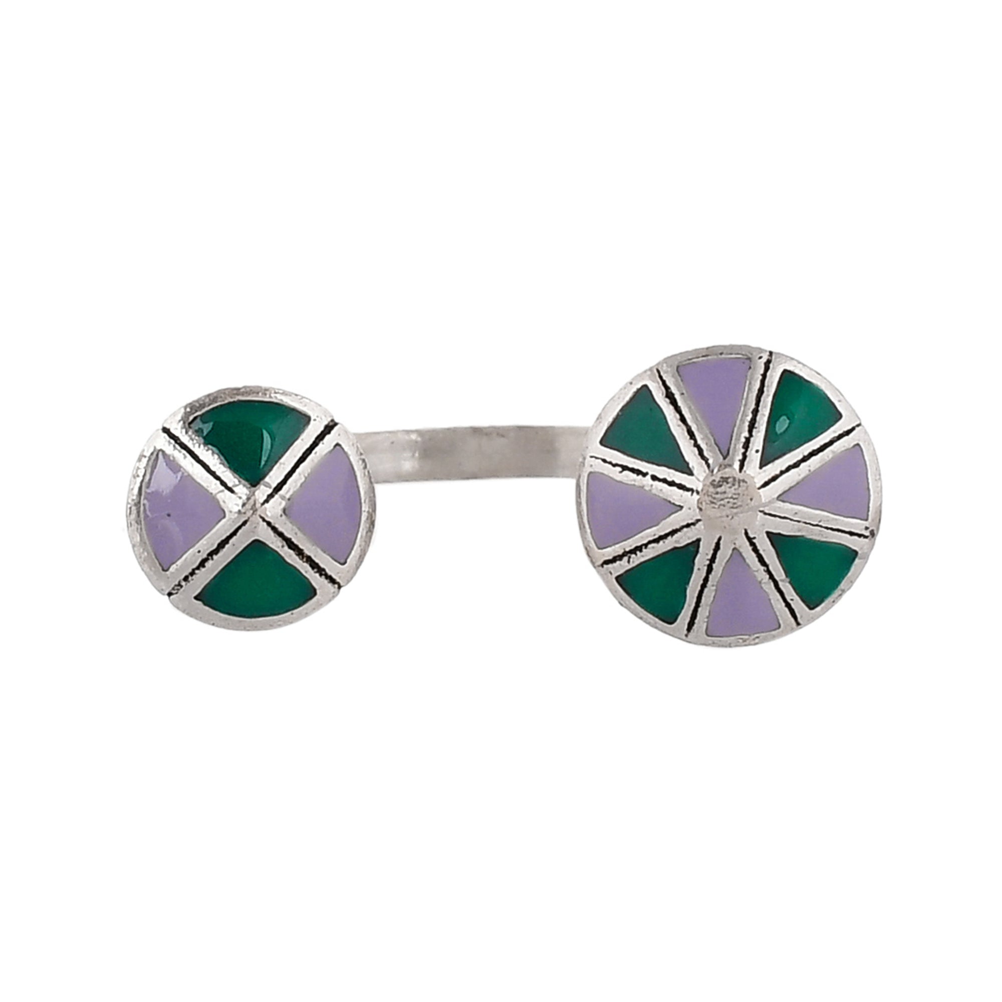 Inspired by the African basket art of Zulu, this brass ring features green and pale pink enamel details. Adjustable for maximum comfort, the open design ring has been given an oxidized silver plating and promises to be a versatile, lightweight wear.