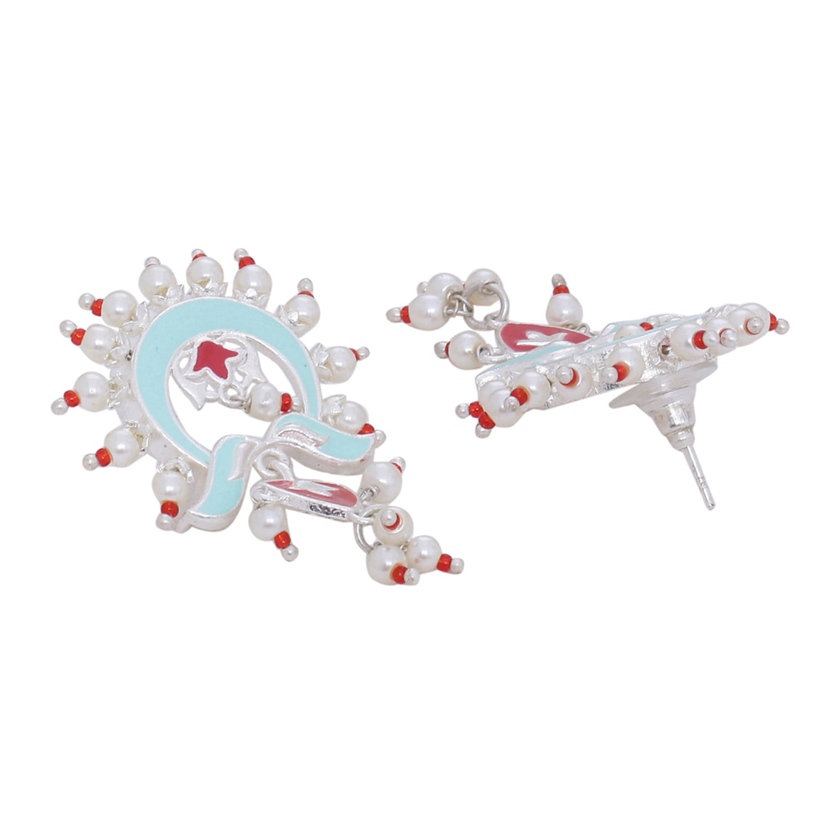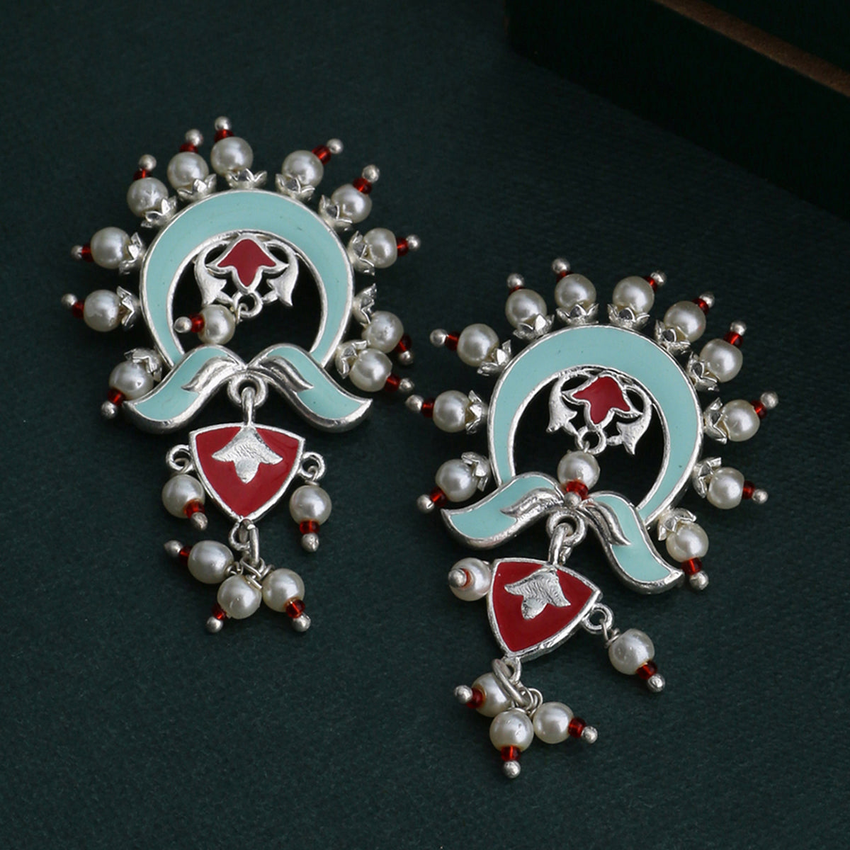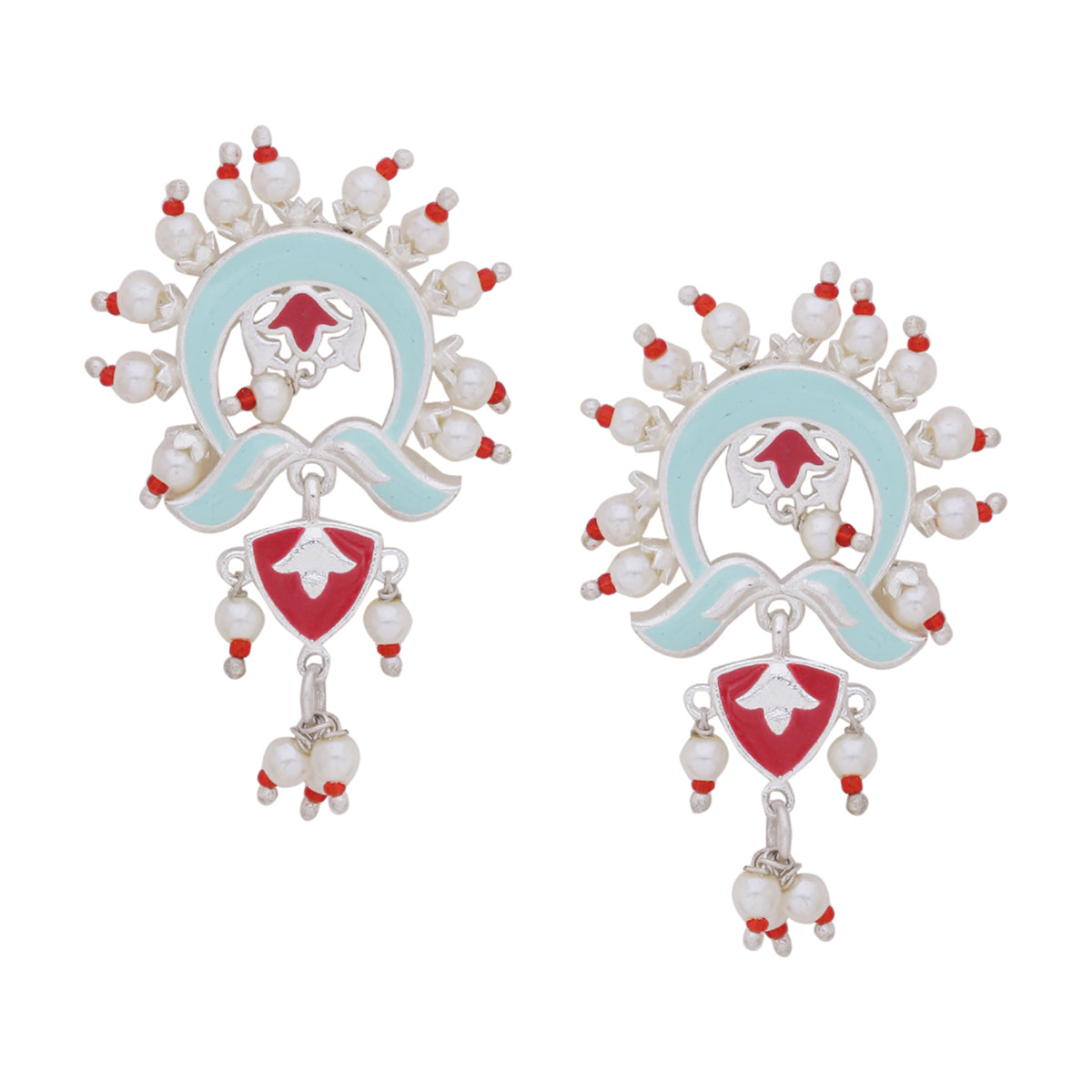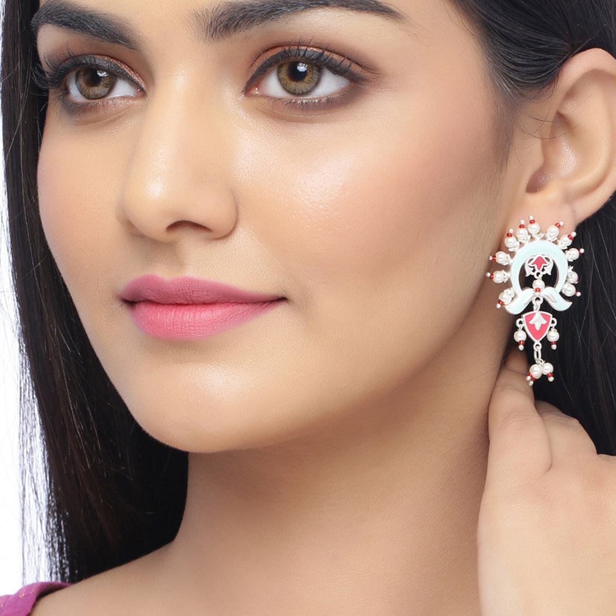 Adorn a traditional design with intricate enamelled and pearl detailing . The Tahira Sunrise Ruby Earrings are a stylish pick for ethnic ensembles. This piece of jewelry comes with the Voylla assurance of quality and durability.