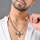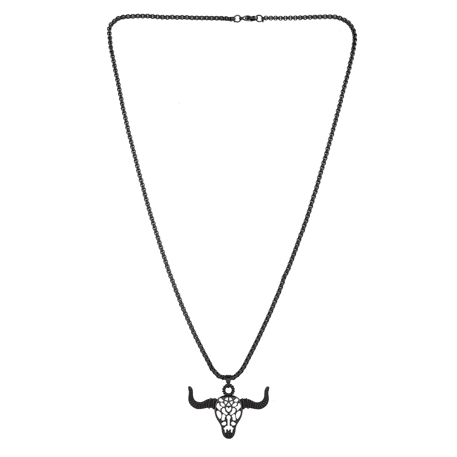 This Voylla pendant for men is a striking piece that combines bold design with sophisticated style. Crafted from high-quality brass, this black pendant for men features a powerful bull motif, symbolizing strength and resilience. The black rhodium plating adds a sleek, modern touch, making it perfect for casual wear, office settings, or even travel. The intricate detailing of the bull’s head showcases exceptional craftsmanship, with every curve and line meticulously designed to create a standout accessory. The deep black color of the pendant ensures it pairs effortlessly with any outfit, adding a touch of elegance and edge. This pendant is not just a piece of jewelry but a statement of style and personality. It’s an ideal gifting option for men, whether for your brother, boyfriend, or as a thoughtful Rakhi gift. The robust chain complements the pendant’s masculine appeal, making it a versatile addition to any man’s collection. Perfect for those who appreciate unique and meaningful accessories, this Voylla pendant is a testament to modern design and timeless symbolism.