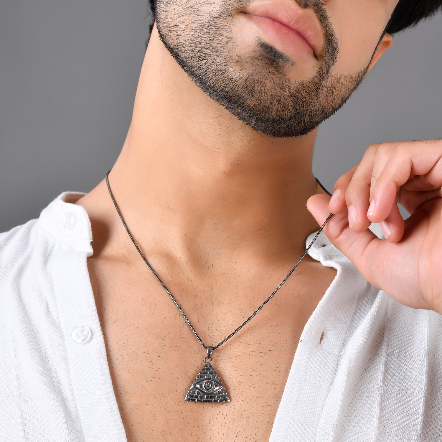 This Voylla pendant for men is a striking piece that seamlessly blends modern design with symbolic depth, making it a standout accessory for any occasion. Crafted from high-quality brass and finished with a sleek black rhodium plating, this black pendant for men features an intricate geometric pattern that catches the eye. At its heart lies the Illuminati-inspired Eye of Providence motif, symbolizing enlightenment and protection. The pendant’s dark, enigmatic hue makes it a versatile addition to both casual wear and office attire, ensuring it complements any outfit effortlessly. Perfect for gifting, this pendant is an ideal choice for men, whether it’s for your brother, boyfriend, or a special someone. With Rakhi around the corner, it also serves as a thoughtful Rakhi gift, combining style with a touch of mystique. Whether you’re traveling or in a professional setting, this Voylla pendant is sure to make a statement, highlighting your unique sense of style and appreciation for meaningful design.