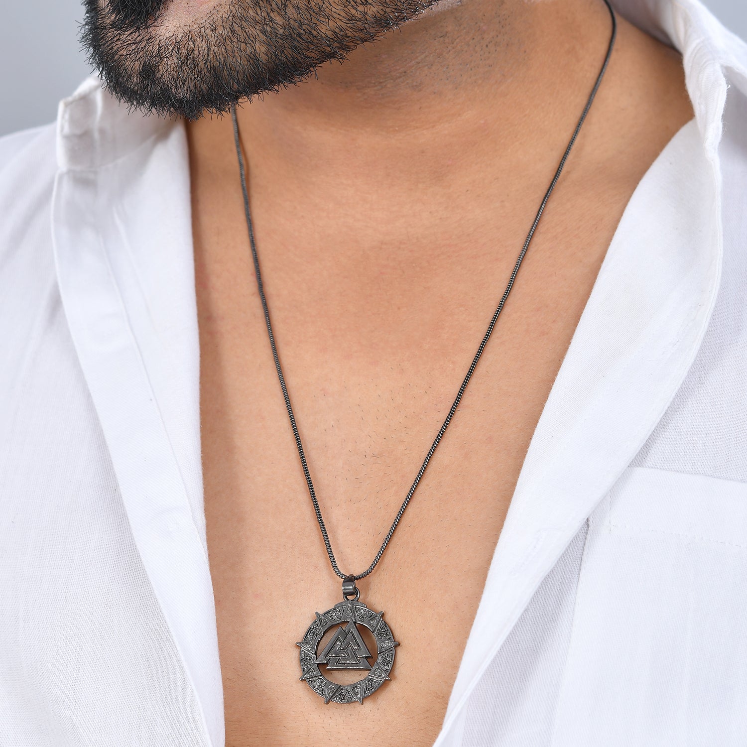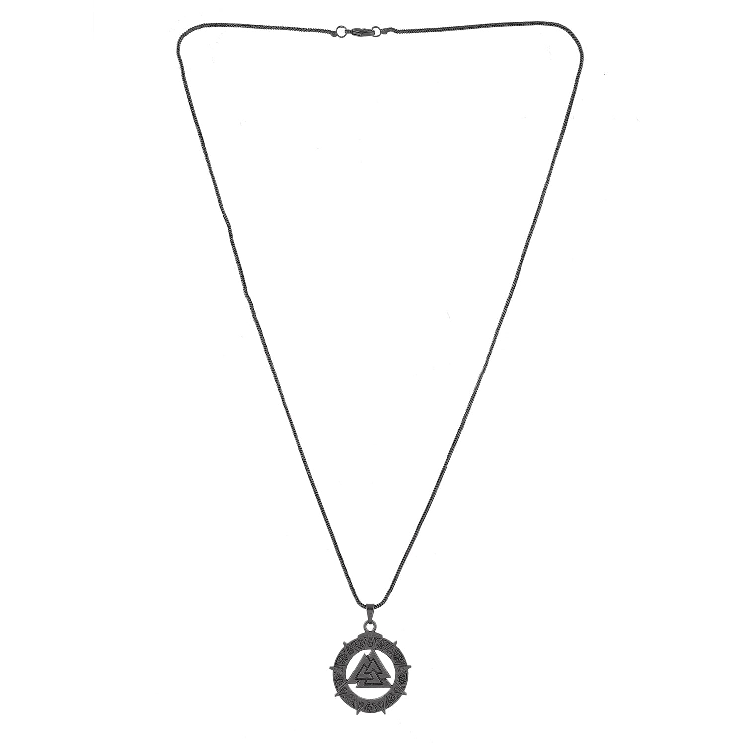 The Eclipse Valknut Star Symbol Black Men’s Pendant from the Eclipse Collection is a powerful symbol of strength, eternity, and style. Crafted from premium-quality brass and finished in bold black rhodium plating, this fashion pendant embodies a perfect harmony between spiritual symbolism and contemporary design. The intricate Valknut knot at the center represents unity, protection, and eternal power, surrounded by an ornamental circular frame detailed with geometric star patterns. With its sleek metallic finish and bold aesthetic, this stylish pendant stands out as a statement piece for modern men who carry depth and confidence in their fashion choices. This pendant for men pairs meaning with sophistication, ideal for those who appreciate minimal accessories that speak volumes. Its high-quality build ensures durability and a long-lasting shine, while its distinct design allows it to complement both casual and formal looks. Whether you’re looking for a spiritual charm or a bold chain pendant for men that enhances your style, this piece delivers both elegance and edge. It also makes a thoughtful pendant for gifting, perfect for birthdays, anniversaries, or meaningful occasions.