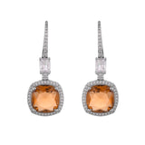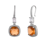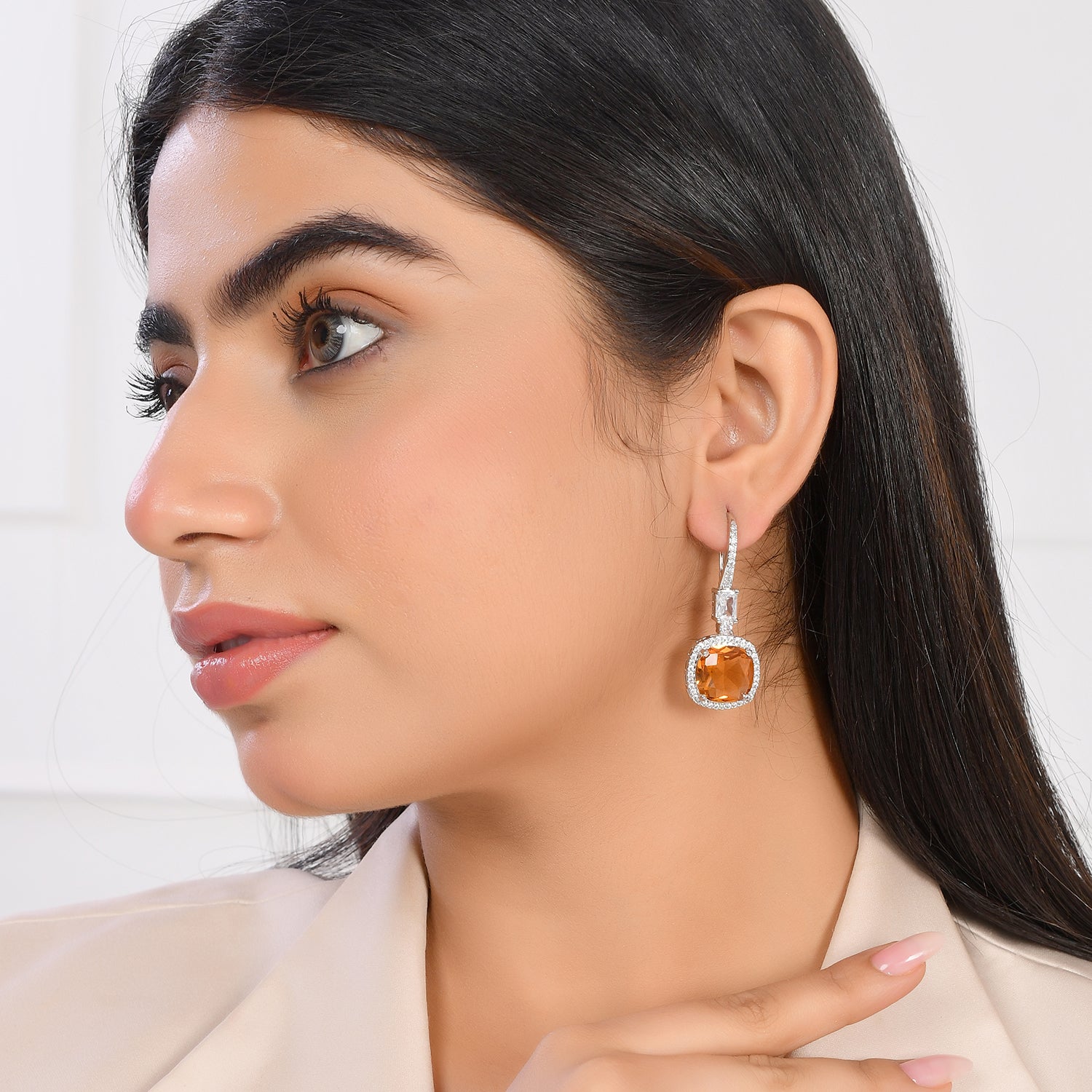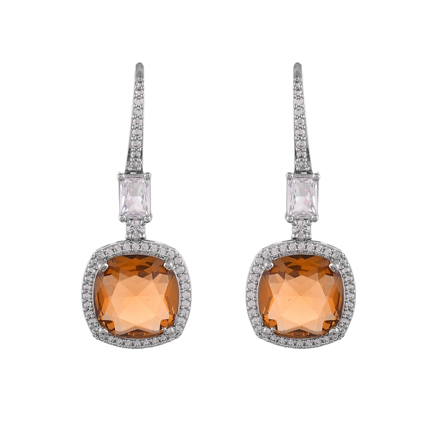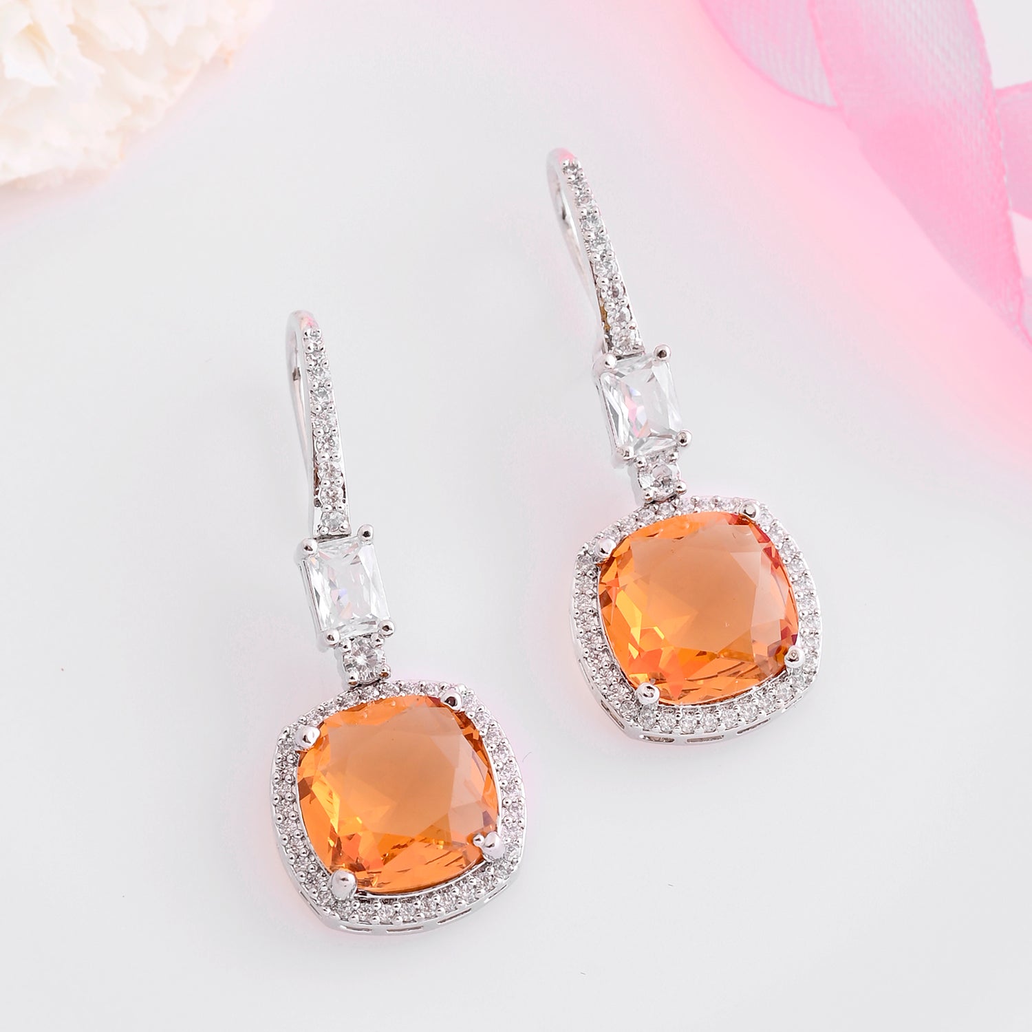 Tiny, casual drop earrings made from brass and silver plated. Embellished with a single red square cut and several round cut white CZ gemstones. Pair with any of your favourite outfits.