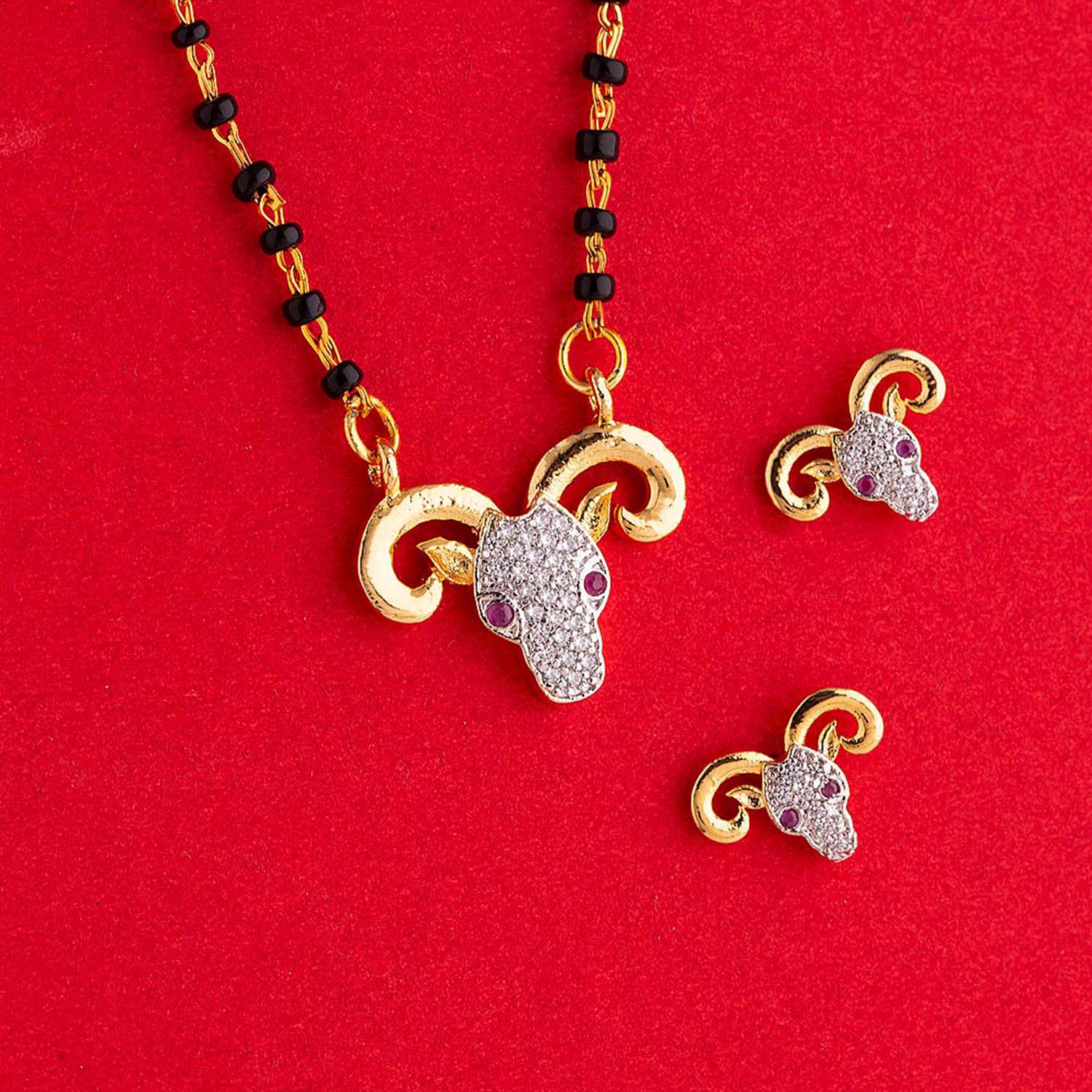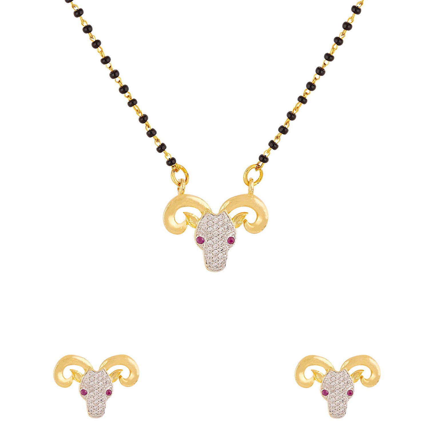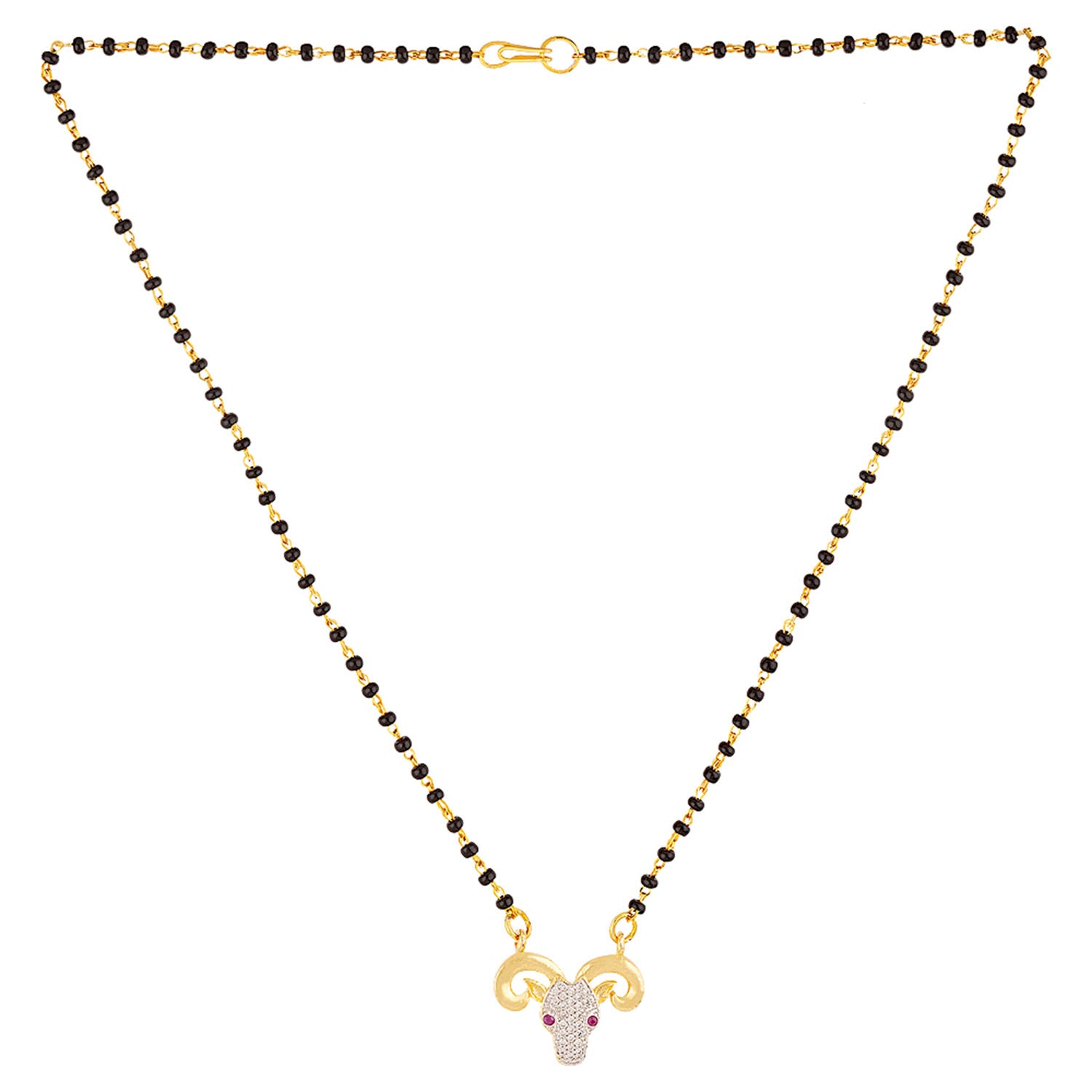 Mangalsutra embellished with American Diamond gems and adorned with Aries zodiac sign. Made from brass and two tone plated. Wear with casual attire.