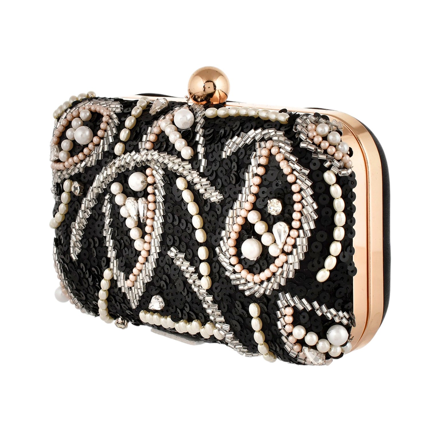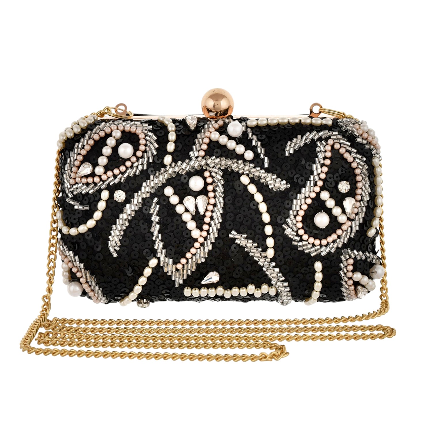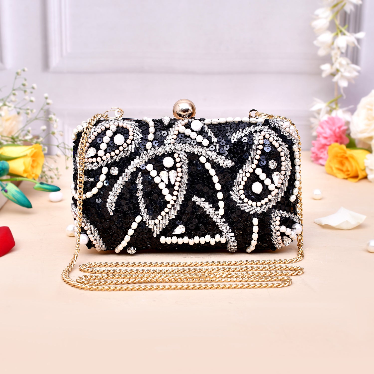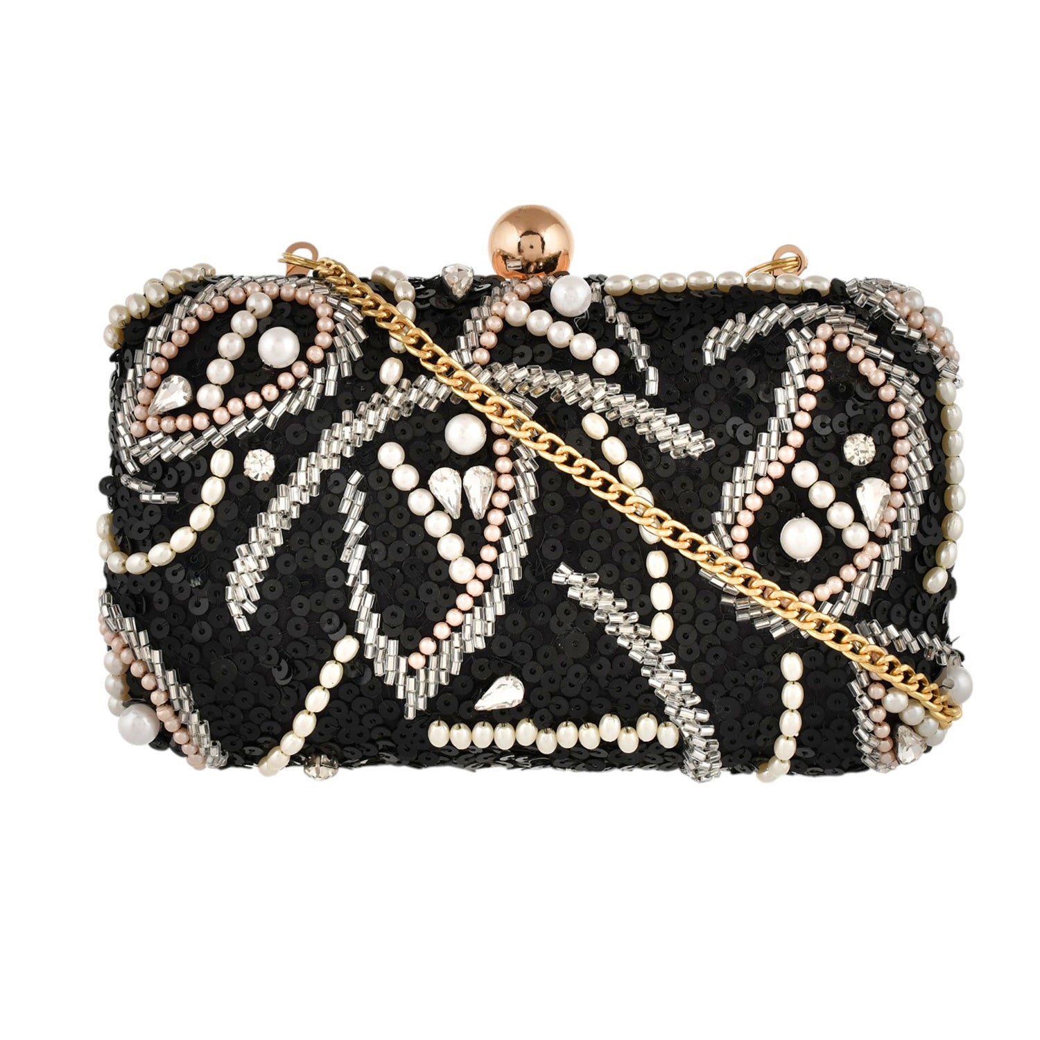Paisley motifs adorned studded and heavily embellished clutch, made from high quality fabric. The black clutch is versatile, spacious and durable.