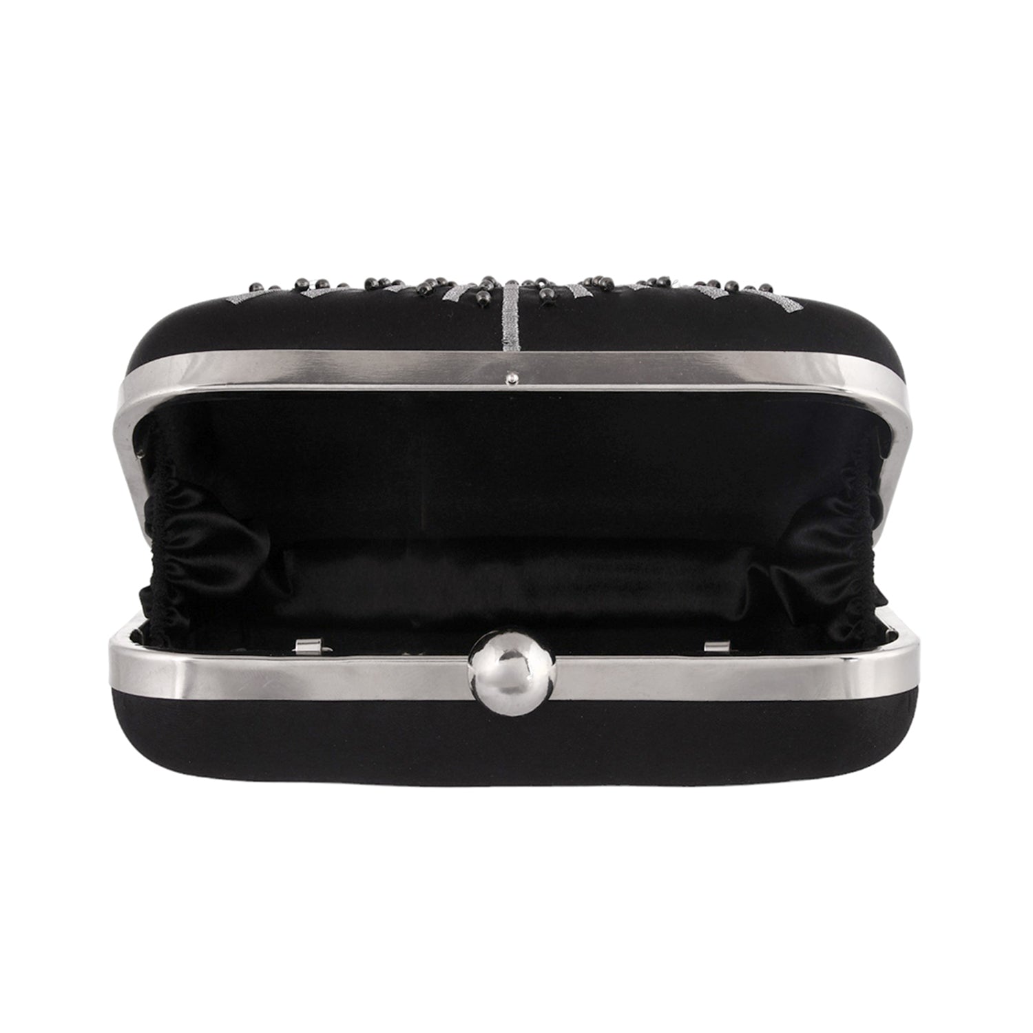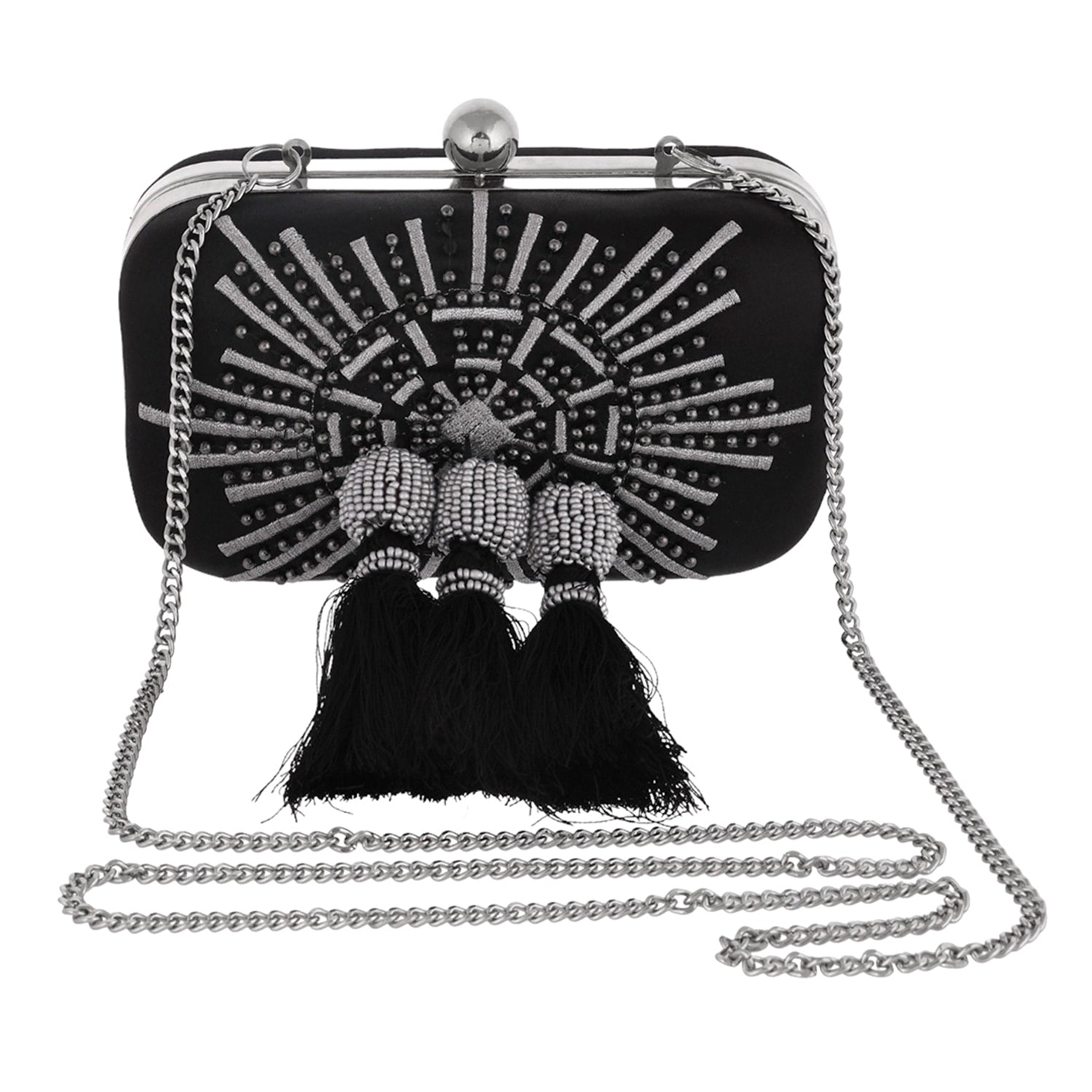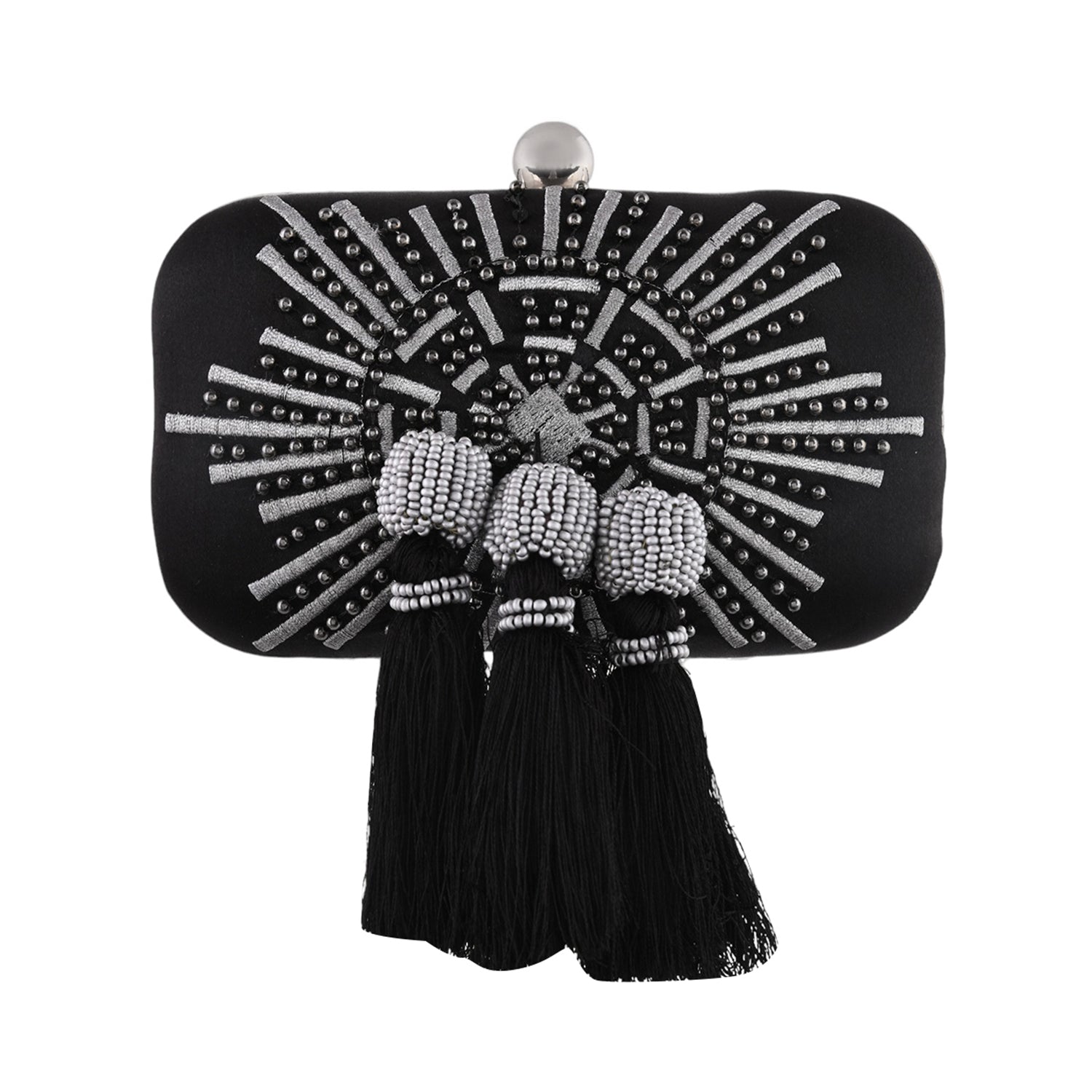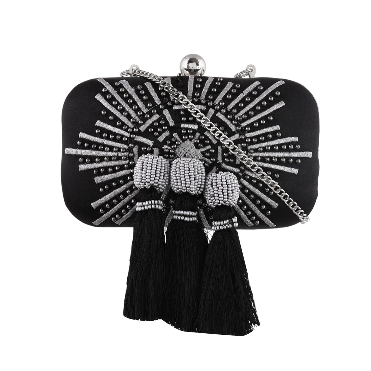 Black fabric clutch embellished with metal studs and tassels. The spacious clutch will hold all your essentials and match perfectly with formal ethnic looks.