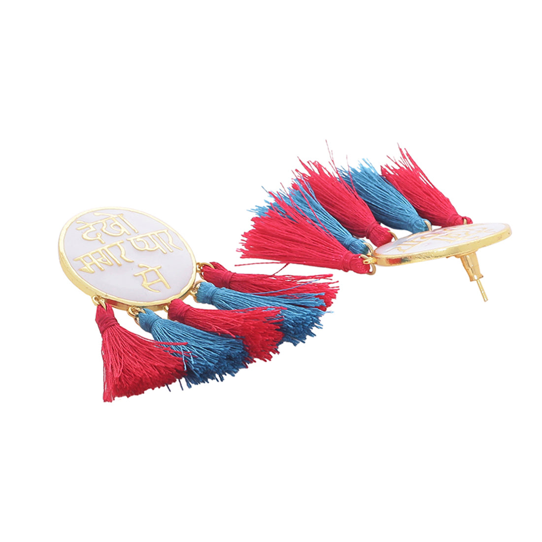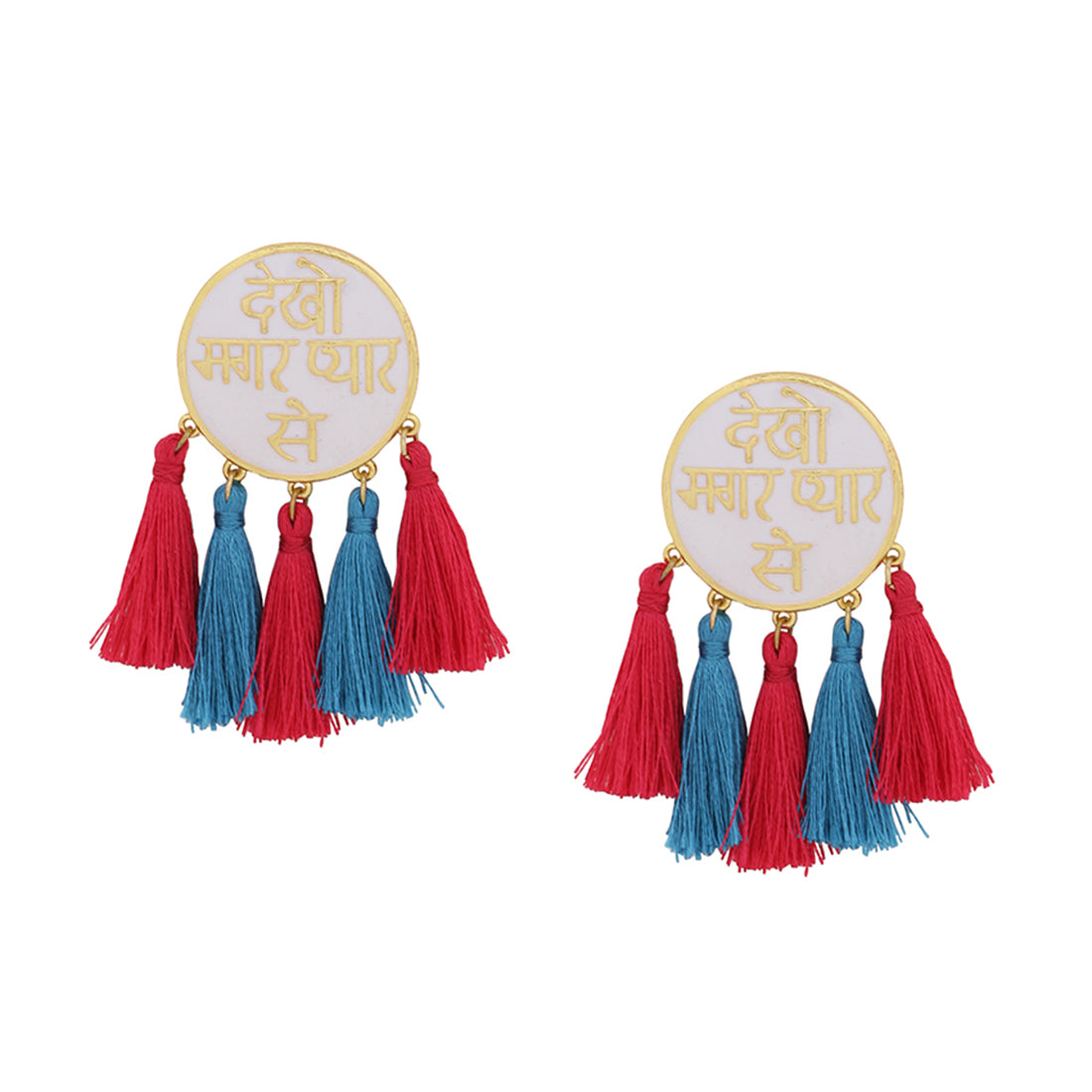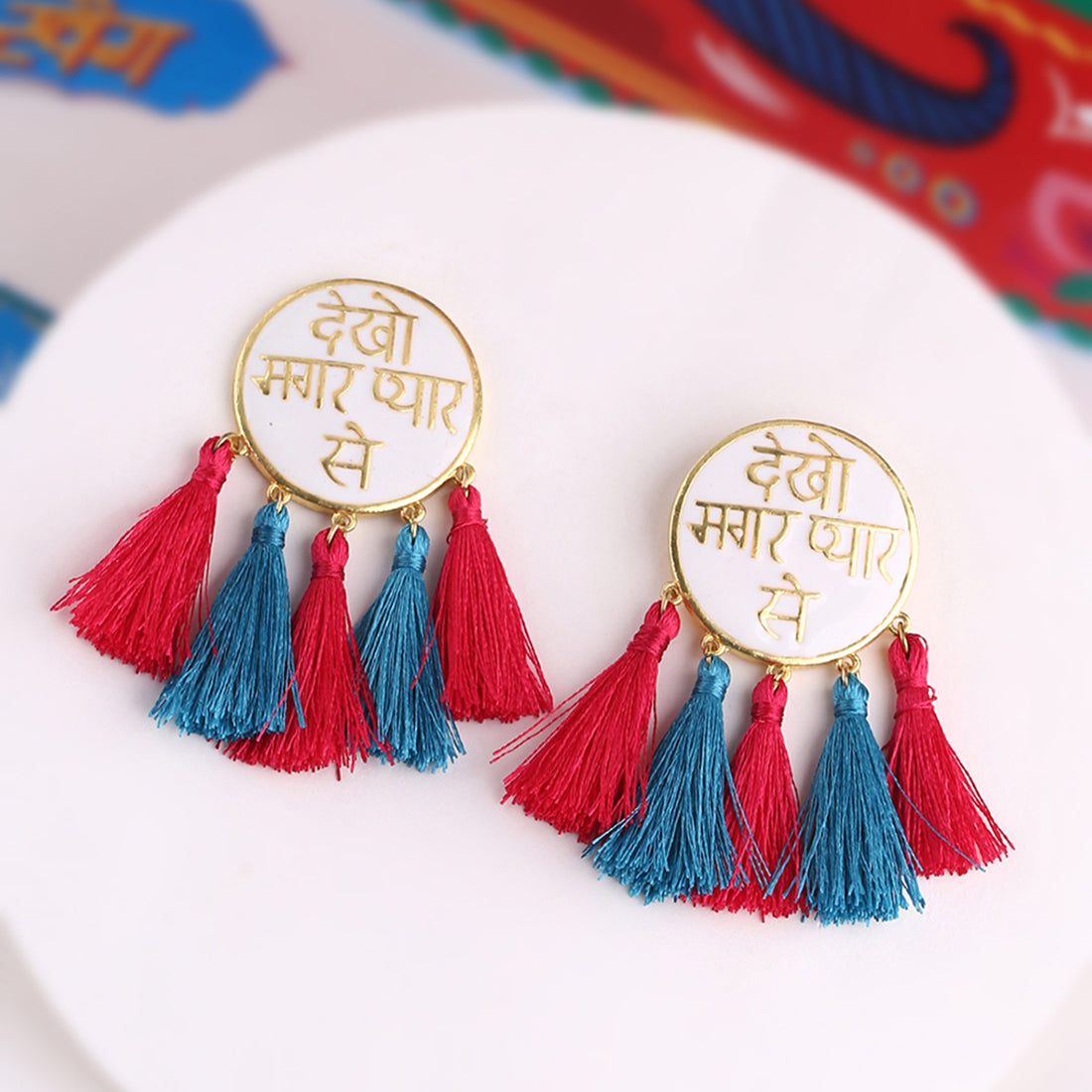 Dekho Magar Pyar Se' lettering inscribed drop earrings, inspired by the colourful surfaces of Indian trucks. Featuring tassels and fashioned out of brass, the yellow gold plated earrings can be paired with Indian and Indo-Western looks.