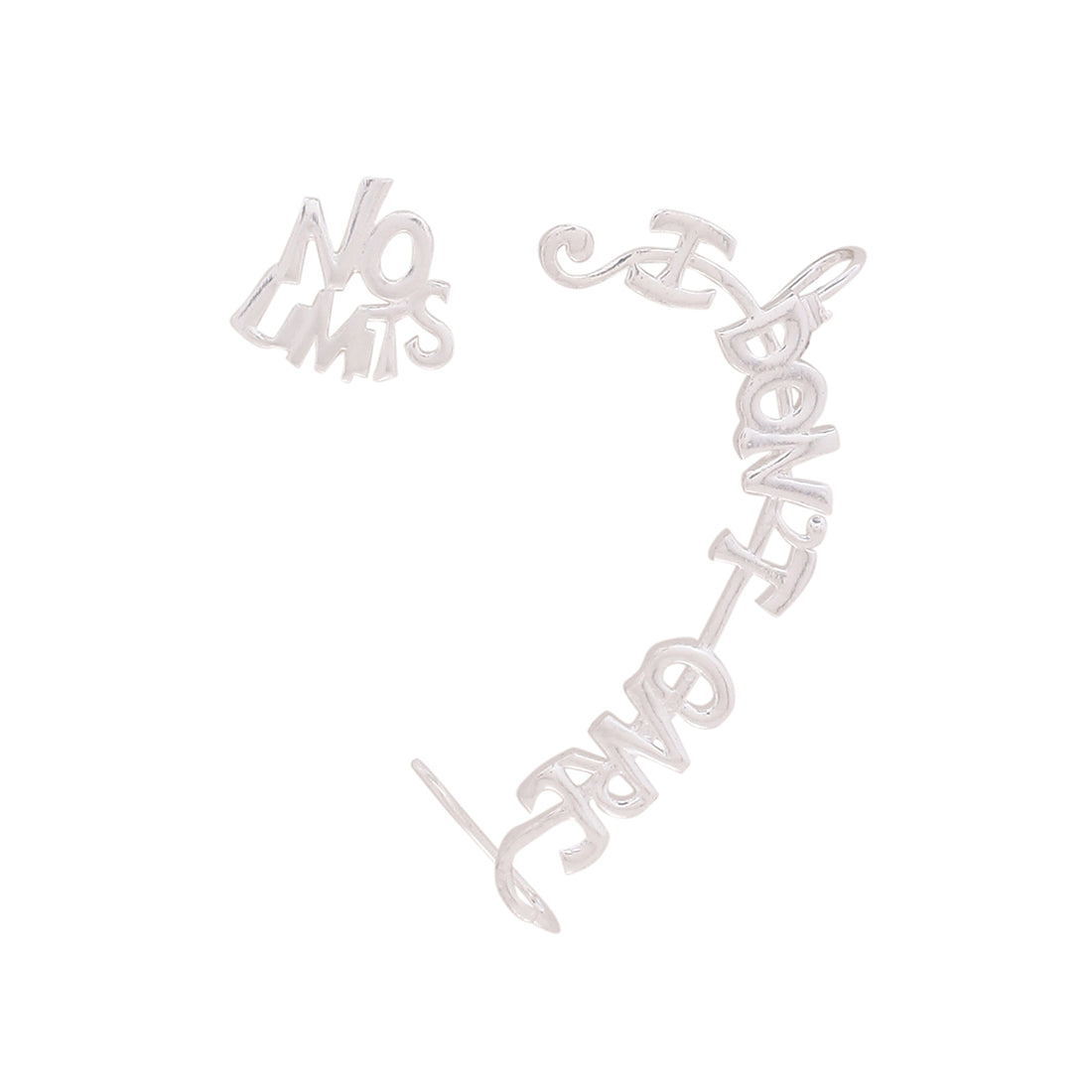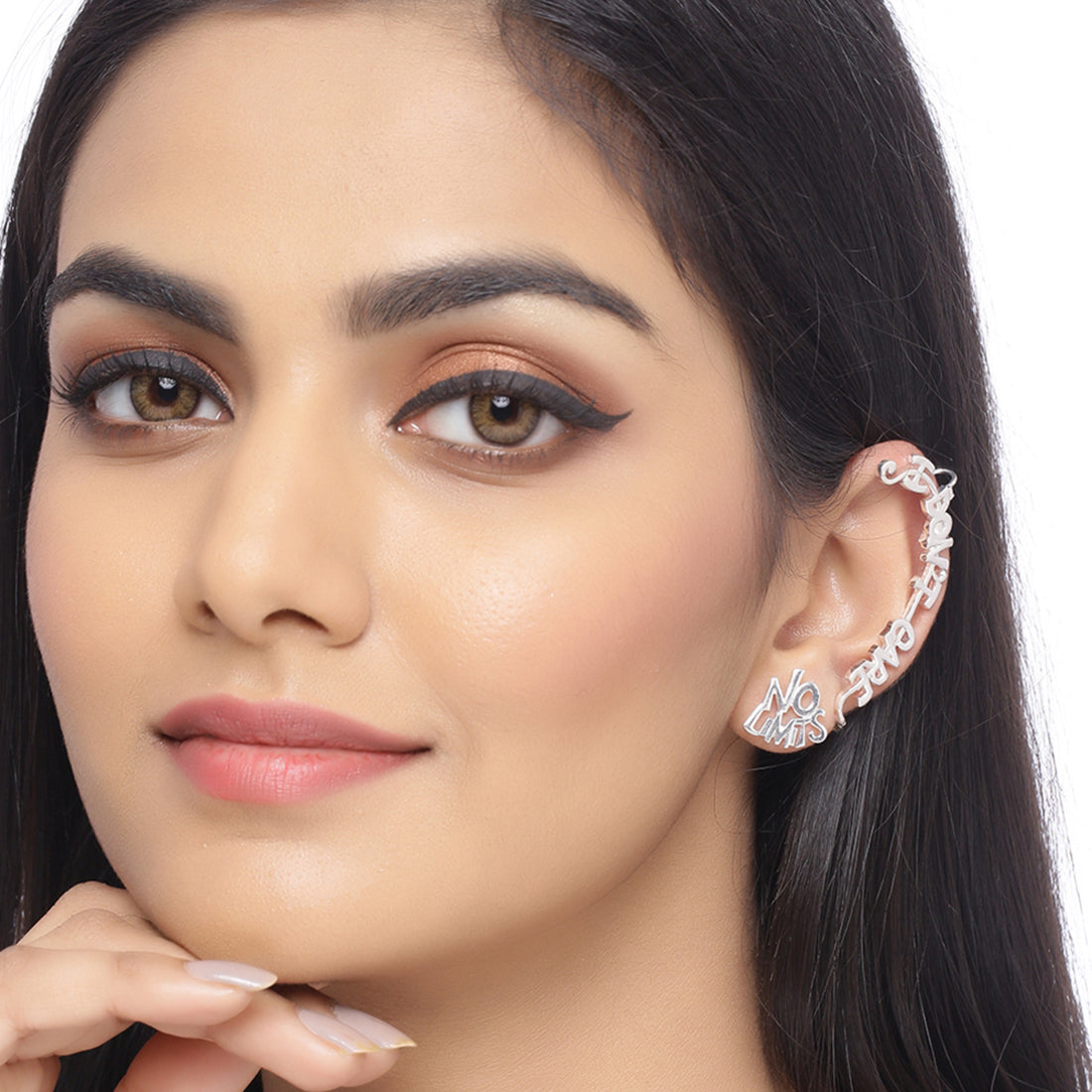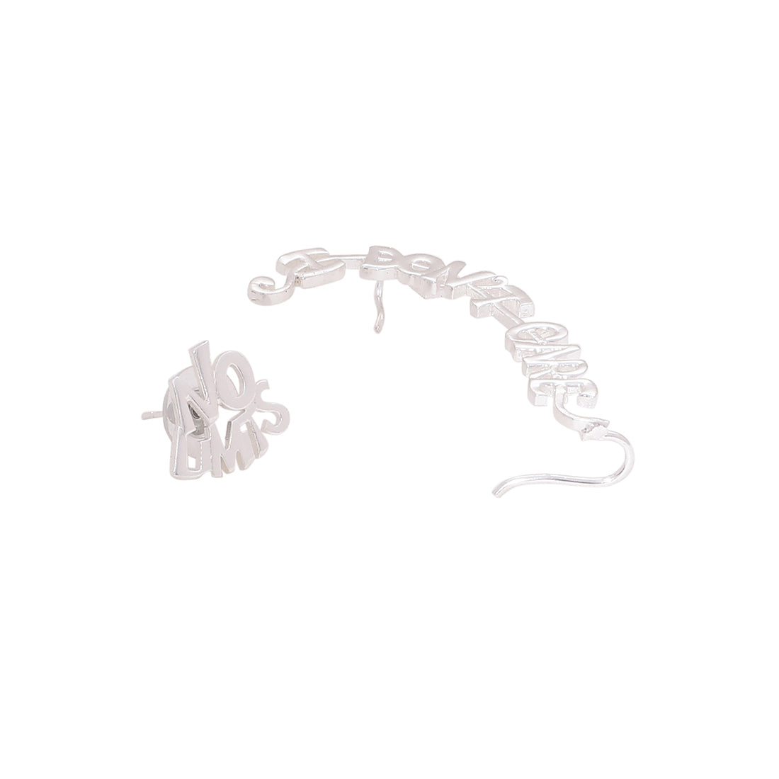 Inscriptions found on Indian trucks as decorations have inspired these cuff-and-stud earrings, featuring 'I don't care' and 'no limit' letterings. Made from brass and silver plated, the pair is comfortable and lightweight. Pair with Indo-Western attire.