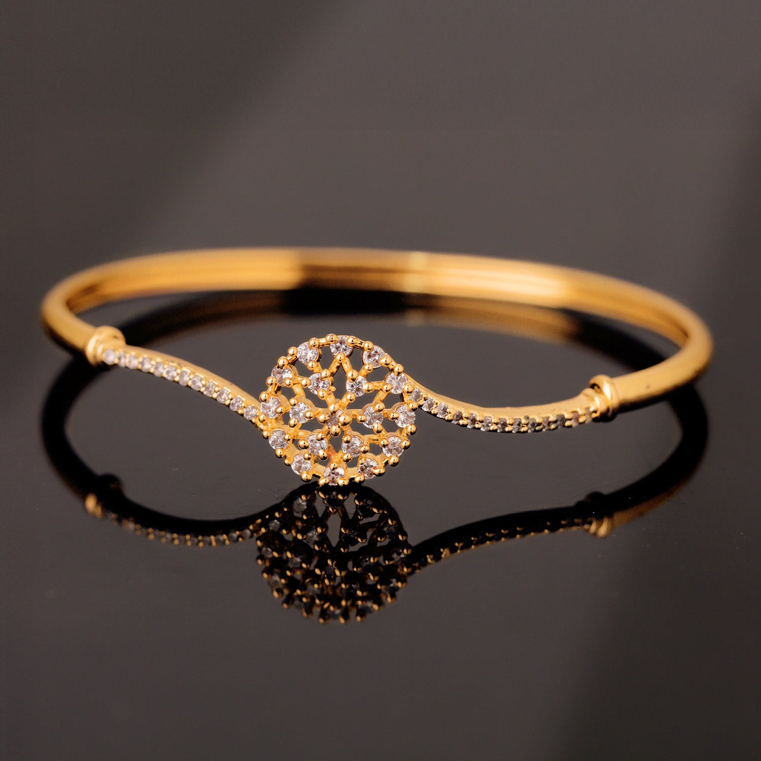 From our graceful Sparkling Elegance Collection, the Golden Bloom CZ Bracelet for women is designed to capture the beauty of fine detailing and soft sparkle. The floral inspired centerpiece is decorated with shimmering american diamond stones that create a lovely glow, giving this statement Bracelet a rich and elegant look that feels both classic and modern. Crafted from premium quality brass and finished with smooth yellow gold plating, this women Bracelet offers long lasting shine, strength, and a comfortable fit. The cz Bracelet stones catch the light beautifully, while the openable Bracelet design makes it easy to wear and remove while staying secure on your wrist. The warm yellow gold color enhances every skin tone and pairs effortlessly with festive wear, traditional outfits, and everyday styles. Whether you are dressing up for a celebration, a romantic dinner, or simply want to add a little sparkle to your daily look, this Bracelet for women is a perfect choice. This Bracelet also makes a thoughtful gift for women, whether chosen as a gift for lover, a valentines day gift, a galentine gift, or a special gift for self to celebrate self love and personal style.