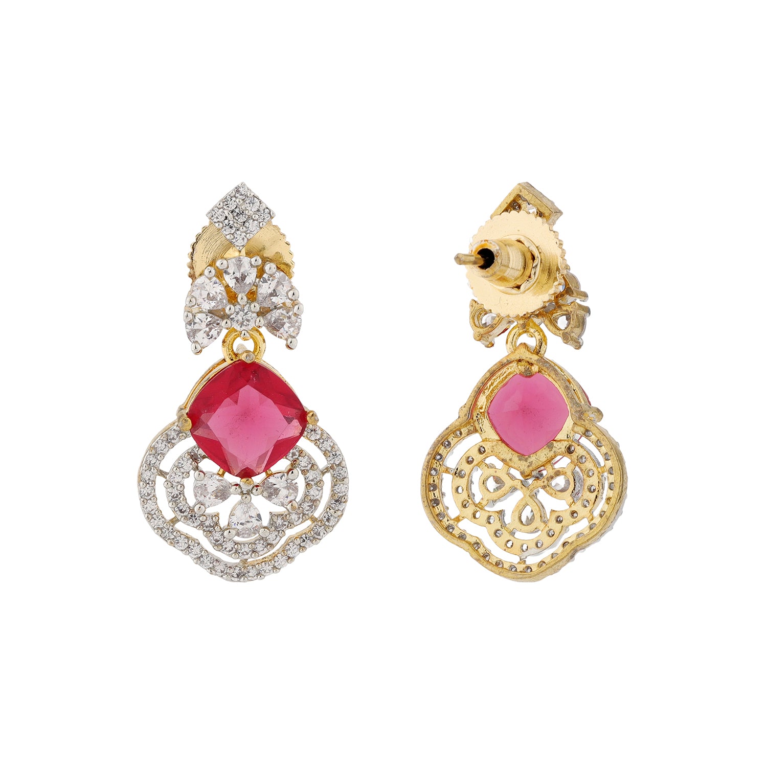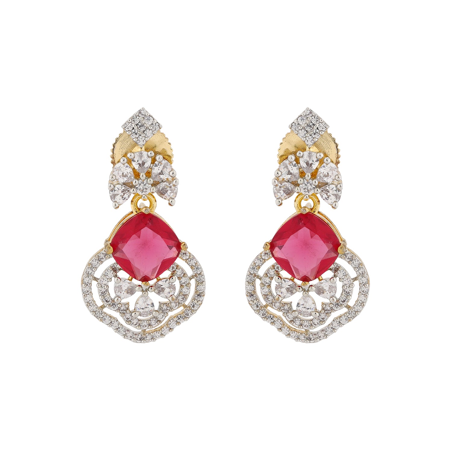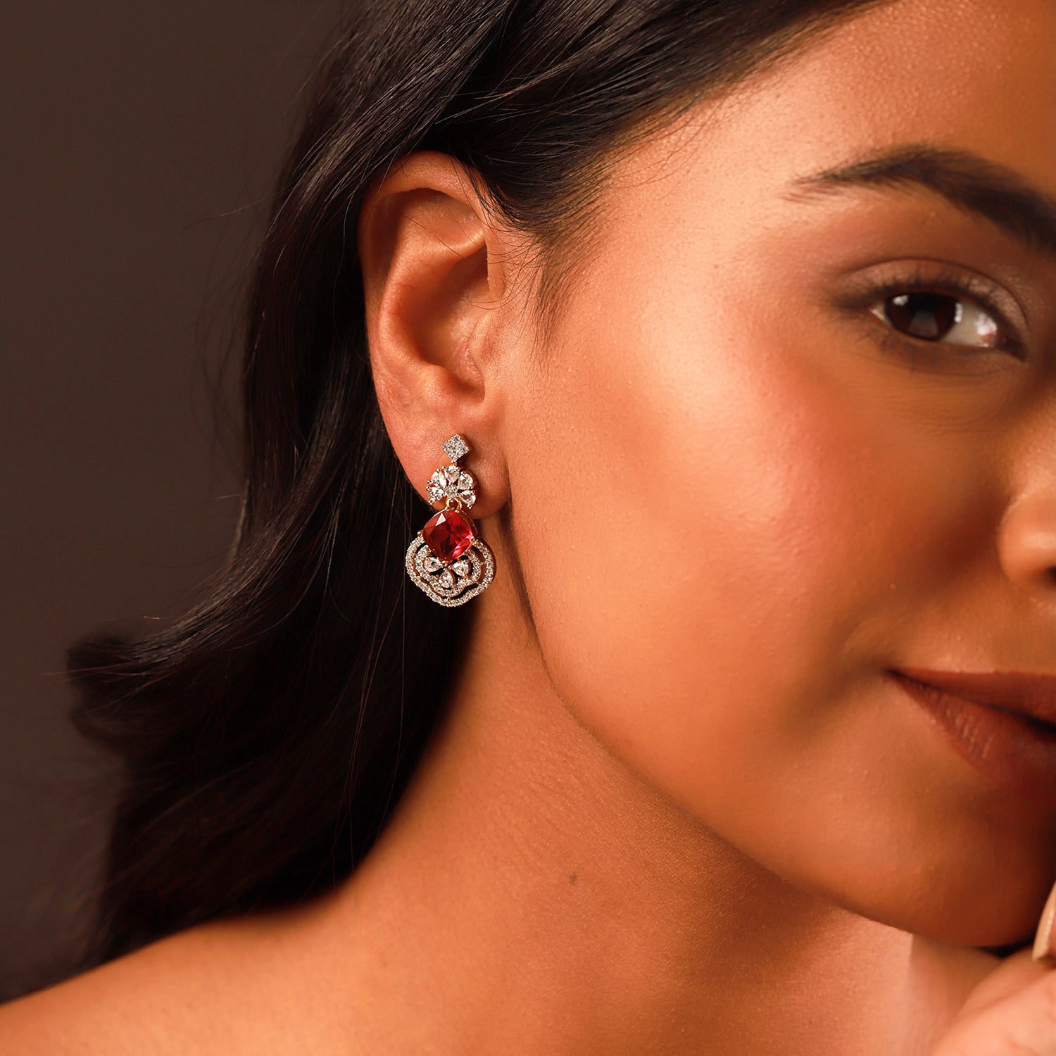 Unveil the allure of royal glamour with the Sparkling Elegance Collection’s Scarlet Bloom Earrings, a stunning pair of dangler earrings for women designed to radiate elegance and sophistication. Crafted from premium brass and coated with a rich yellow gold plating, these cz earrings for women feature a mesmerizing design centered around a vivid ruby-red stone surrounded by clusters of sparkling American diamonds. The floral-inspired pattern, accentuated with intricate detailing, exudes timeless beauty, making these stylish earrings a perfect blend of traditional grace and modern artistry. Ideal for weddings, festive celebrations, or glamorous cocktail evenings, these designer earrings add a touch of brilliance to every ensemble. Whether you wear them to make a statement or gift them as a heartfelt gift for wife, gift for girlfriend, or gift for women, the Scarlet Bloom Earrings are a symbol of love, luxury, and luminous charm.