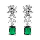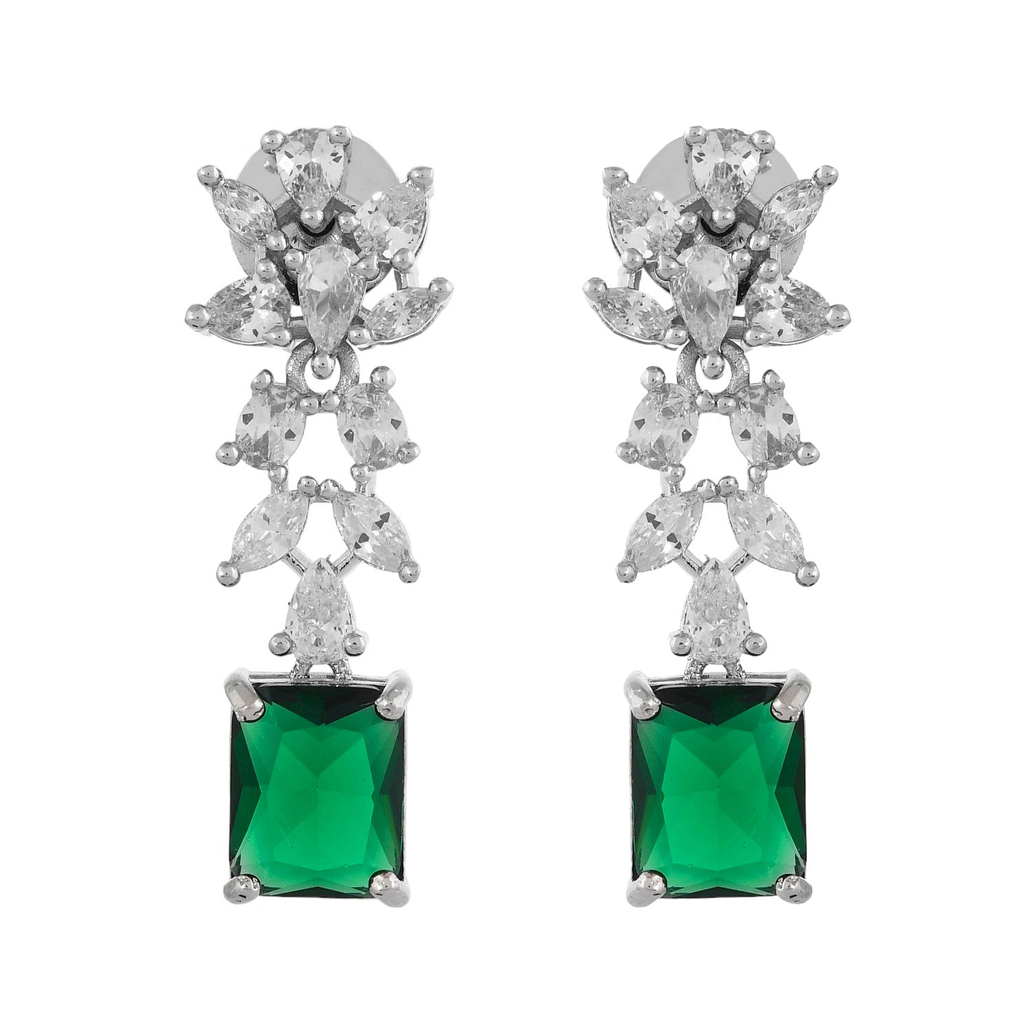 Indulge in the timeless elegance of this Voylla jewellery set for women, featuring a meticulously crafted long necklace and matching earrings. Made from high-quality brass and plated with lustrous white rhodium.The intricate design includes square-cut green stones framed by clusters of radiant Cz stones, creating a harmonious blend of traditional and contemporary styles. The detailed filigree work adds a touch of vintage charm, making it a perfect statement jewellery set for women. This versatile necklace set for women is ideal for cocktail parties, weddings, or as a thoughtful gift for your wife or sister on special occasions like Rakhi.