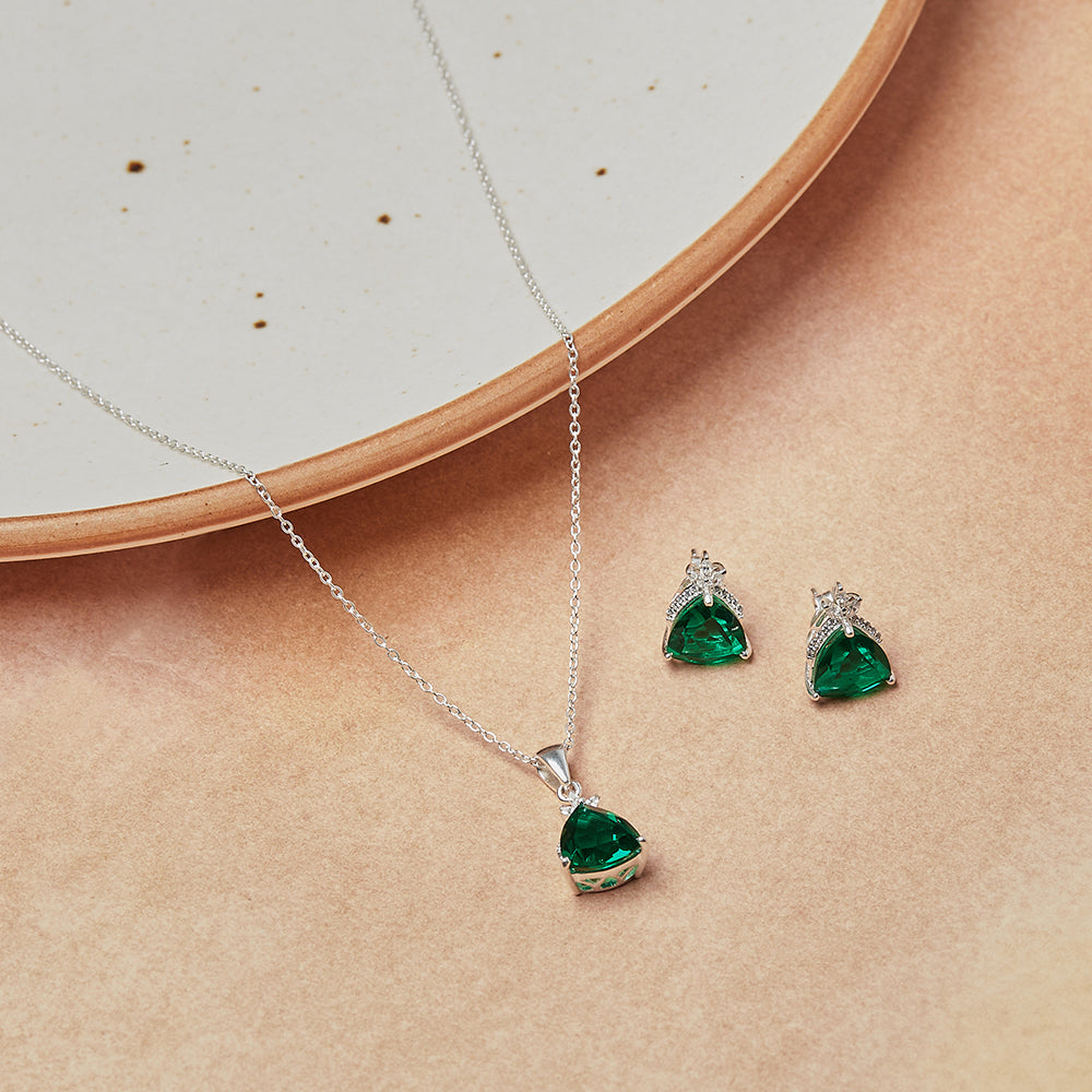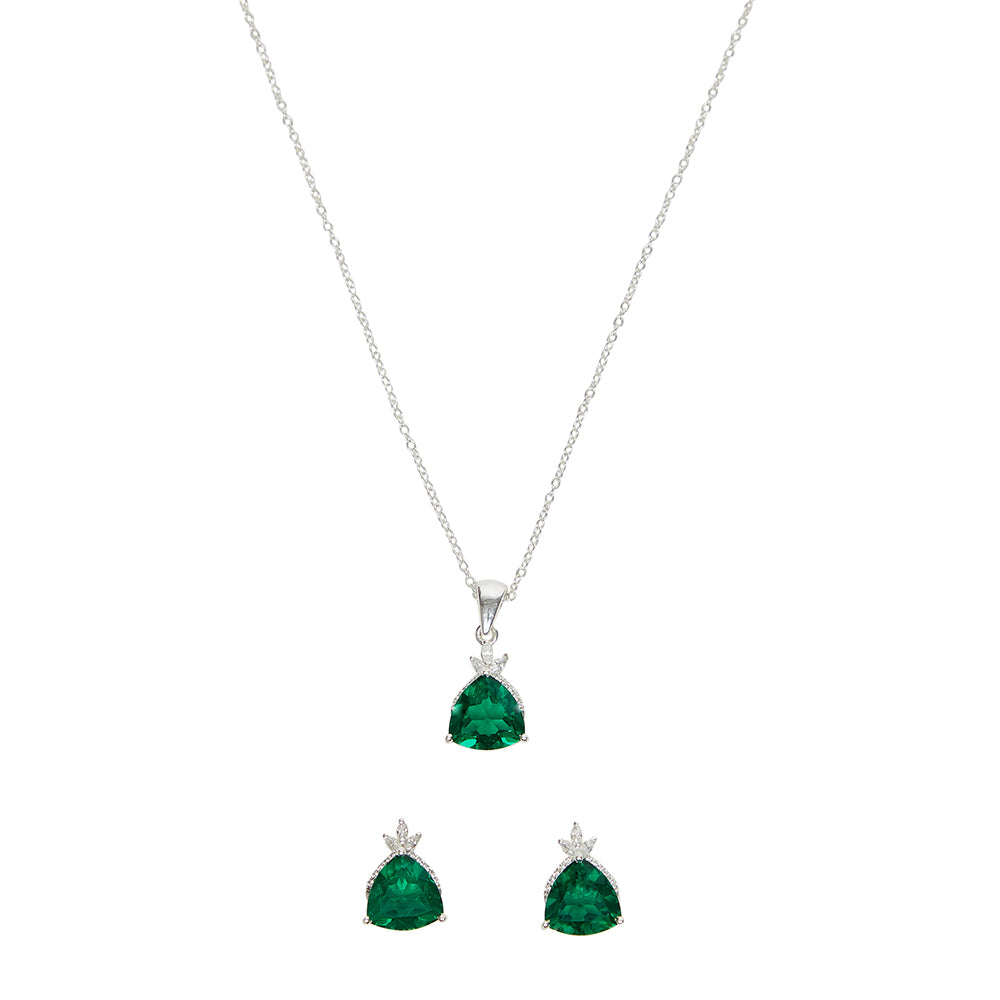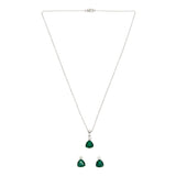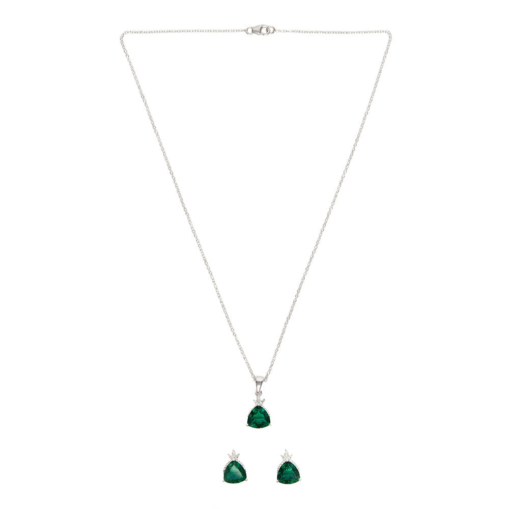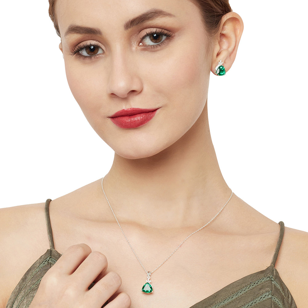 Highlight your exquisite taste in jewellery with this shimmering pendant set. Impeccably crafted silver toned pendant and matching earrings ornamented with diamond-like Cz and prominent, sparkling green stones make it one alluring set to watch out for!