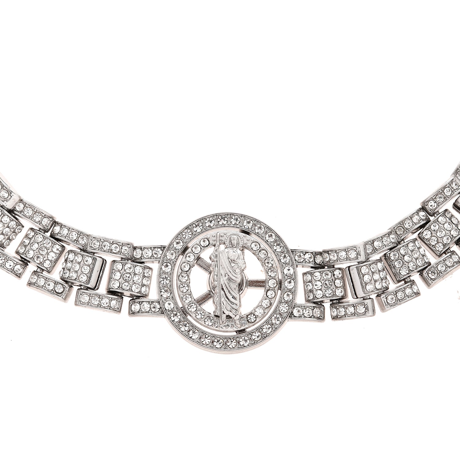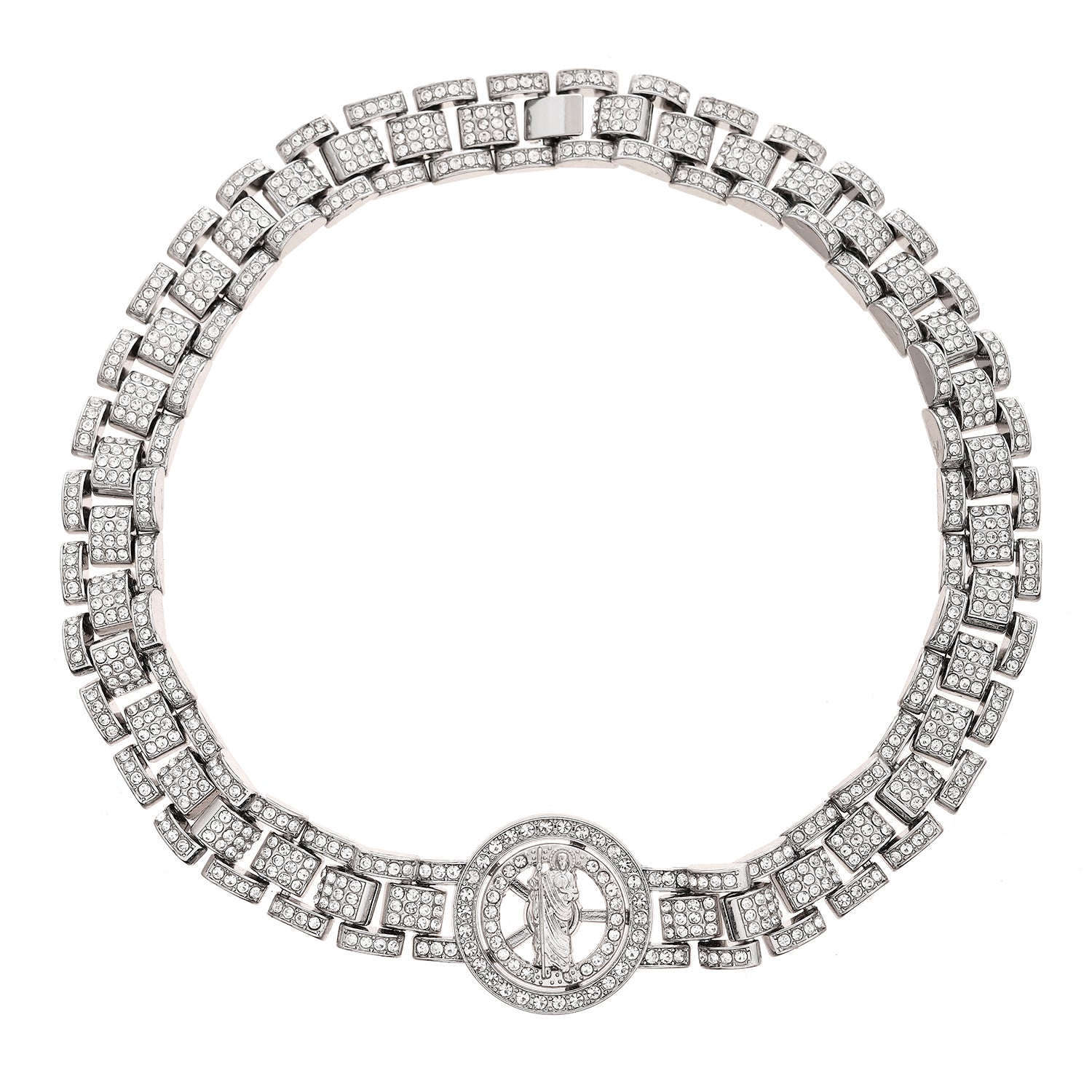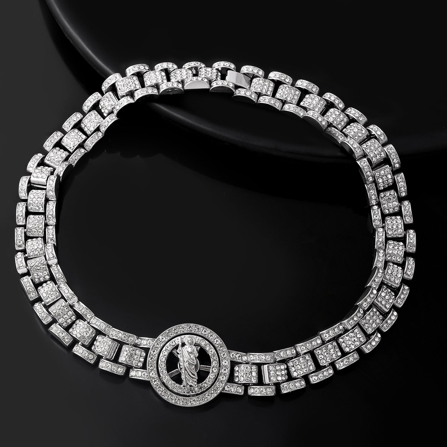 Elevate your style with this stunning Voylla Men's Necklace, meticulously crafted from high-quality alloy and adorned with a luxurious white rhodium plating. The necklace features a sophisticated design with interlocking rectangular links, each encrusted with sparkling American diamonds, creating a dazzling effect. At the center, a circular pendant showcases an intricate design, adding a touch of elegance and uniqueness to the piece. Perfect for party wear, wedding wear, or as a thoughtful gift for special occasions like Valentine�s Day, Diwali, Rakshabandhan, or as a gift for your brother, lover, boyfriend, or husband. This necklace is not just a piece of jewelry; it's a statement of style and sophistication.