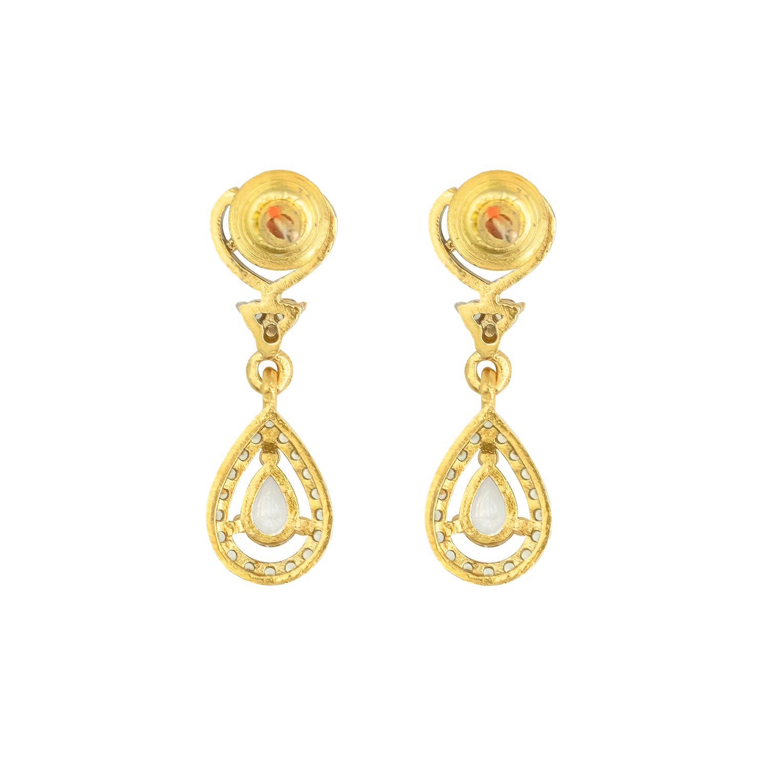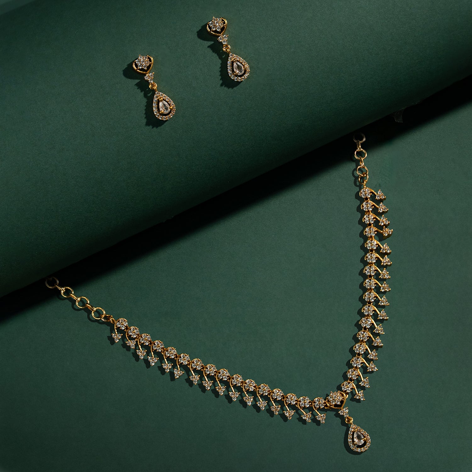 Discover the beauty of timeless tradition with the Gold Elegance Shringar Teardrop Necklace Set, a stunning necklace set for women crafted to make every celebration feel memorable. Part of our beloved Gold Elegance Collection, this piece combines classic Indian design with modern sparkle, making it the perfect choice for anyone who loves elegant ethnic jewellery. This women necklace set features a graceful arrangement of shimmering CZ (American Diamond) stones that catch the light effortlessly. The delicate teardrop pendant and matching earrings add a soft, feminine charm inspired by traditional South Indian and temple-style jewellery. Made from premium brass and finished with rich yellow gold plating, the set promises durability, long-lasting shine, and luxurious comfort. Ideal for weddings, festive celebrations, pooja rituals, and temple visits, this traditional necklace set pairs beautifully with sarees, lehengas, Anarkalis, and South Indian silk outfits. Whether you’re a bride, bridesmaid, or a guest dressing for a special occasion, the Shringar Teardrop Necklace Set adds a radiant finishing touch. Thoughtful, elegant, and meaningful, it also makes a wonderful gift for women, perfect for surprising your lover, wife, mother, sister, or best friend. With simple care, this beautiful wedding jewellery set stays bright and glowing, becoming a cherished part of any ethnic jewellery collection.