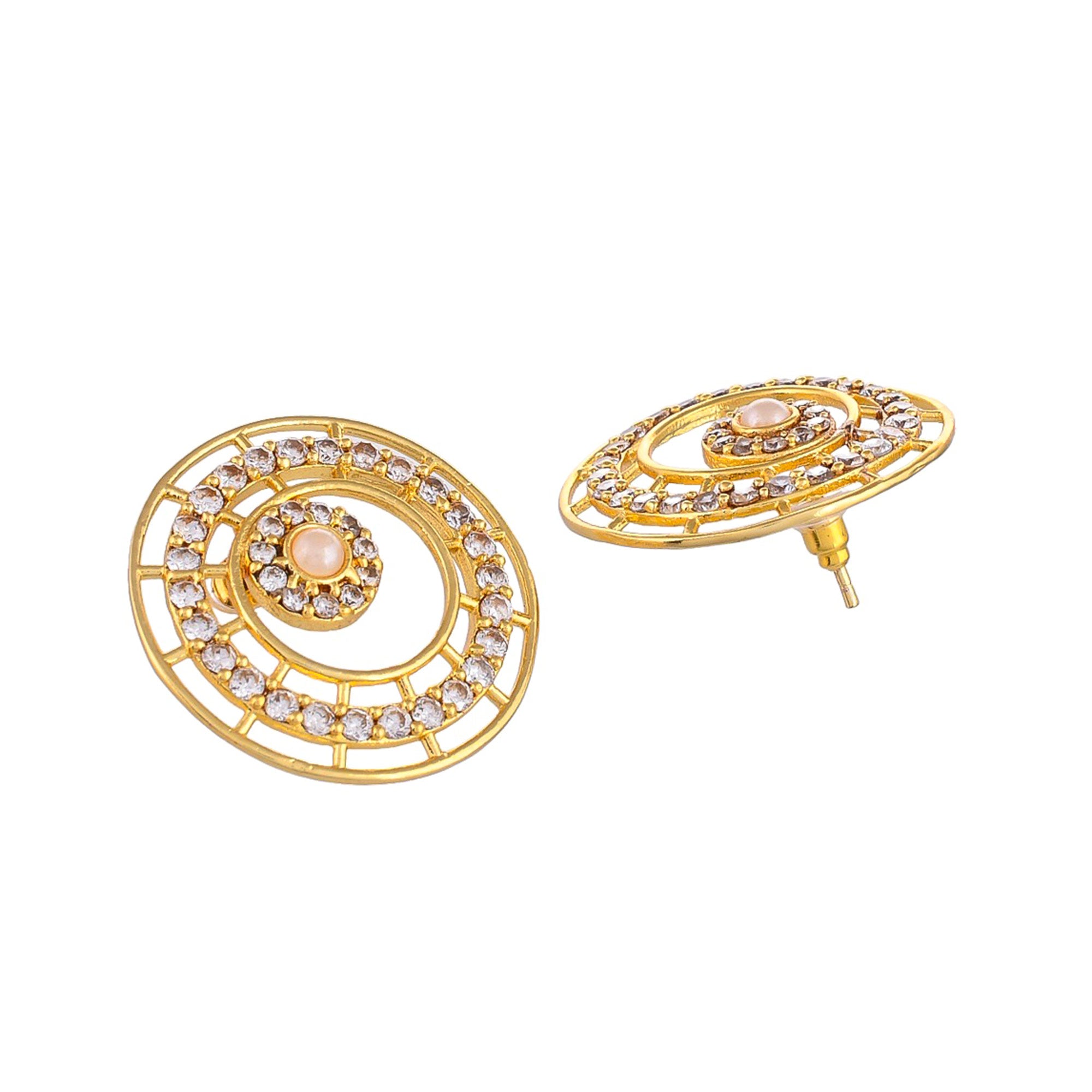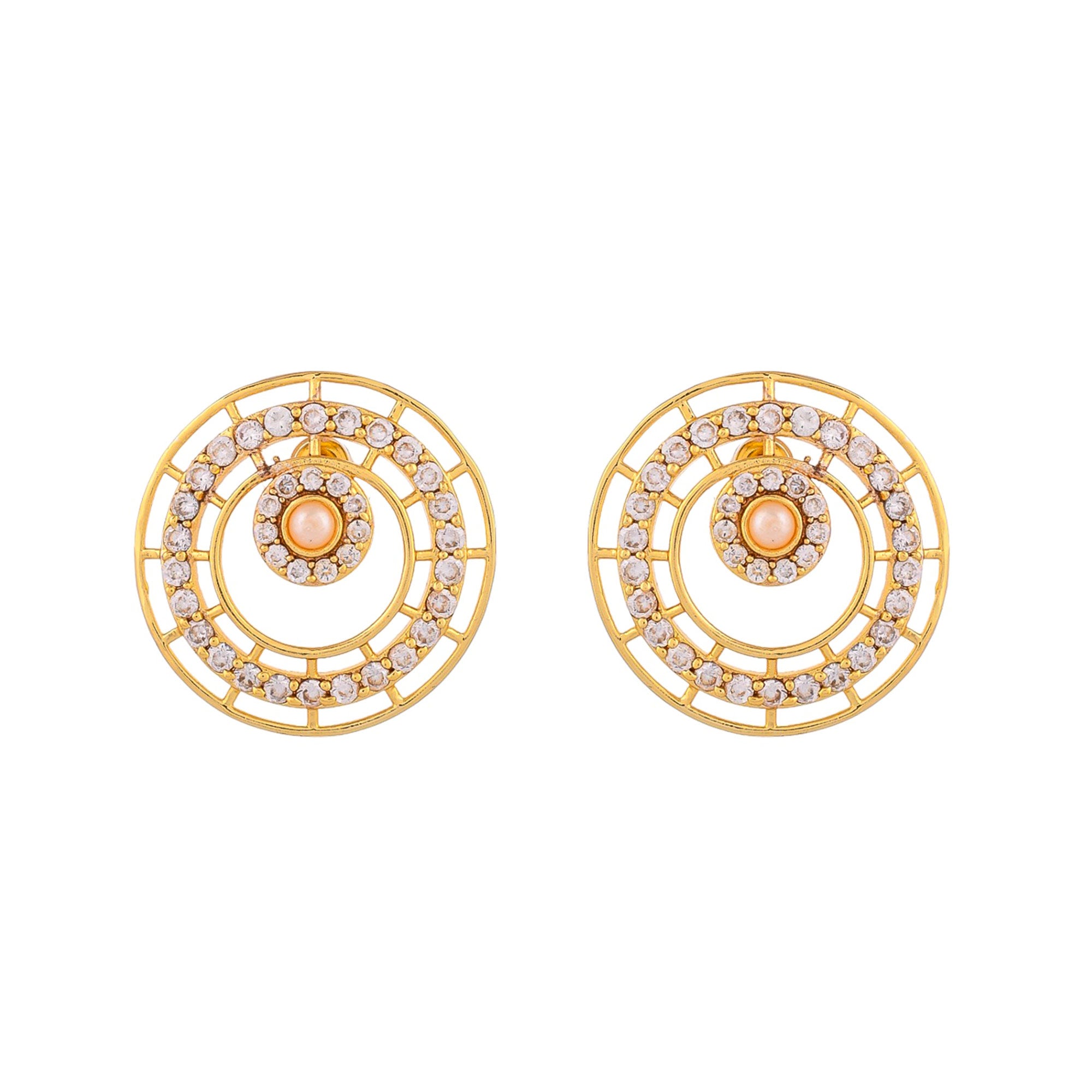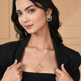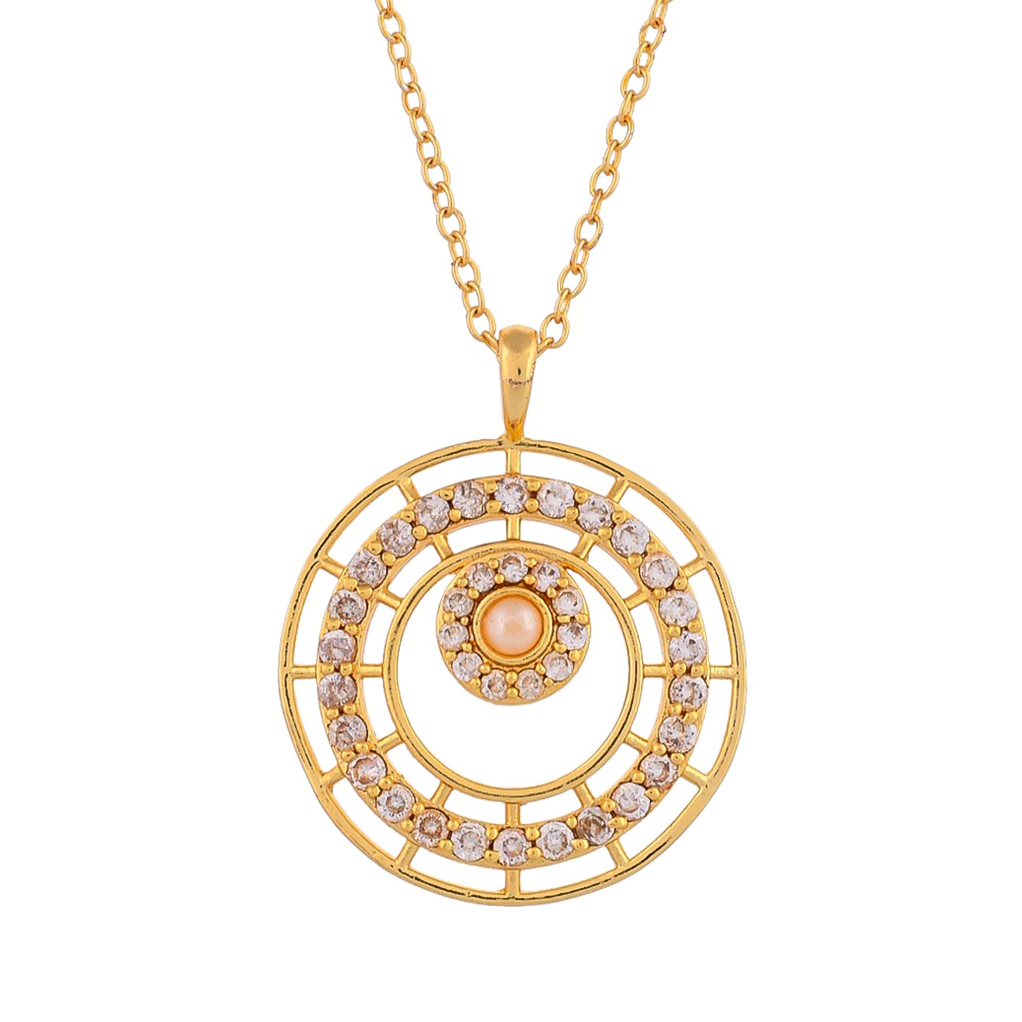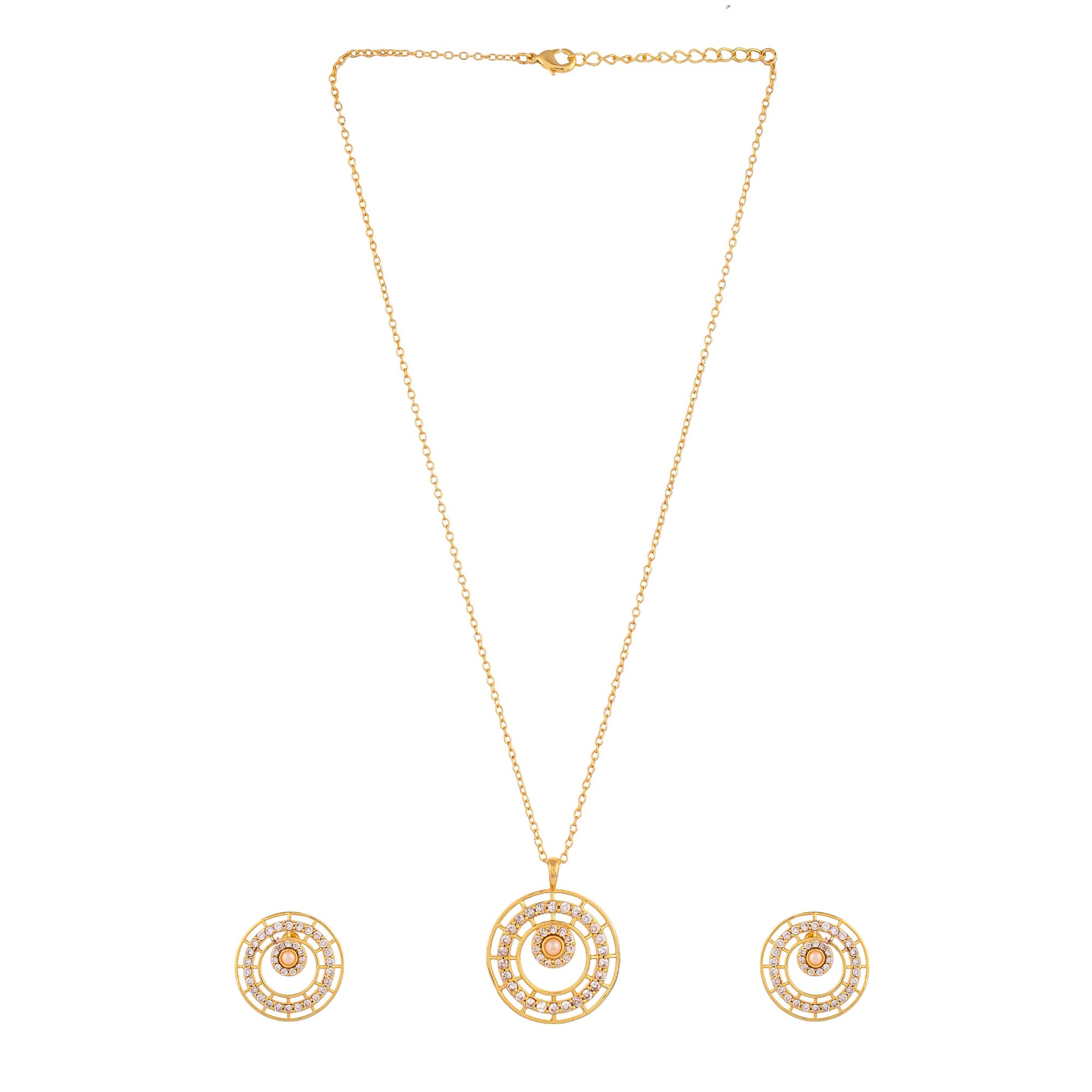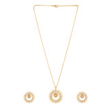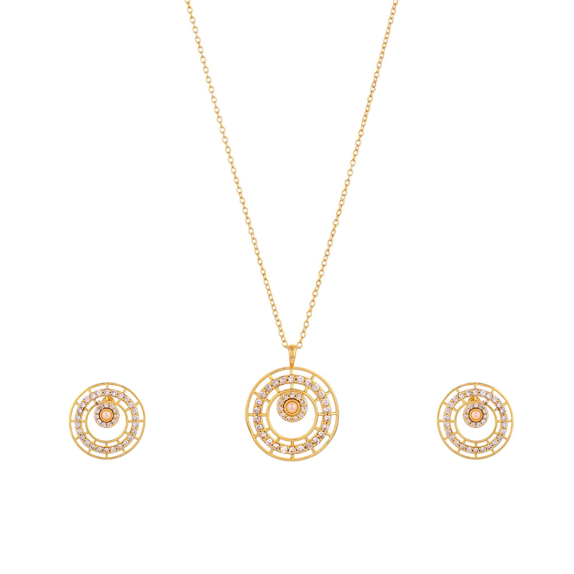 Get this exquisite pendant set for your next occasion and flaunt your jewellery to everyone. This gold plated pendant set has a round-shape detailing, which is embellished with pearl beads .