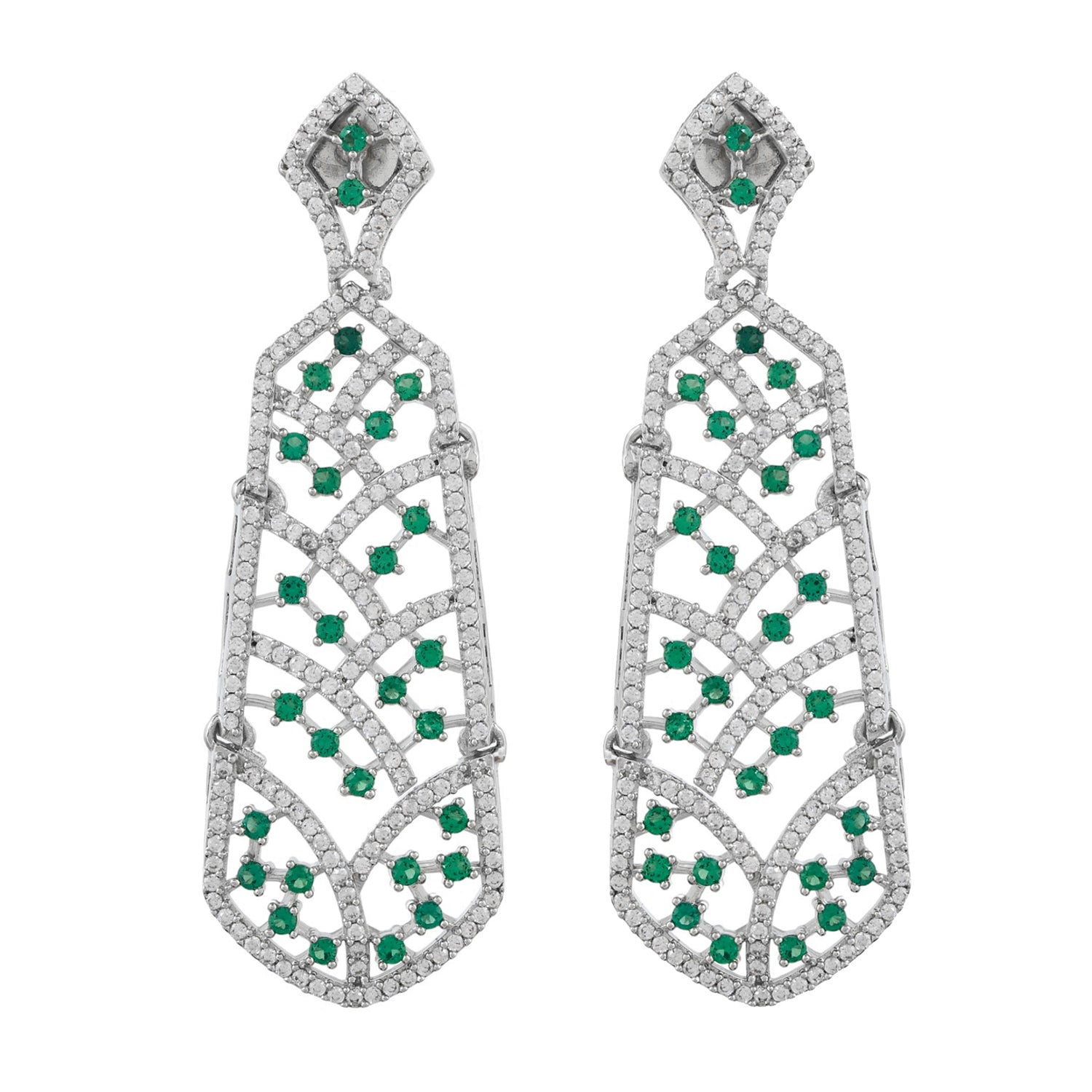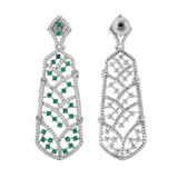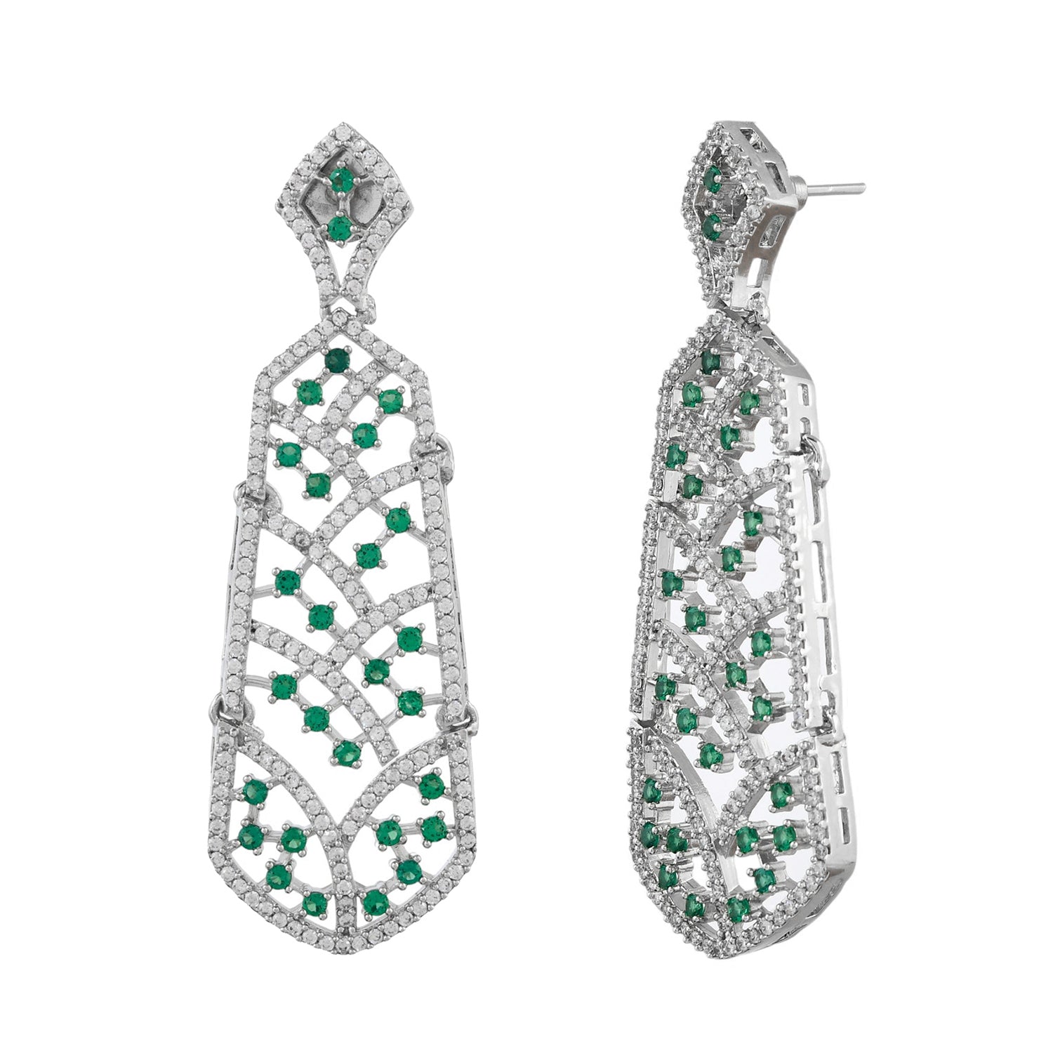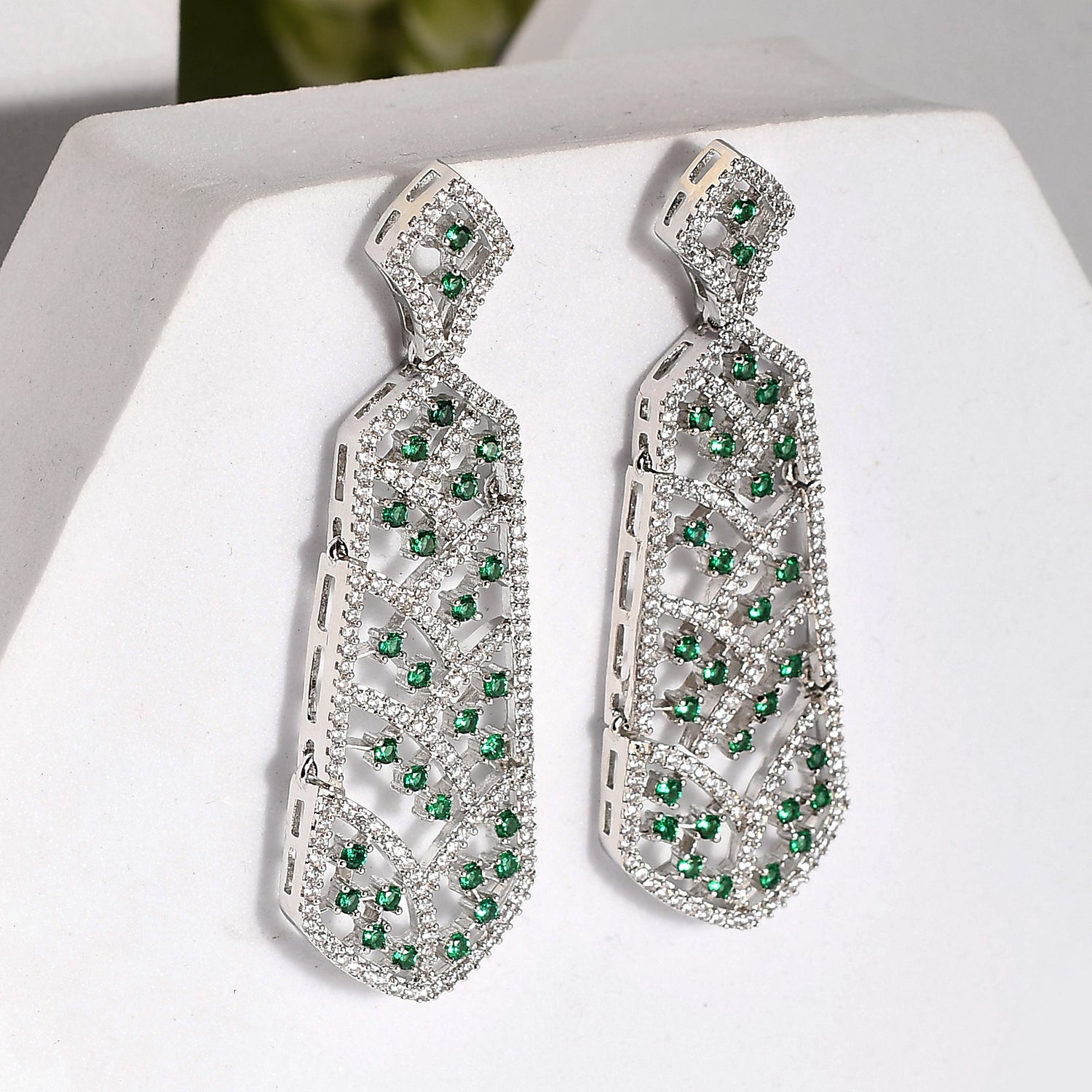 Made from high-quality brass and plated with lustrous White Rhodium, these earrings promise an enduring shine and sophisticated allure.The earrings feature a unique cascading pattern, with the top part adorned with a cluster of sparkling American Diamonds, leading to a series of delicate, interlinked segments that create a graceful, flowing effect. Vibrant green gemstone accents are strategically placed to add a pop of color and enhance the overall design, making these earrings a true work of art. The elegant length and intricate detailing make them a perfect accessory for any special occasion. Whether you’re looking for a Gift for wife, Gift for sister, Gift for Rakhi, or even a Gift for self, these American Diamond Earrings are sure to impress.