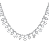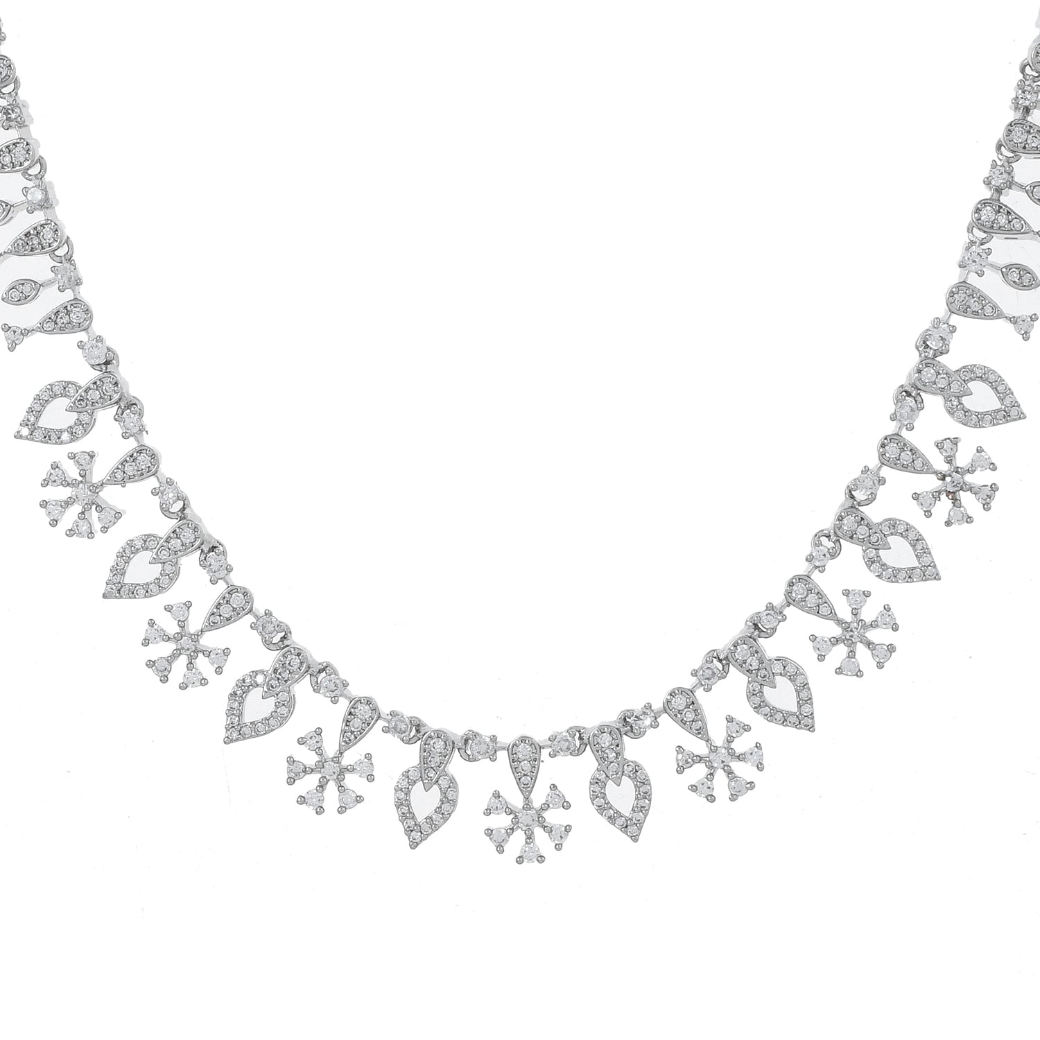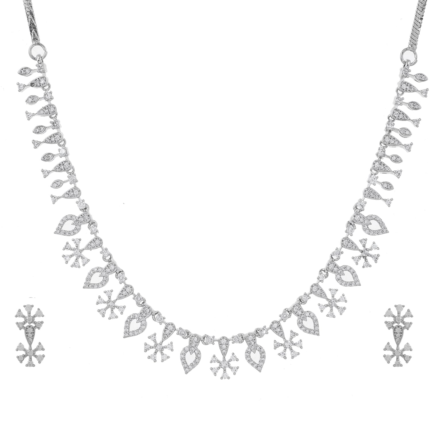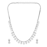 The Twilight Glam American Diamond Necklace Set is a stunning piece from the Sparkling Essentials collection, crafted with high-quality brass and plated with rhodium for a luxurious finish. This exquisite set features a beautifully intricate design with teardrop and floral motifs, encrusted with sparkling American diamonds that catch the light from every angle. Perfect for party wear, this necklace set adds a touch of glamour to any outfit, whether it's a cocktail dress, festive attire, or wedding ensemble. The shimmering silver color complements a wide range of styles and occasions, making it an ideal gift for women on special occasions such as Valentine's Day, Diwali, Rakshabandhan, Christmas, and New Year. This versatile set is a thoughtful gift for a sister, girlfriend, wife, mother, or any loved one, ensuring they feel cherished and elegant.
