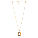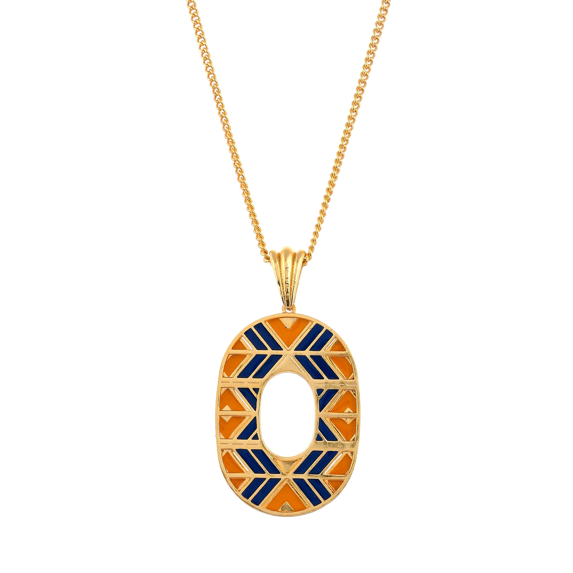 The traditional African basket art of Zulu has inspired this zig-zag pattern overlapping design pendant, which has been fashioned out of brass. Featuring colorful enamel and yellow gold plating, the pendant has been threaded into a gold plated rope chain.