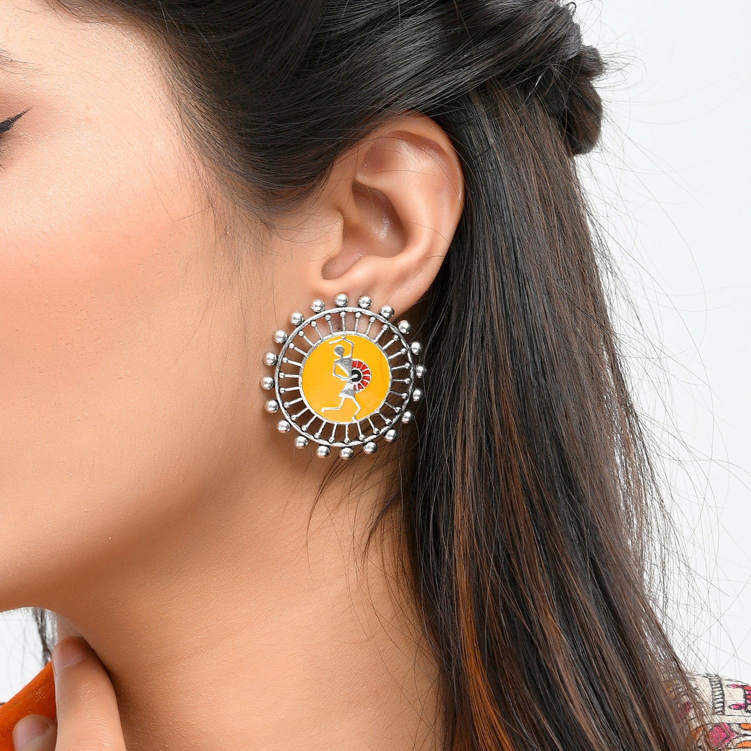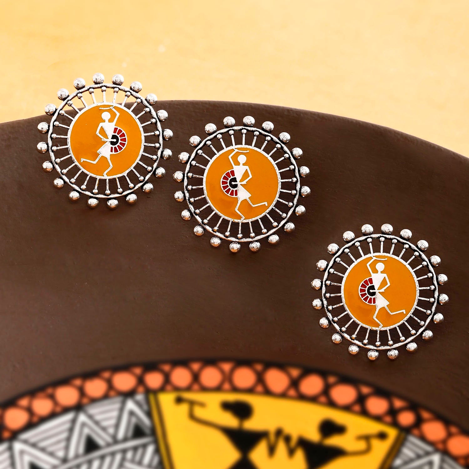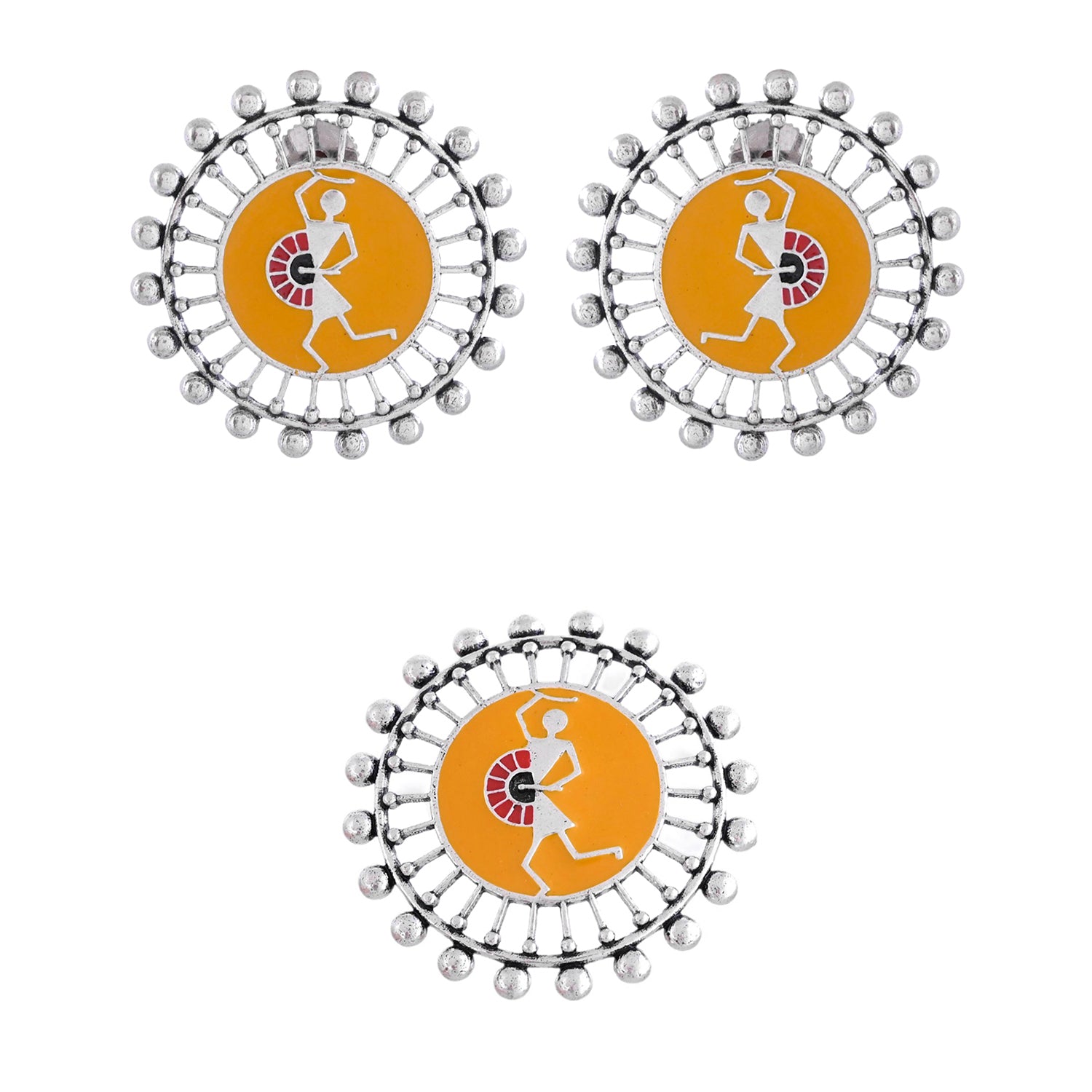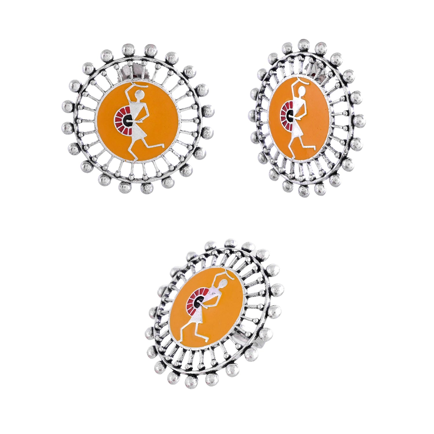 Adorned with tribal motifs and inspired by the Warli artform, this silver plated Earrings And Ring Combo has been fashioned out of brass. Orange enamel adds to the charm of this versatile piece, which is adjustable for maximum comfort.