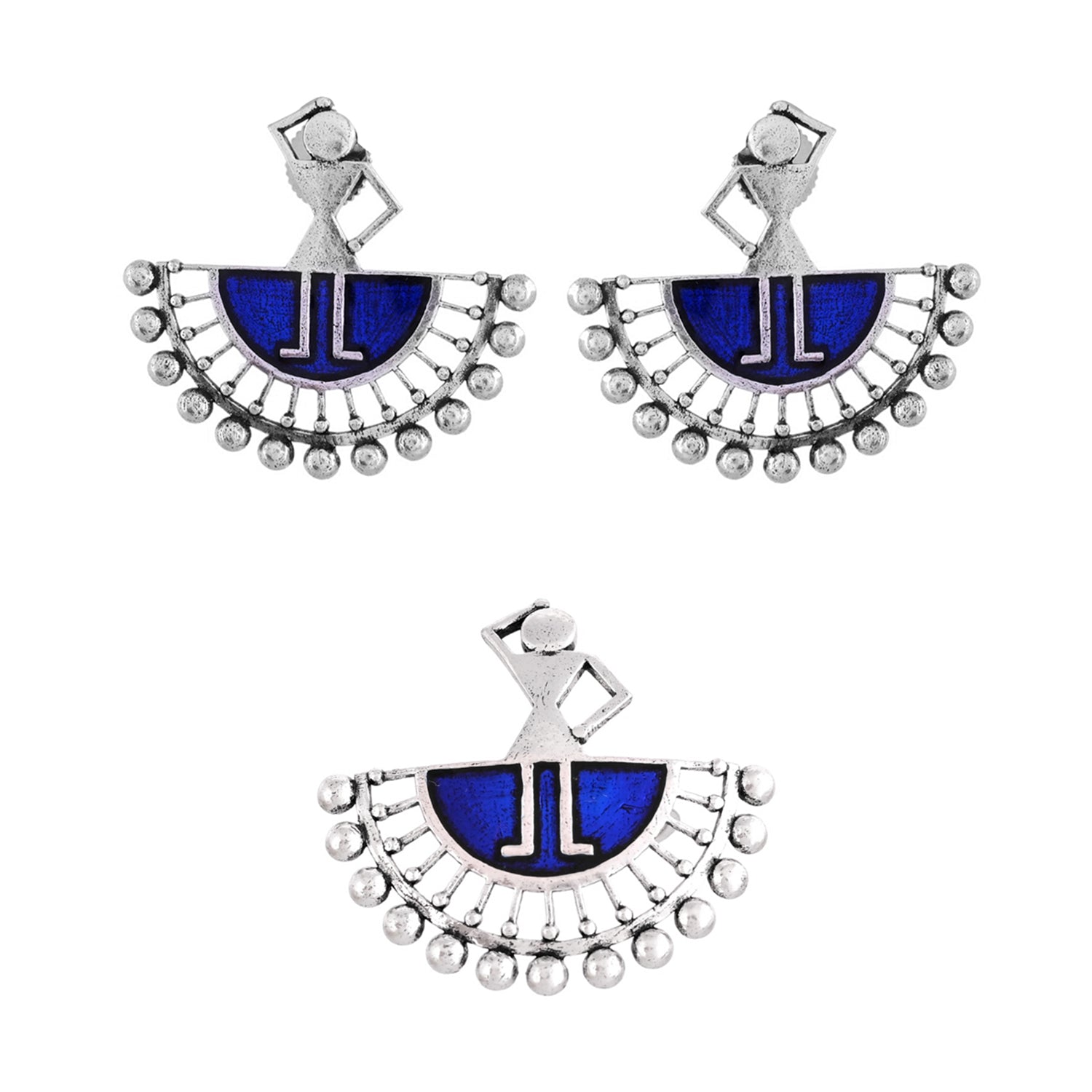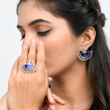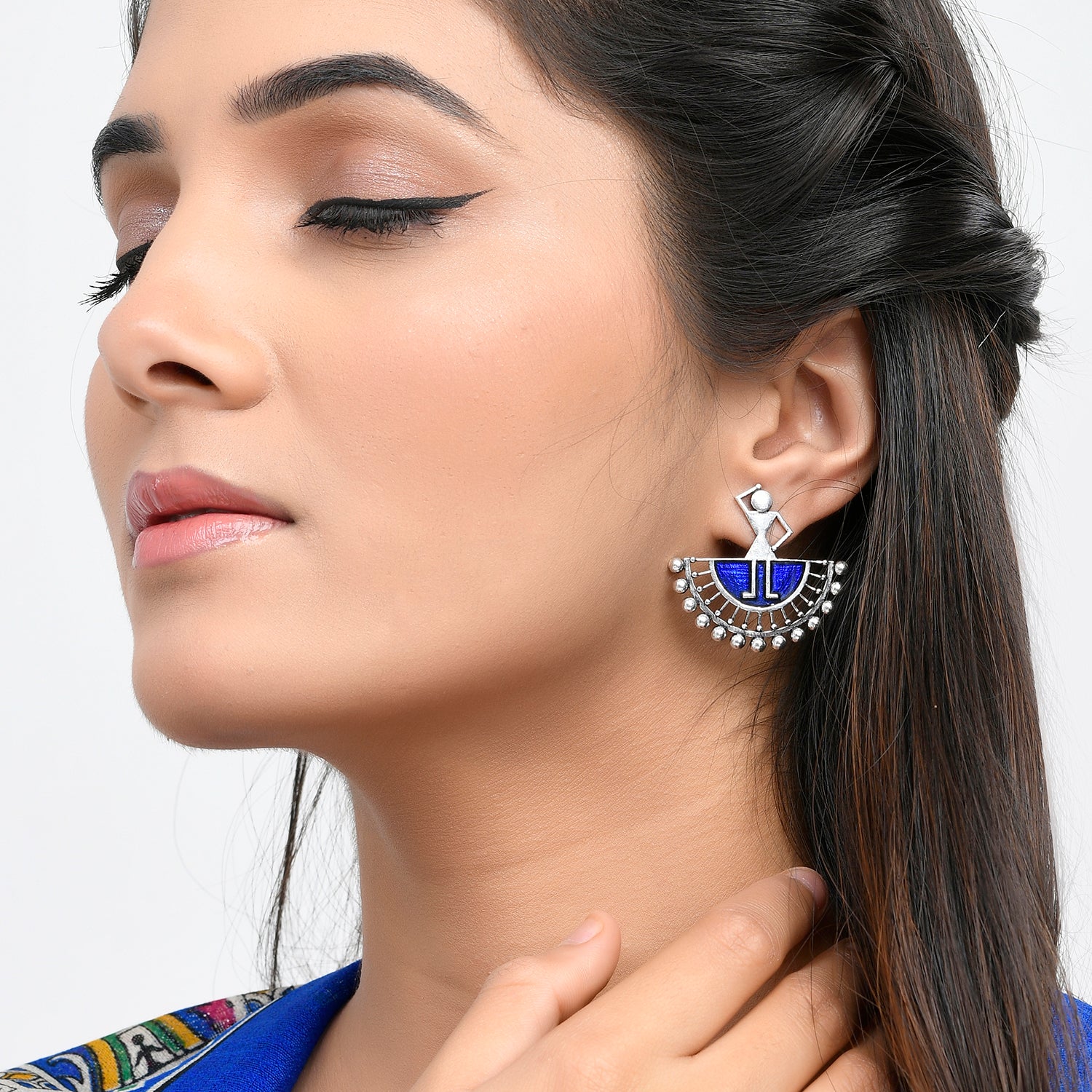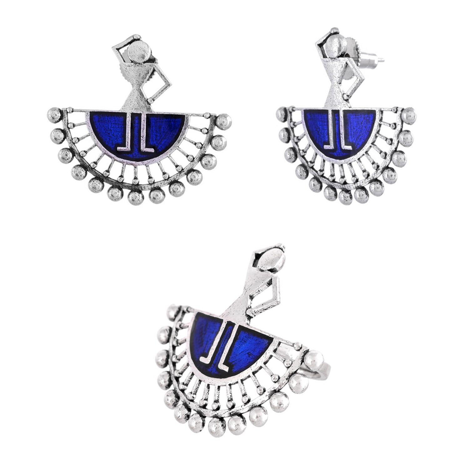 A statement Earrings And Ring Combo, designed to be the perfect Bohemian piece and inspired by the legendary Warli artform. Adjustable for maximum comfort, the silver plated ring has been crafted from high quality brass. Adorned with tribal motifs, the...