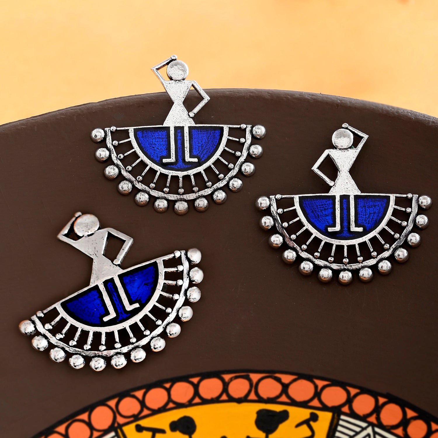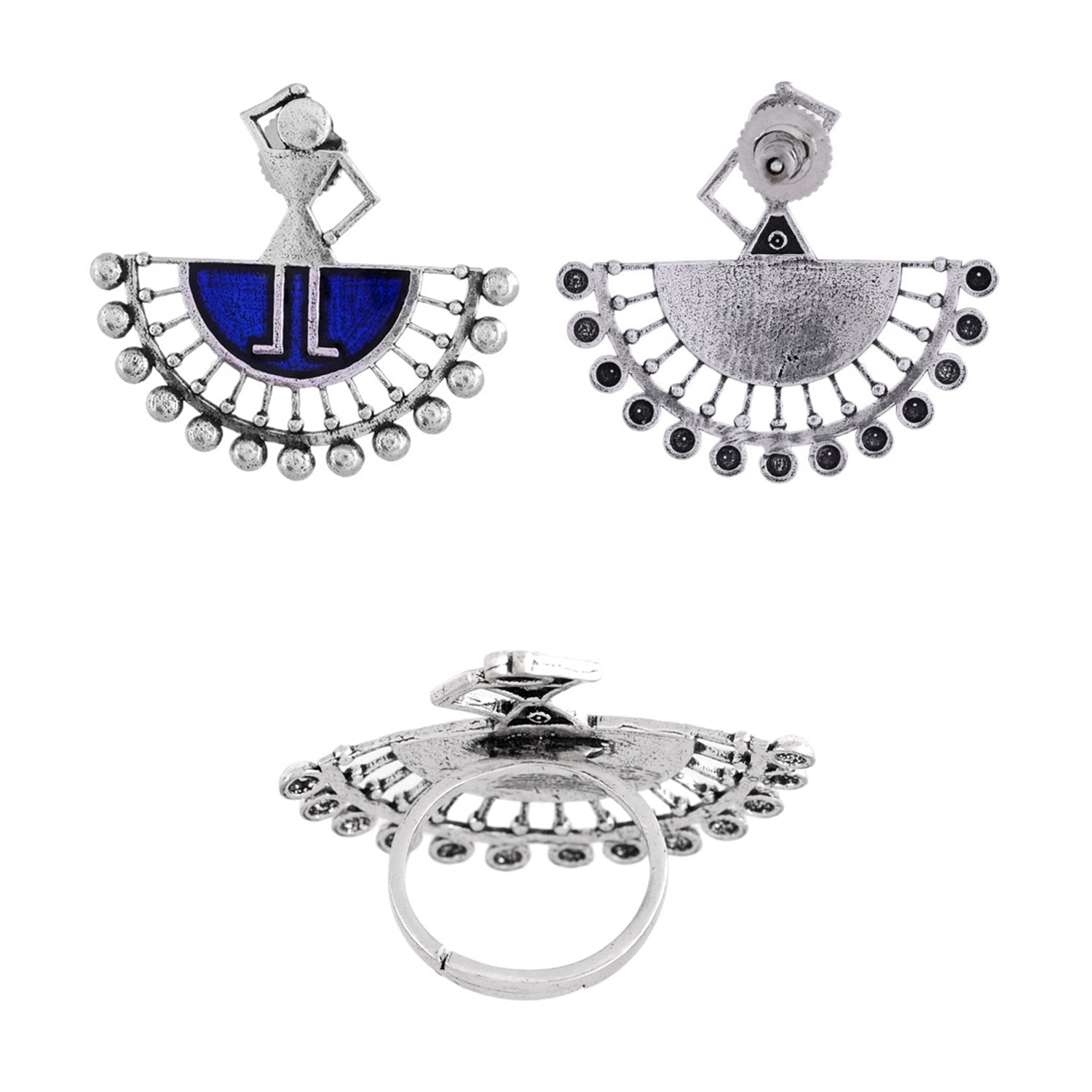 The minimalism and grace of Warli art have inspired this tribal motifs Earrings And Ring Combo, which has been crafted from brass. Silver plating adds to the rustic charm of this adjustable and comfortable ring, which is versatile and can be worn all-day long.
