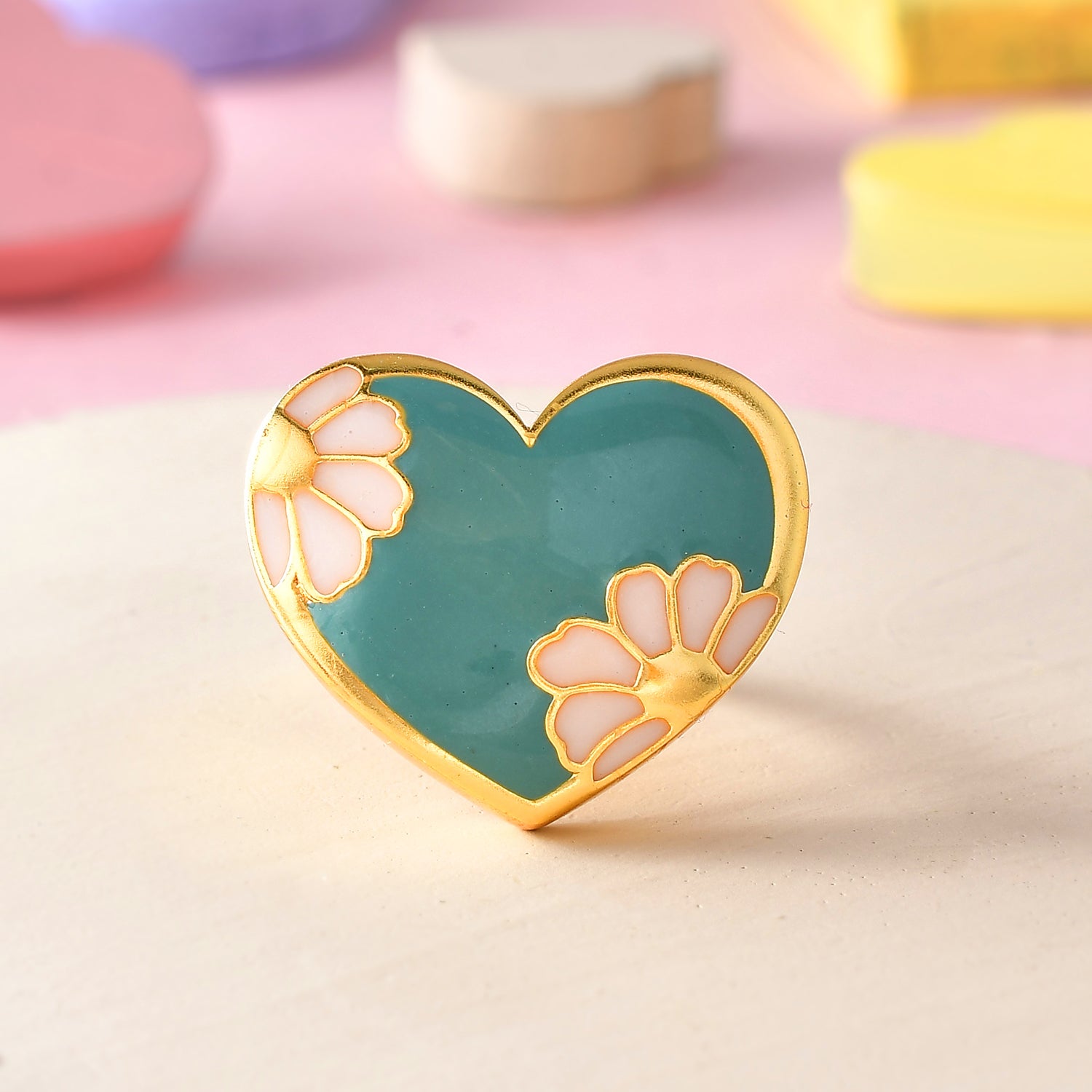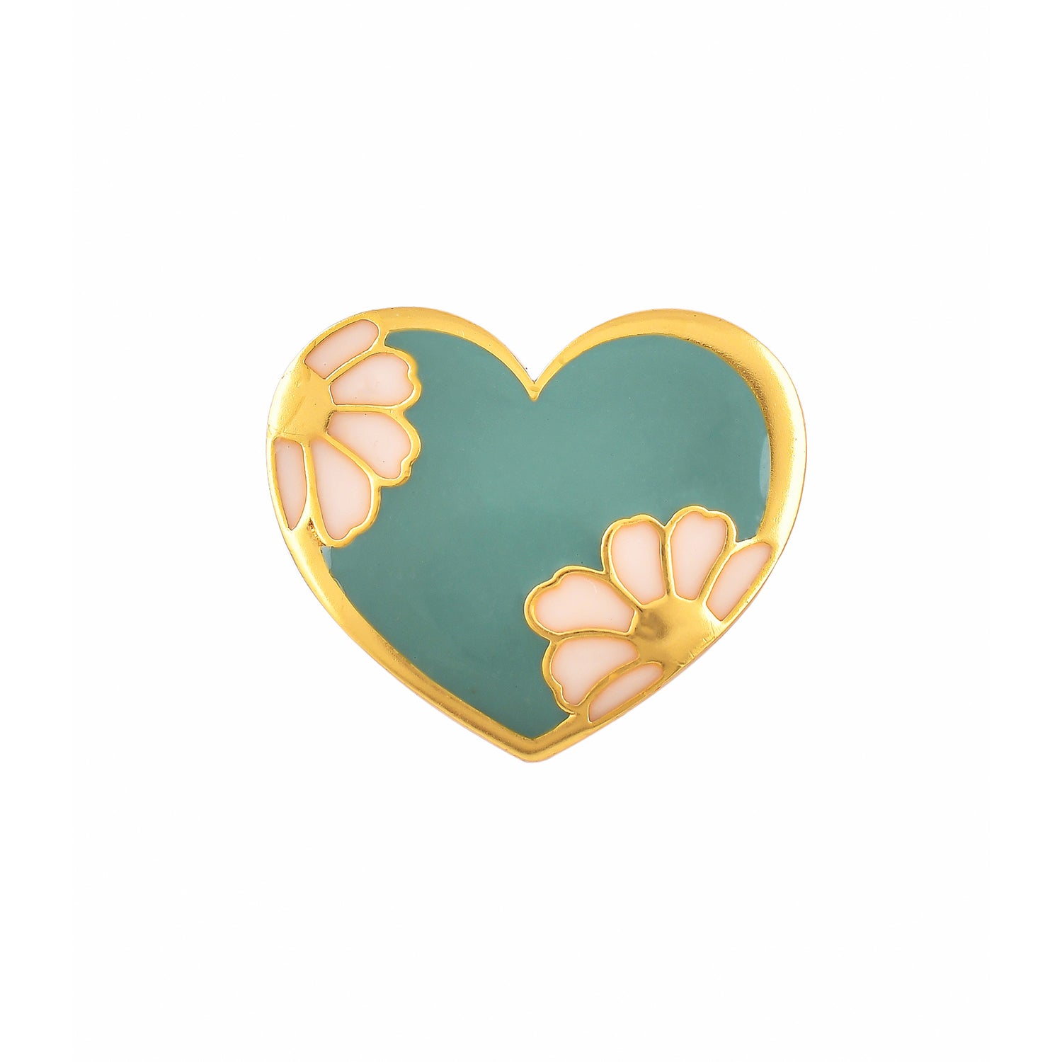 Heart shaped ring with blue enamel and floral motifs, the perfect gift to make the day of love even more special. Made from brass and gold plated, the ring has been designed for comfort and everyday wear.