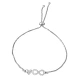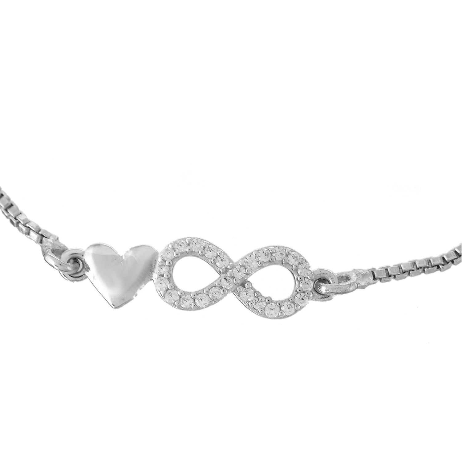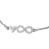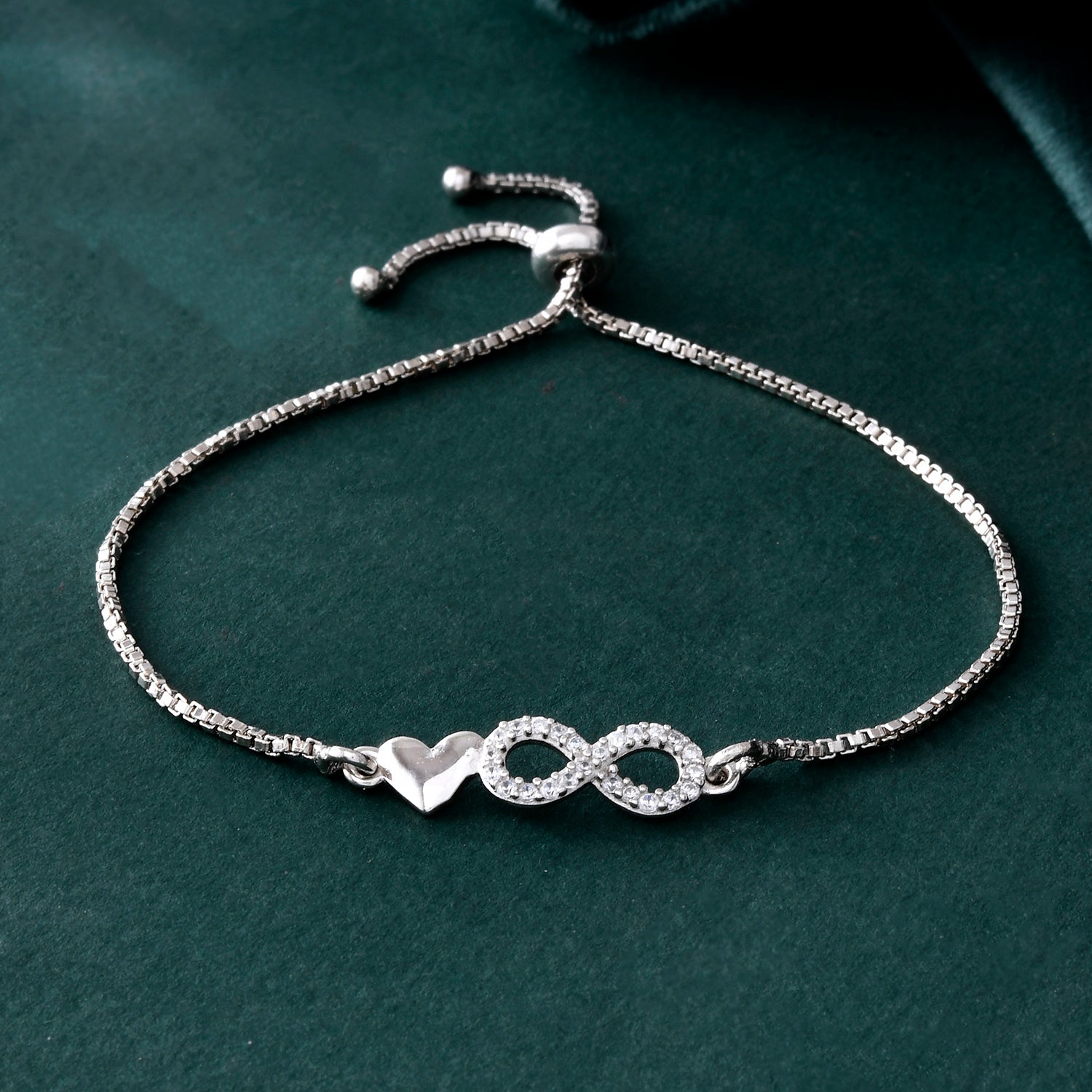 Celebrate eternal love with the Endless Love Infinity Sterling Silver Bracelet, a stunning piece from our exclusive Endless Love Collection. Crafted from high-quality sterling silver and plated with white rhodium, this bracelet features a delicate chain adorned with a heart and infinity symbol, both encrusted with sparkling stones. The dual-tone design adds a touch of elegance, making it perfect for any occasion, whether it's a festive celebration, wedding, or a romantic proposal. This versatile piece can be styled effortlessly with both casual and formal outfits, adding a sophisticated charm to your look. Its timeless design makes it an ideal gift for women, whether for Endless Love, Diwali, Rakshabandhan, Christmas, or New Year. Surprise your loved one's be it your girlfriend, wife, mother, or sister's with this exquisite bracelet that symbolizes infinite love and commitment.