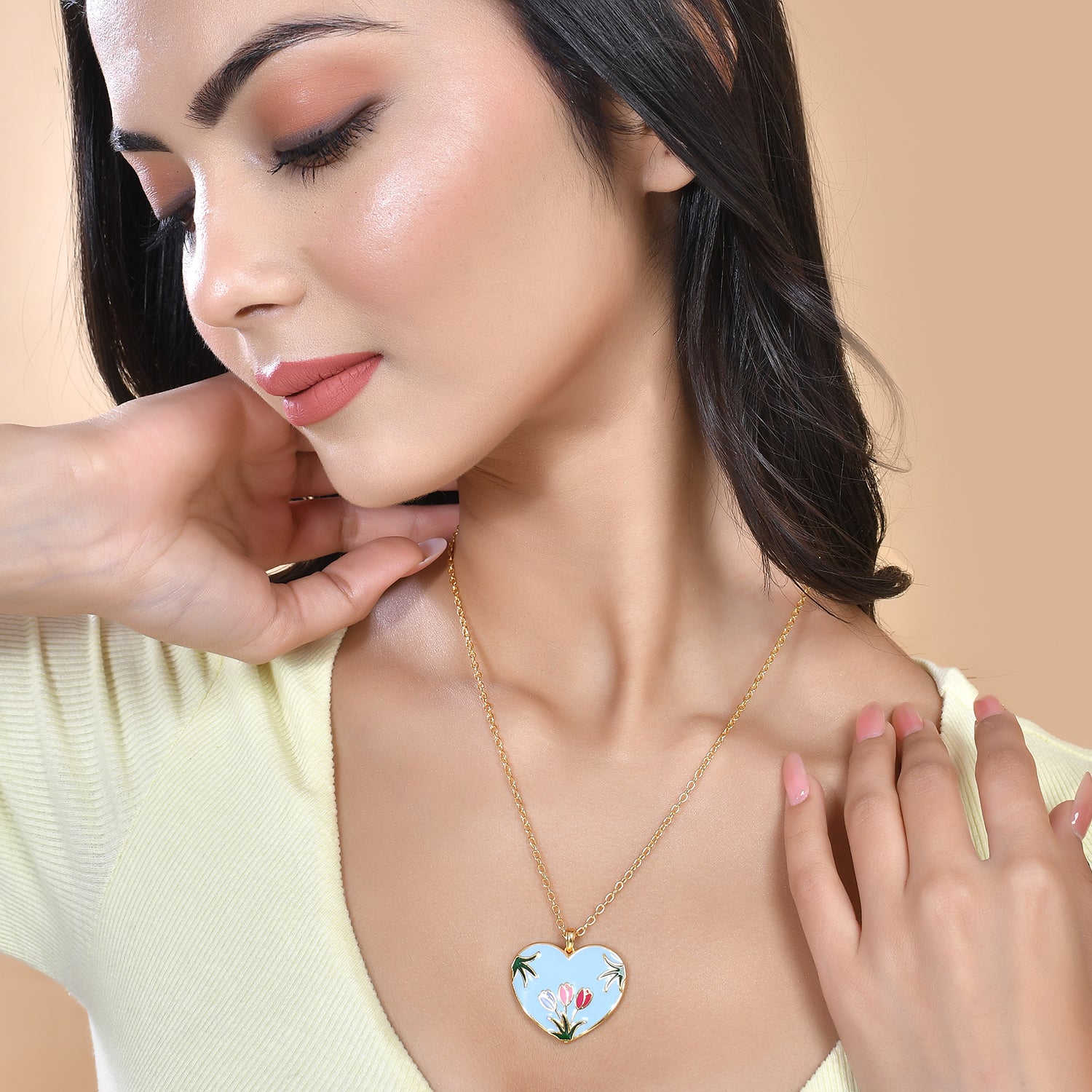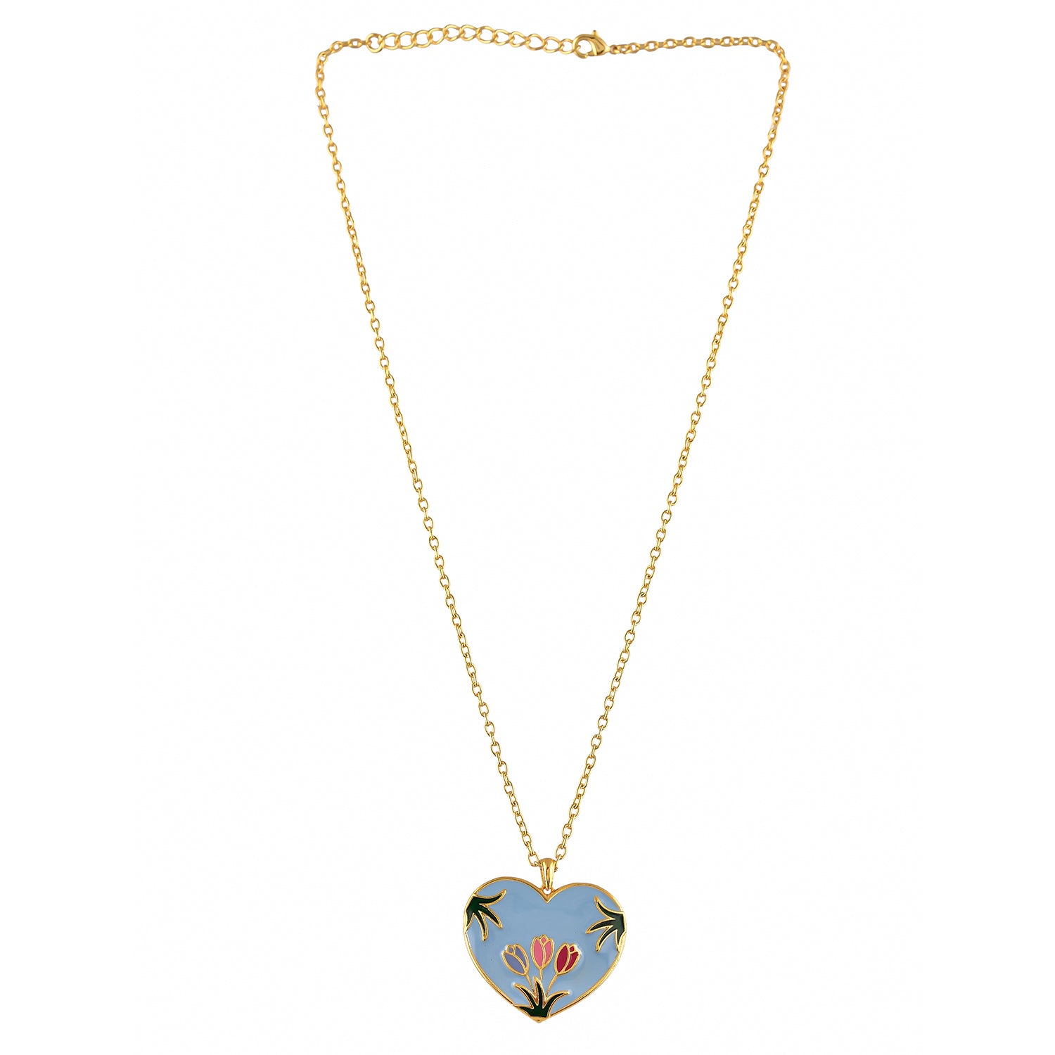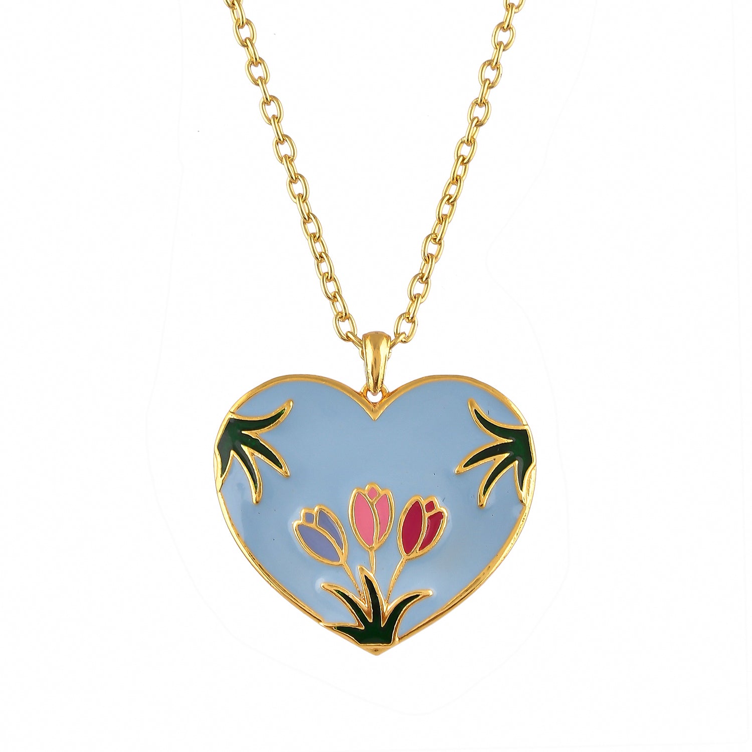 Light blue enamel heart shaped pendant with floral motifs, designed to be the perfect Valentine's Day gift. Made from brass and gold plated, the pendant comes with a link chain and can be paired with just about everything.