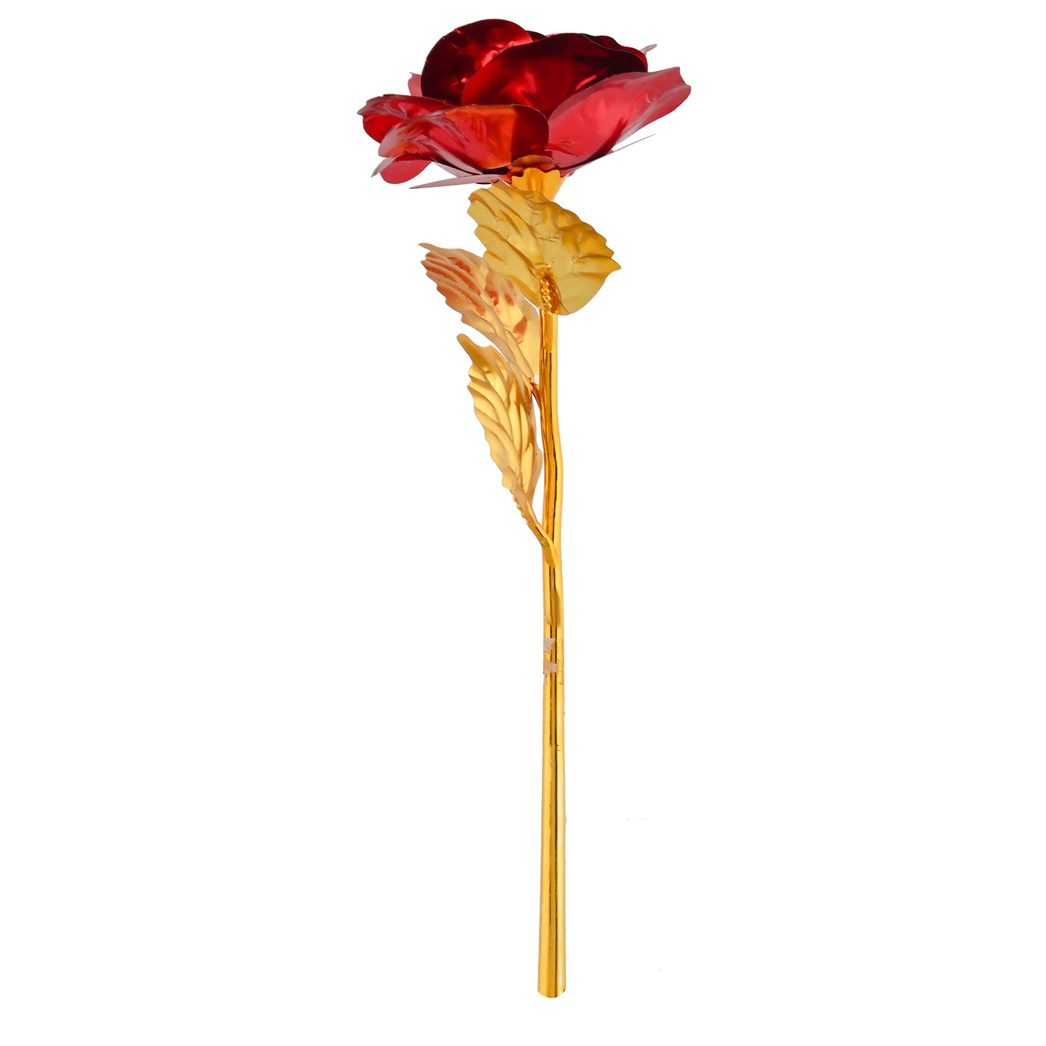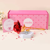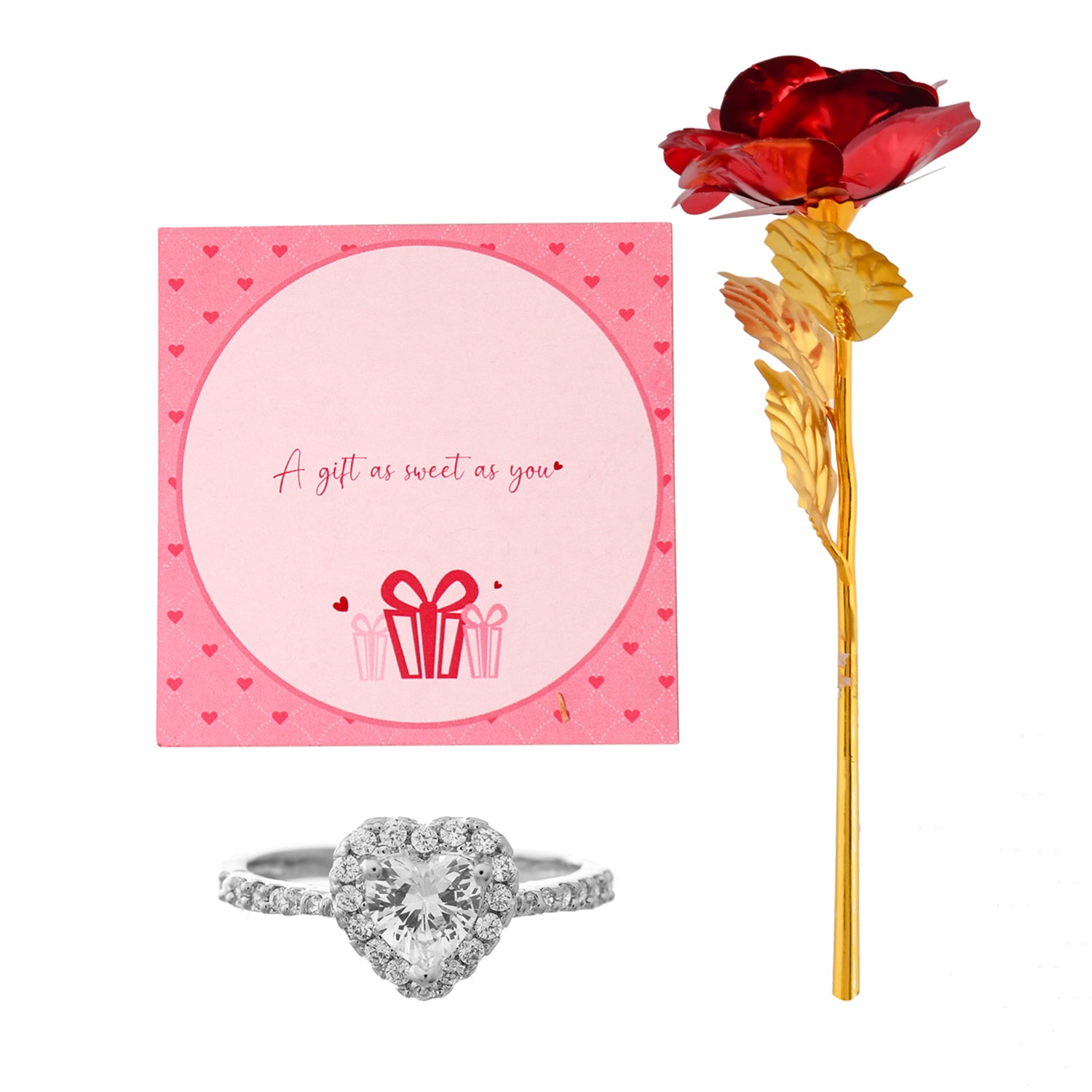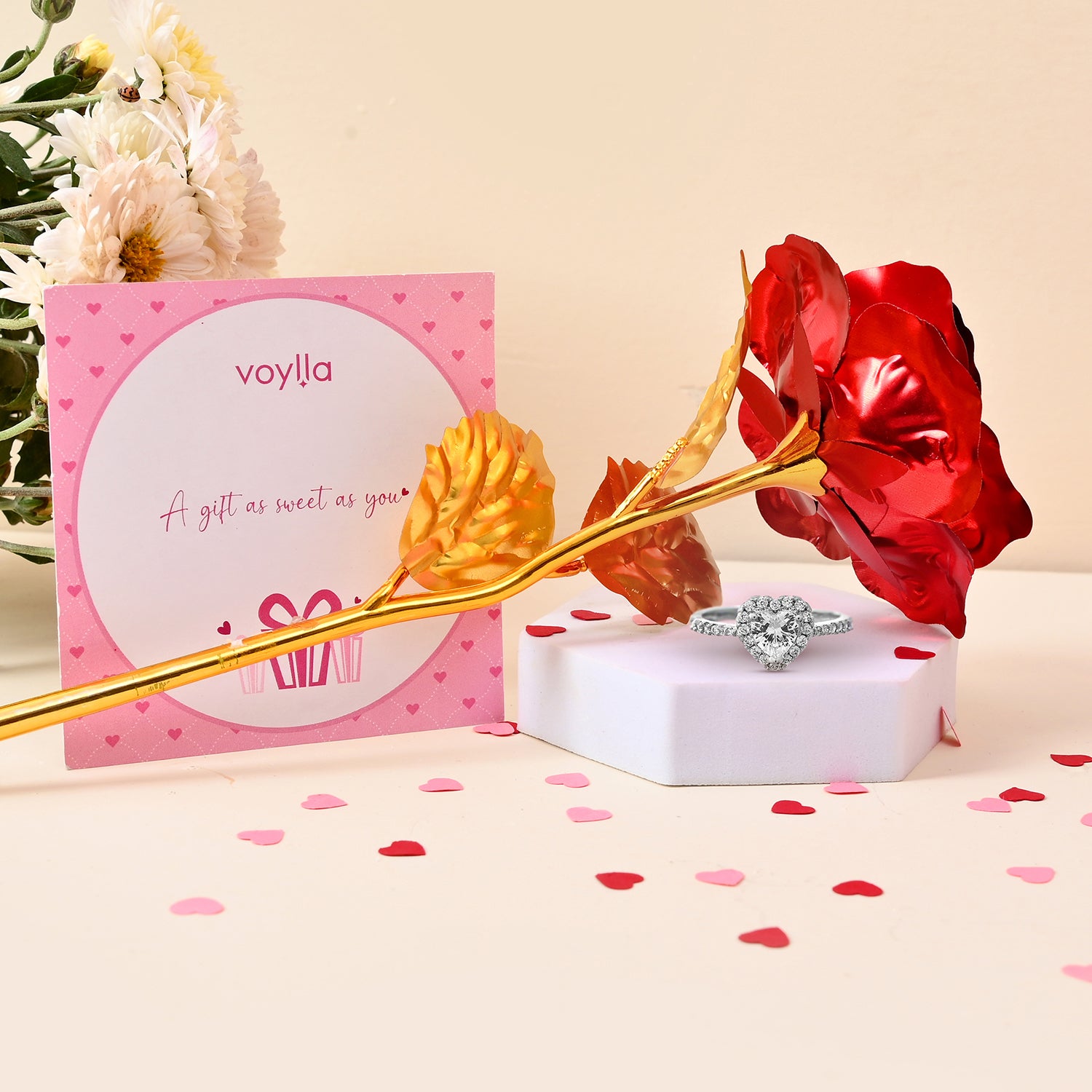The Blossoms of Love Valentine Hamper is an exquisite women's Valentine's gift, perfect for expressing your love and appreciation. This beautiful collection features a stunning ring adorned with American diamond stones, a luxurious metallic rose with vibrant red petals and a golden stem, and a delicately designed card with a heartfelt message. The high-quality materials and intricate craftsmanship ensure durability and lasting beauty, making this hamper a treasured keepsake. Ideal for gifting to a girlfriend, wife, or lover, this hamper is a thoughtful and romantic gesture for Valentine's Day or any special occasion. The ring adds a touch of glamour to any outfit, making it perfect for party wear or festive celebrations. The vibrant colors and elegant design of the metallic rose and card add a timeless beauty to the collection. With this thoughtfully curated set, you can be sure to make a lasting impression on your loved one.