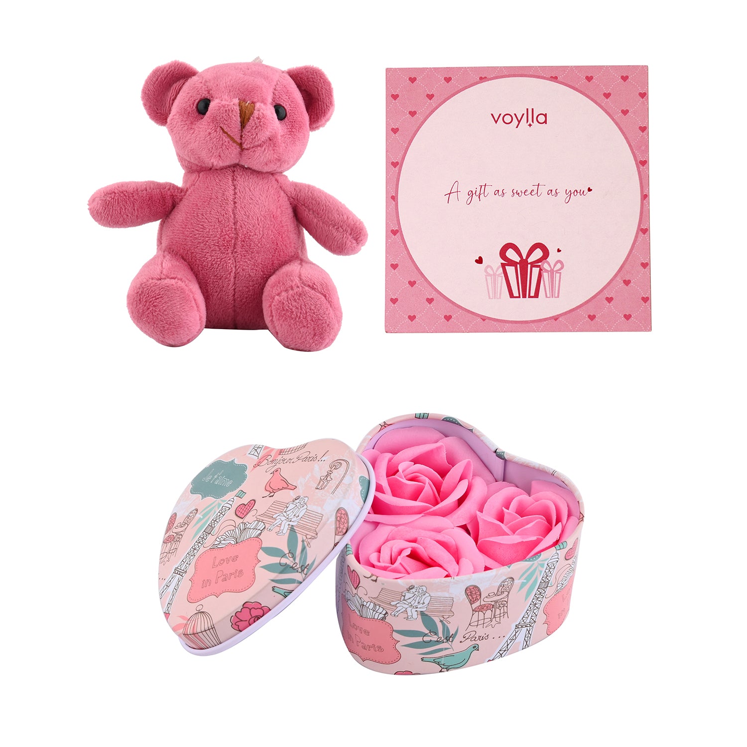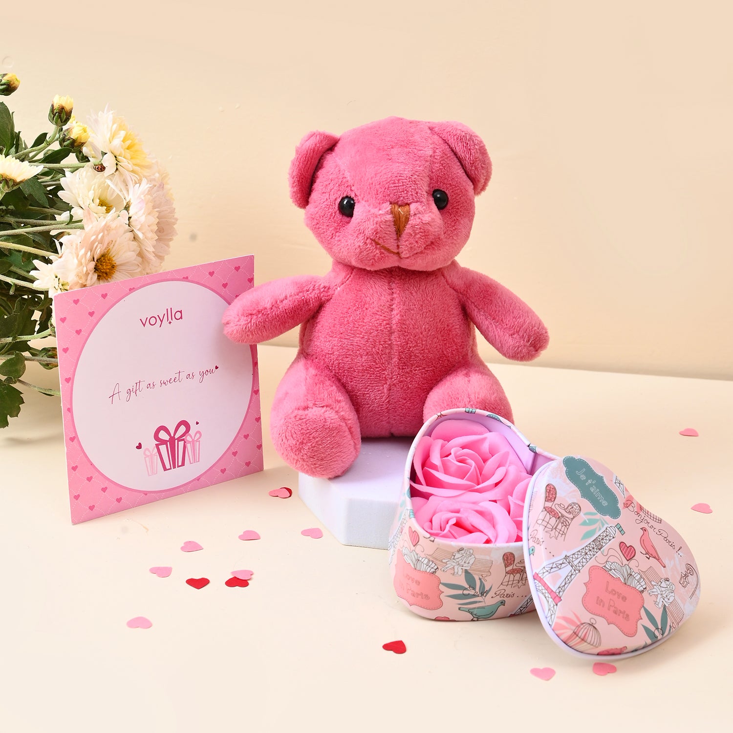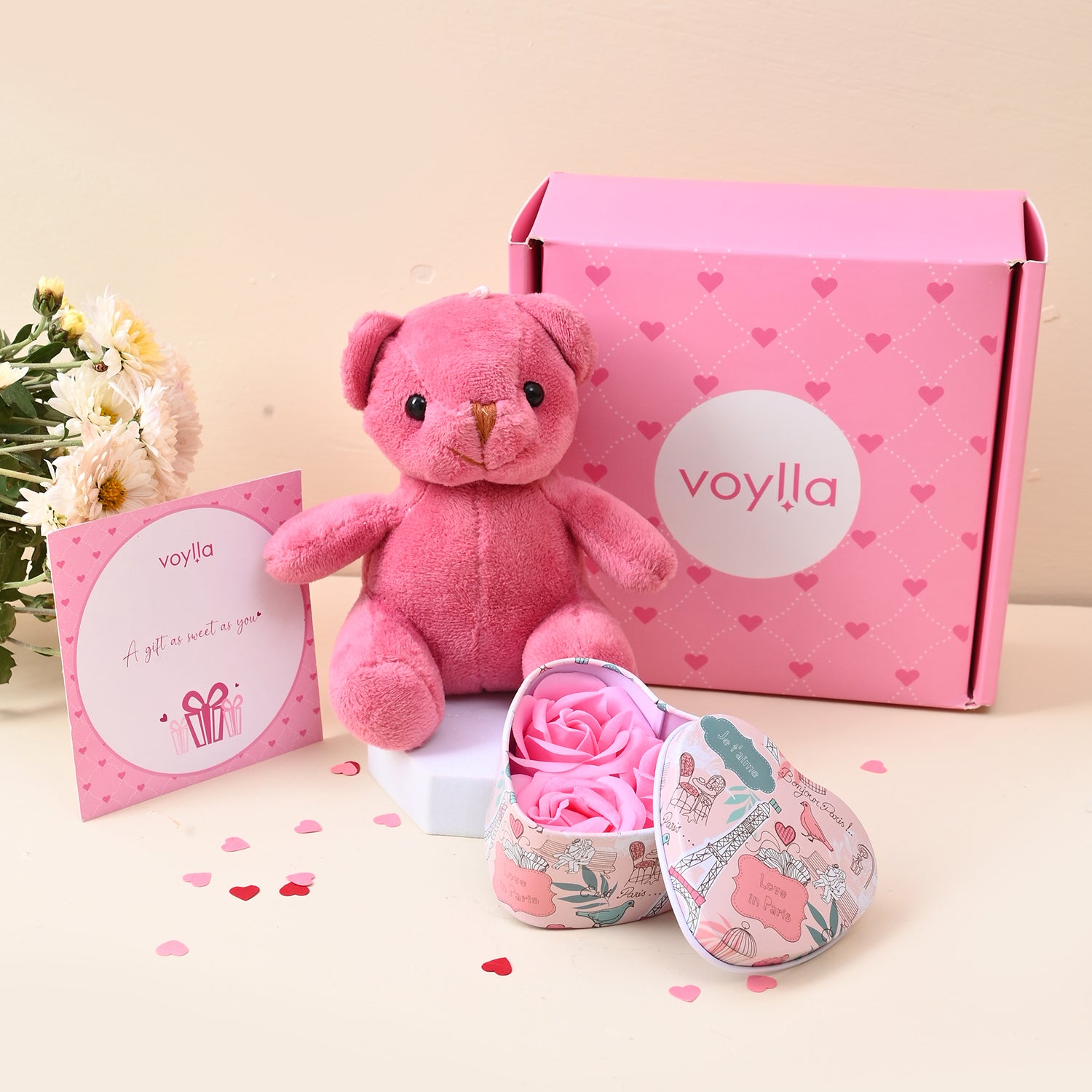 Introducing the Lovey Dovey Combo Valentine Hamper, the ultimate women's Valentine's gift that will melt hearts and create lasting memories. This delightful collection includes a cuddly pink teddy bear, a heart-shaped box filled with delicate pink rose soaps, and a card that reads "A gift as sweet as you." Designed with meticulous attention to detail, this hamper exudes quality and elegance, making it an ideal gift for women, whether it's for your girlfriend, wife, or lover. The soft and plush teddy bear offers comfort and affection, while the rose box adds a touch of sophistication with its romantic Paris-themed illustrations. The card, featuring a heartfelt message, completes the set, making it a thoughtful and memorable gift. With a romantic pink color scheme, this combo is perfect for Valentine's Day, anniversaries, or any special occasion. Whether you're looking for ideas for Valentine's Day gifts or simply want to surprise your loved one, this hamper is sure to leave a lasting impression. Perfectly paired with Stone Earrings, PARTY WEAR Earrings, and other festive accessories, this Valentine's gift is a true celebration of love and appreciation.