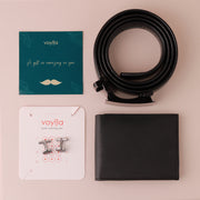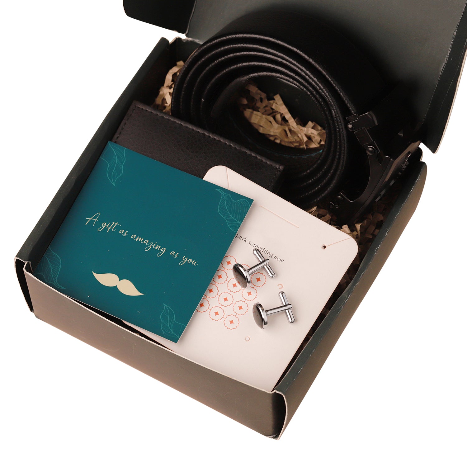 Make him feel truly special this Valentine’s Day with our meticulously curated Valentine Hamper, which includes a stylish black belt, a sleek black wallet, a pair of elegant cufflinks, and a charming card. The belt is crafted from high-quality materials, showcasing its smooth texture and modern buckle design, ensuring both style and durability. The wallet, made from premium leather, is simple yet sophisticated, perfect for everyday use with ample space for cards and cash. The elegant cufflinks add a touch of class to any outfit, making them suitable for both formal and casual occasions. The charming card, with its heartfelt message "A gift as amazing as you," adds a personal touch to this thoughtful gift set. This hamper is the ideal choice for making your loved one feel appreciated and special on Valentine’s Day.