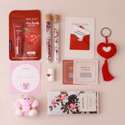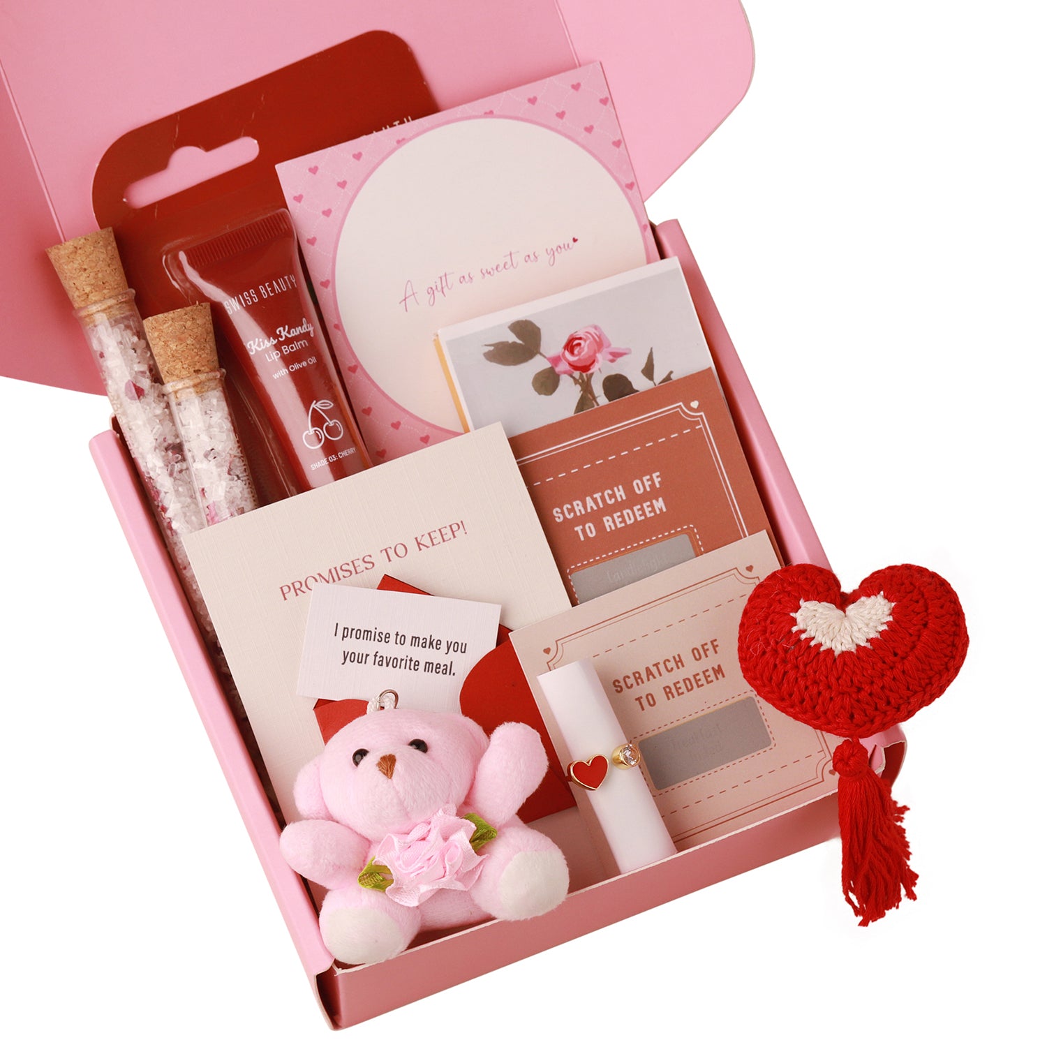 • Sales Package: 1 Teddy Key Chain ,White Rose Chocolate Bar,Rose Bath Salt,Promise Notes in Enevelope,Coupon Code for unlimited Hug and Kisses,Swiss Beauty Kiss Kandy Lip balm,1 Ring,1 Crochet Heart ,1 Card,1 Gift Box