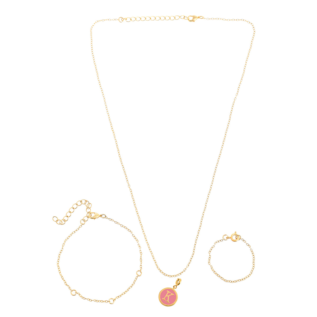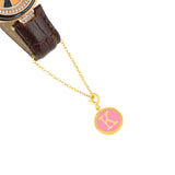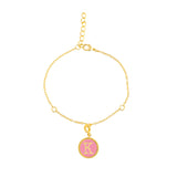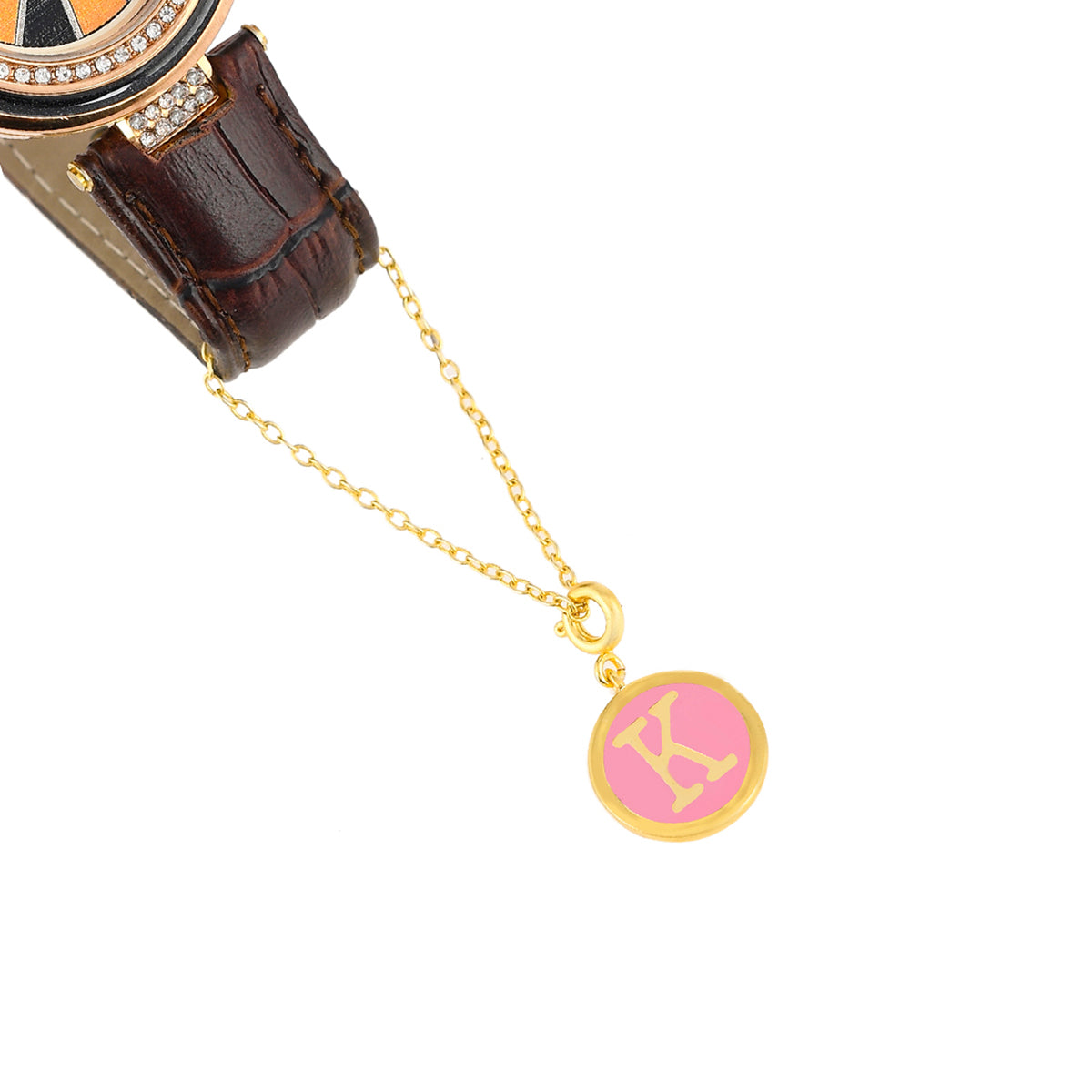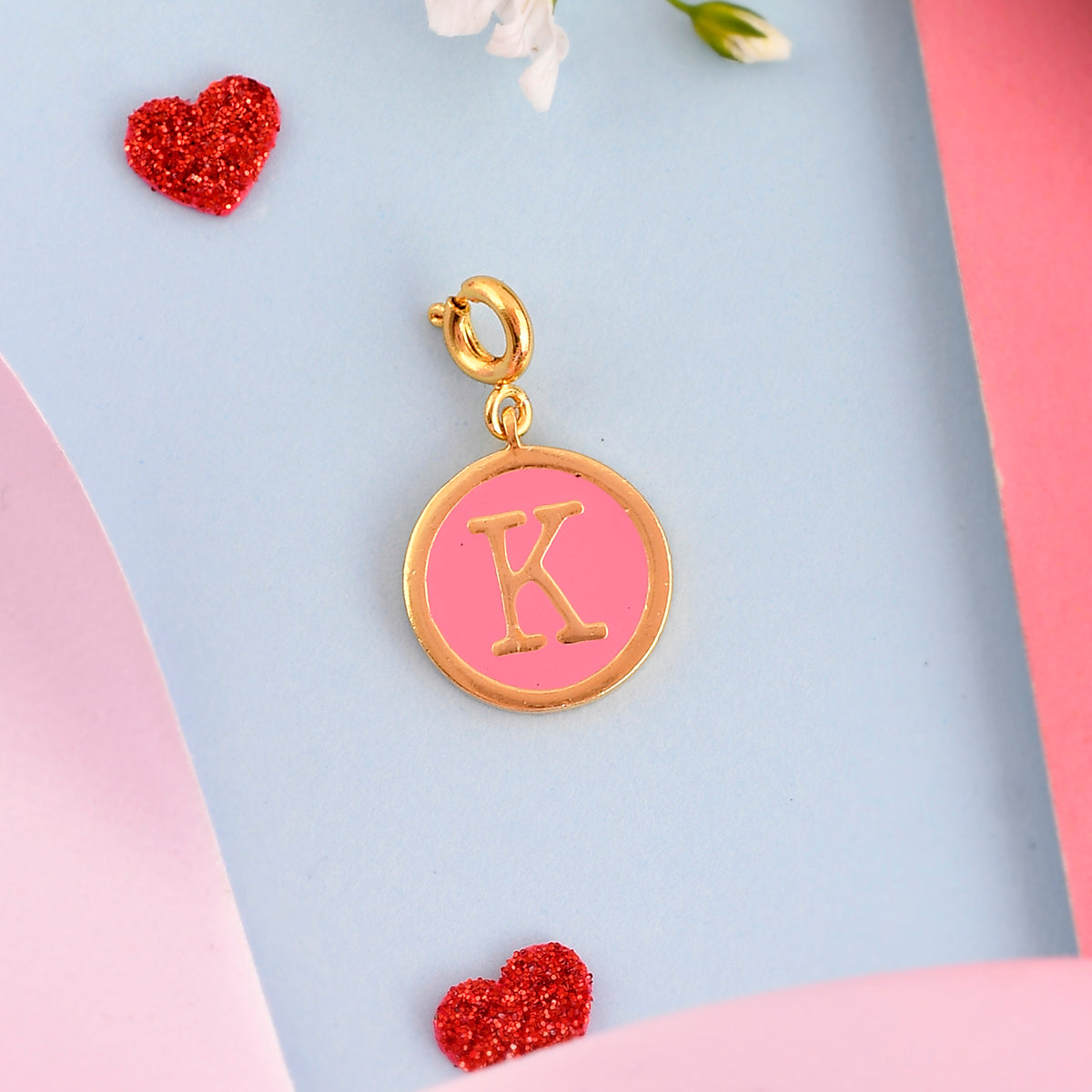 Alphabet K charm with pink enamel details. Made from brass and gold plated. A good gifting option and can be paired with watches and bracelets