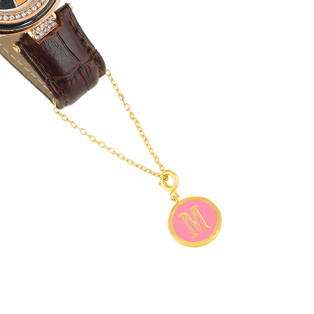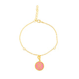 Pink enamel details alphabet M charm, fashioned out of brass. The gold plated charm is lightweight, comfortable and versatile enough to be paired with all kinds of bracelets and watches.