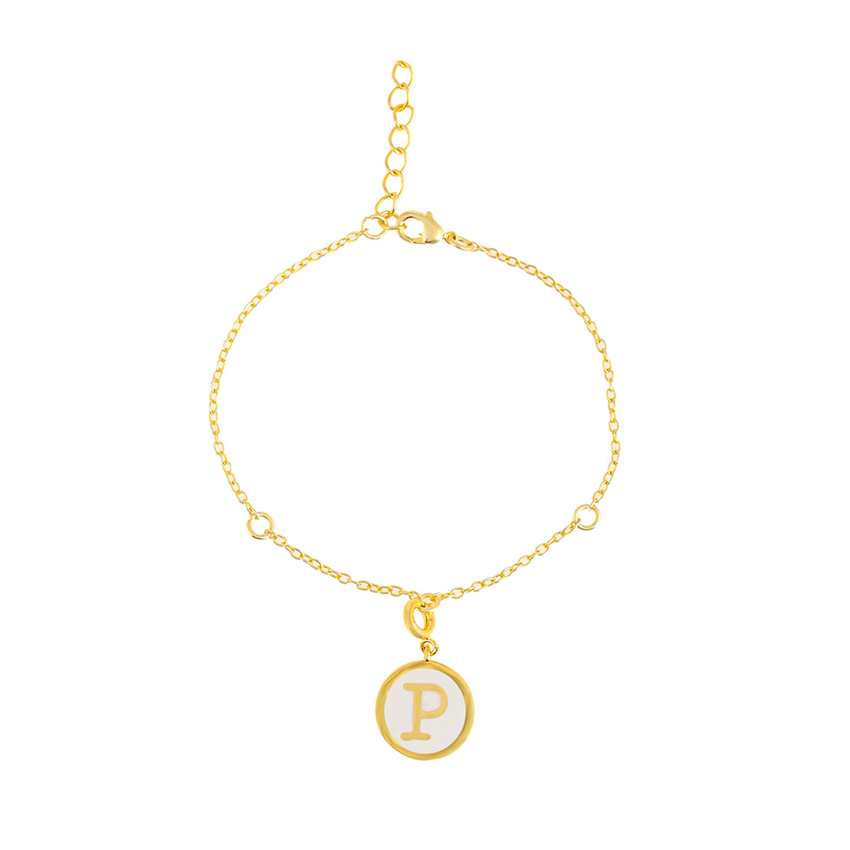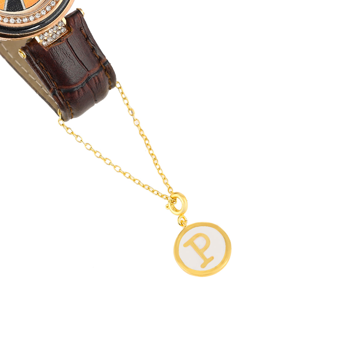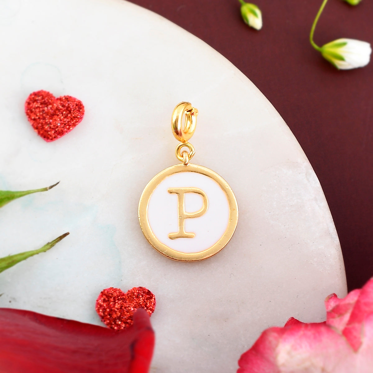 Charm featuring the alphabet P with white enamel details. Made from brass and gold plated. A good gifting option and can be paired with watches and bracelets