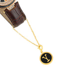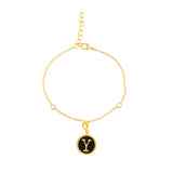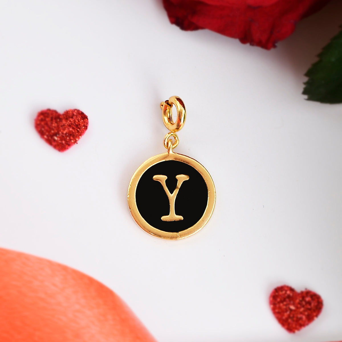 Yellow gold plated alphabet Y charm. Made from brass and featuring black enamel details. A good V Day gift and can be added to watches and bracelets for more allure.