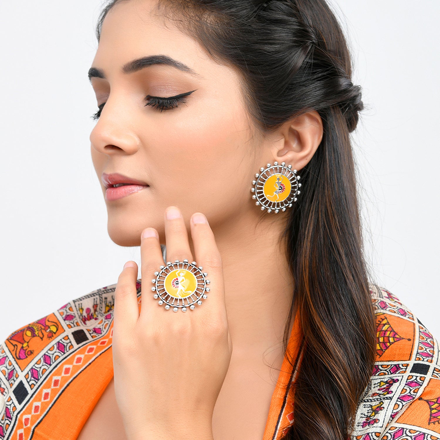 Adorned with tribal motifs and inspired by the Warli artform, this silver plated ring has been fashioned out of brass. Orange enamel adds to the charm of this versatile piece, which is adjustable for maximum comfort.