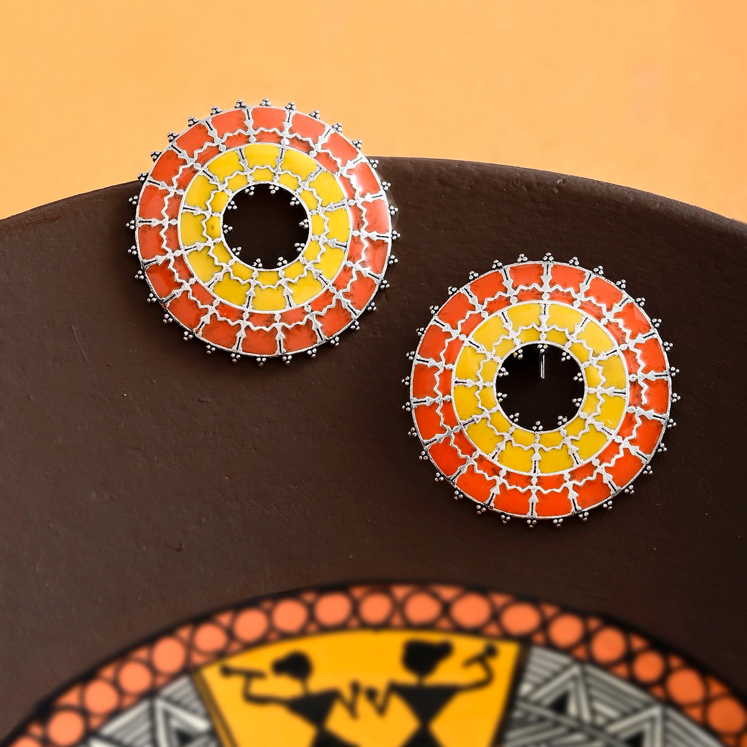 Warli, widely regarded as one of Indian's oldest artforms, has inspired these beautiful earrings, which have been adorned with tribal motifs. Made from brass and silver plated, the enamelled pair brings together Bohemian and minimalistic elements. Pair with any of your favourite outfits.