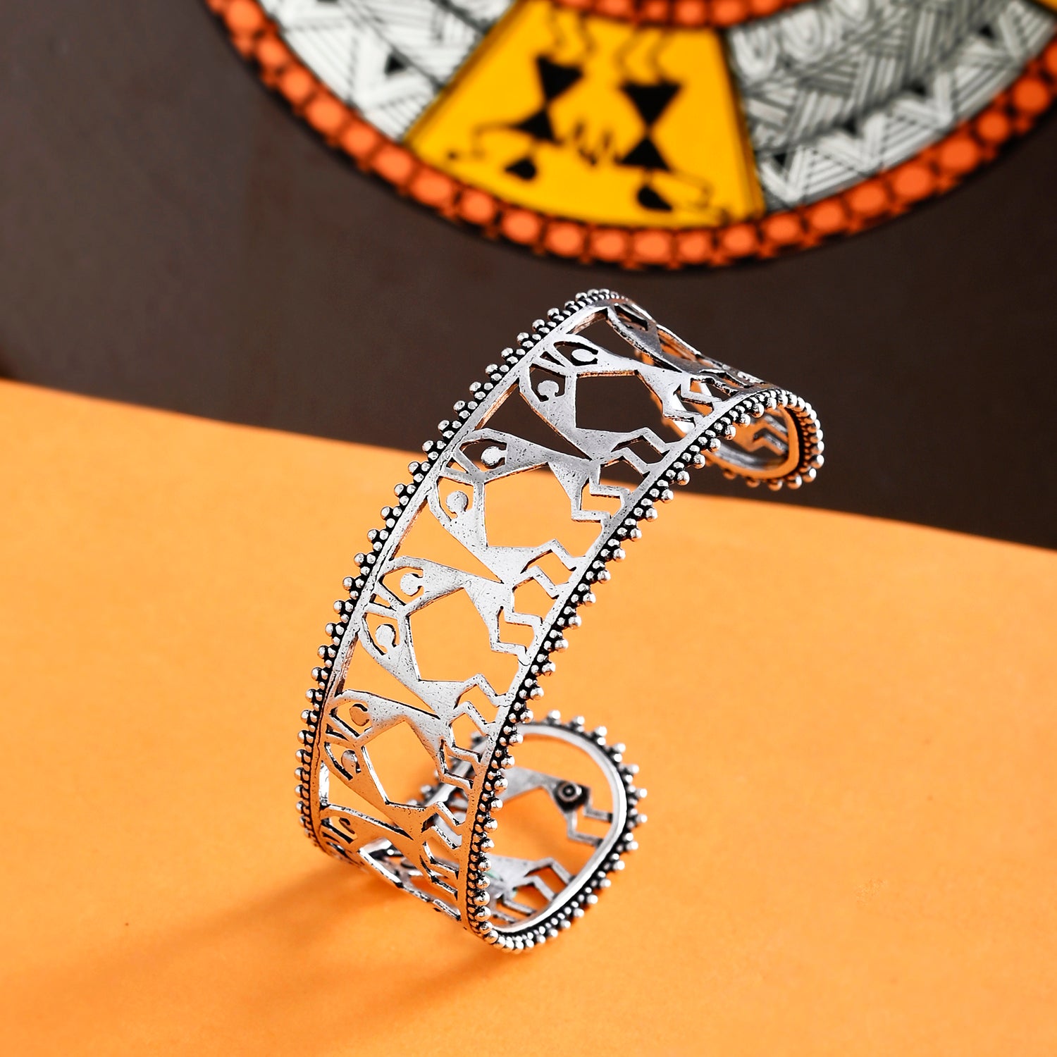 Adorn your wrist with a piece of history with this beautiful cuff bracelet, which has been inspired by the lovely Indian artform of Warli. Made from brass and adorned with tribal motifs, the bracelet is adjustable. Silver plating adds to its rustic charm.
