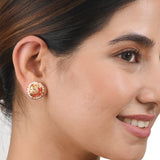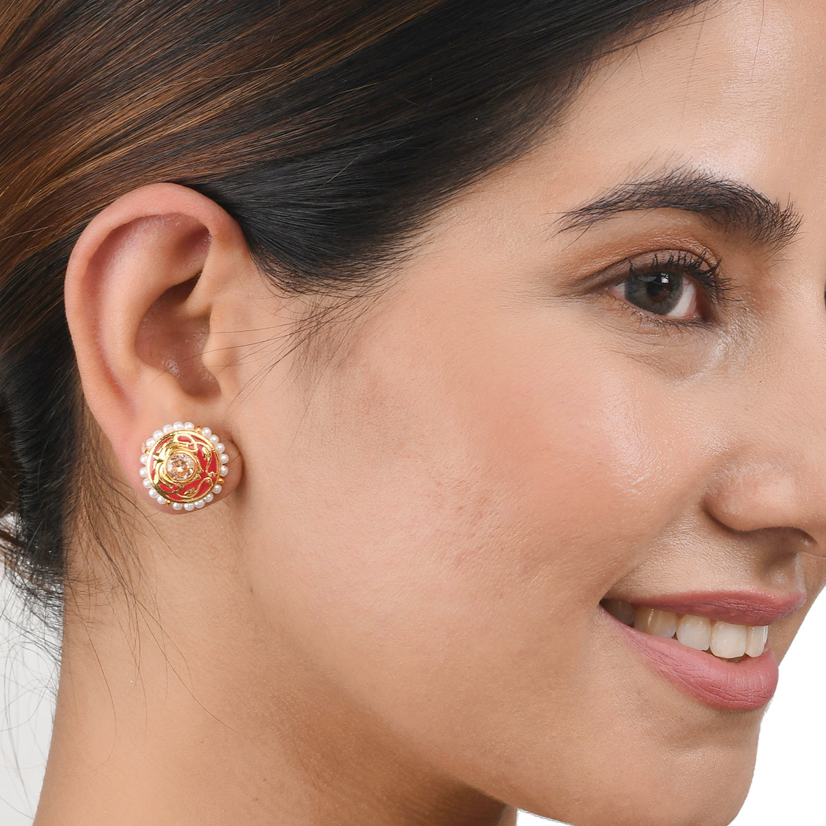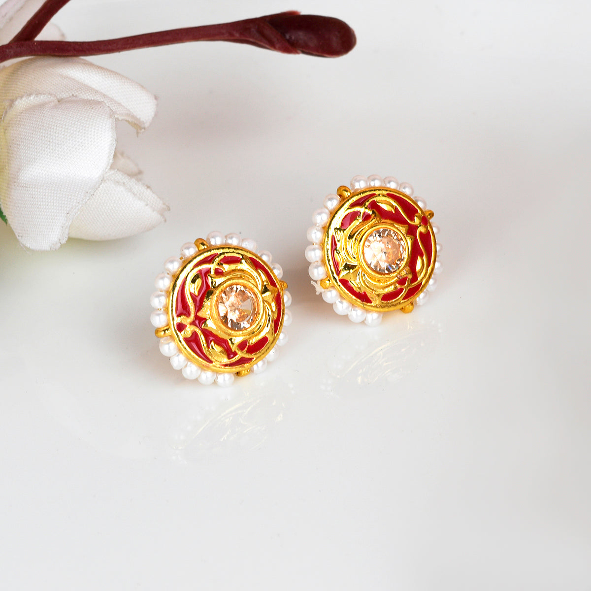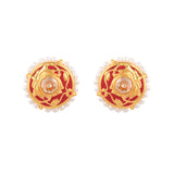 Ethnic stud earrings fashioned out of brass. Enamelled and beaded with pearls, the pair has been given a stunning gold plating. Pair with any of your favourite Indian outfits.