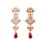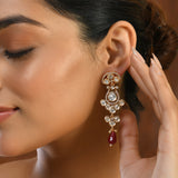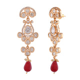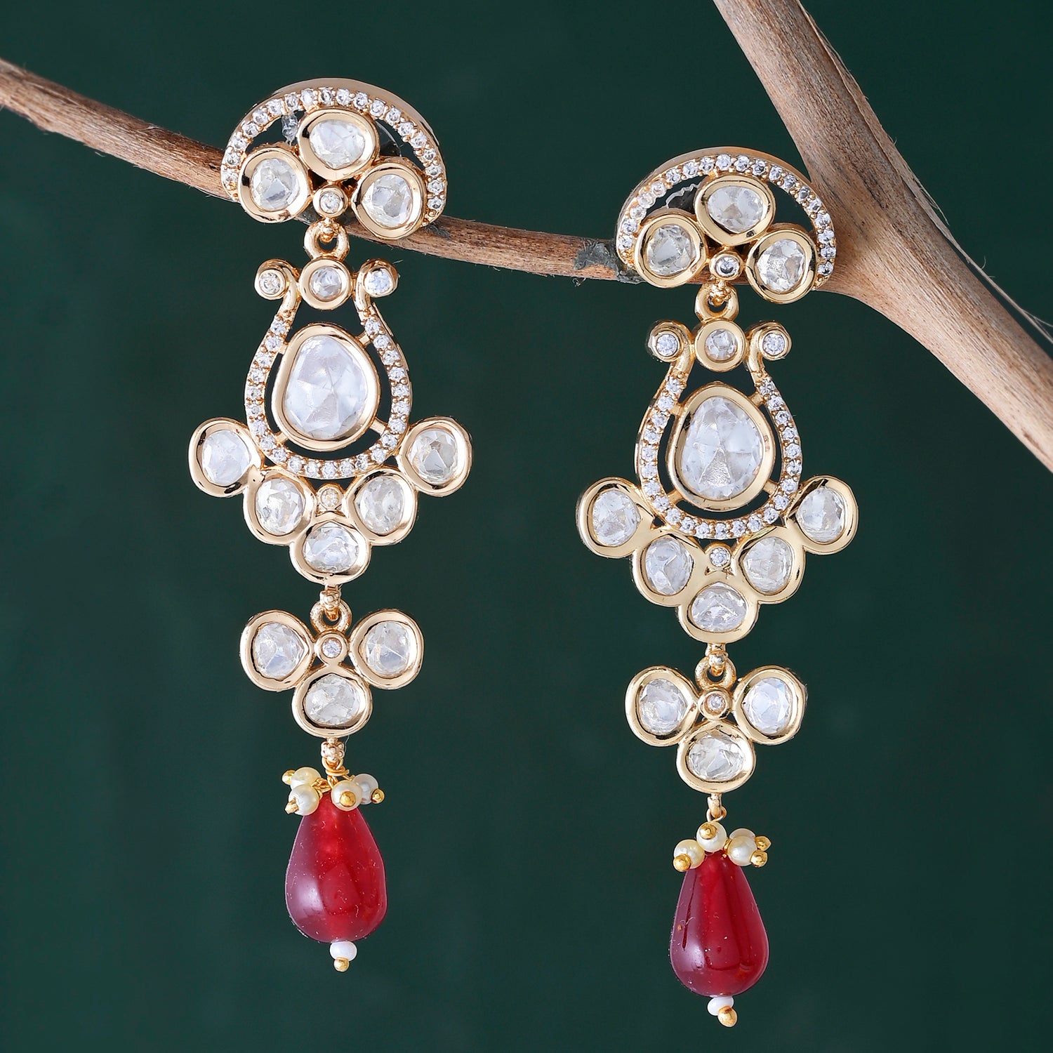 Elevate your style with the Mohini Dangler Earrings, a masterpiece from the Kundan Elegance collection. Crafted from high-quality brass with a luxurious gold plating, these earrings are a harmonious blend of traditional and contemporary designs. Adorned with sparkling American diamonds and a striking red bead at the bottom, they add a touch of timeless elegance to any outfit. The intricate design and superior quality make these earrings perfect for everyday wear, as well as special occasions like weddings, parties, and festive celebrations. Whether you're pairing them with ethnic or western outfits, these earrings effortlessly enhance your look, making you stand out in any crowd. Ideal for gifting, the Mohini Dangler Earrings are a thoughtful present for Valentine's Day, Diwali, Rakshabandhan, Christmas, New Year, and more. Show your loved ones how much you care with a gift that exudes elegance and charm.
