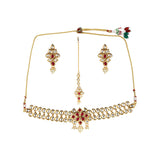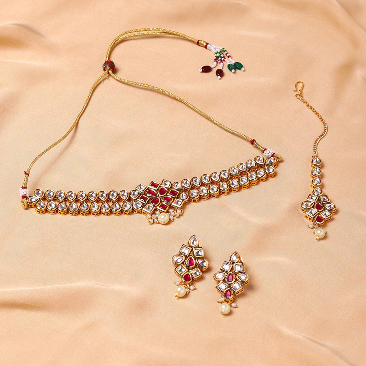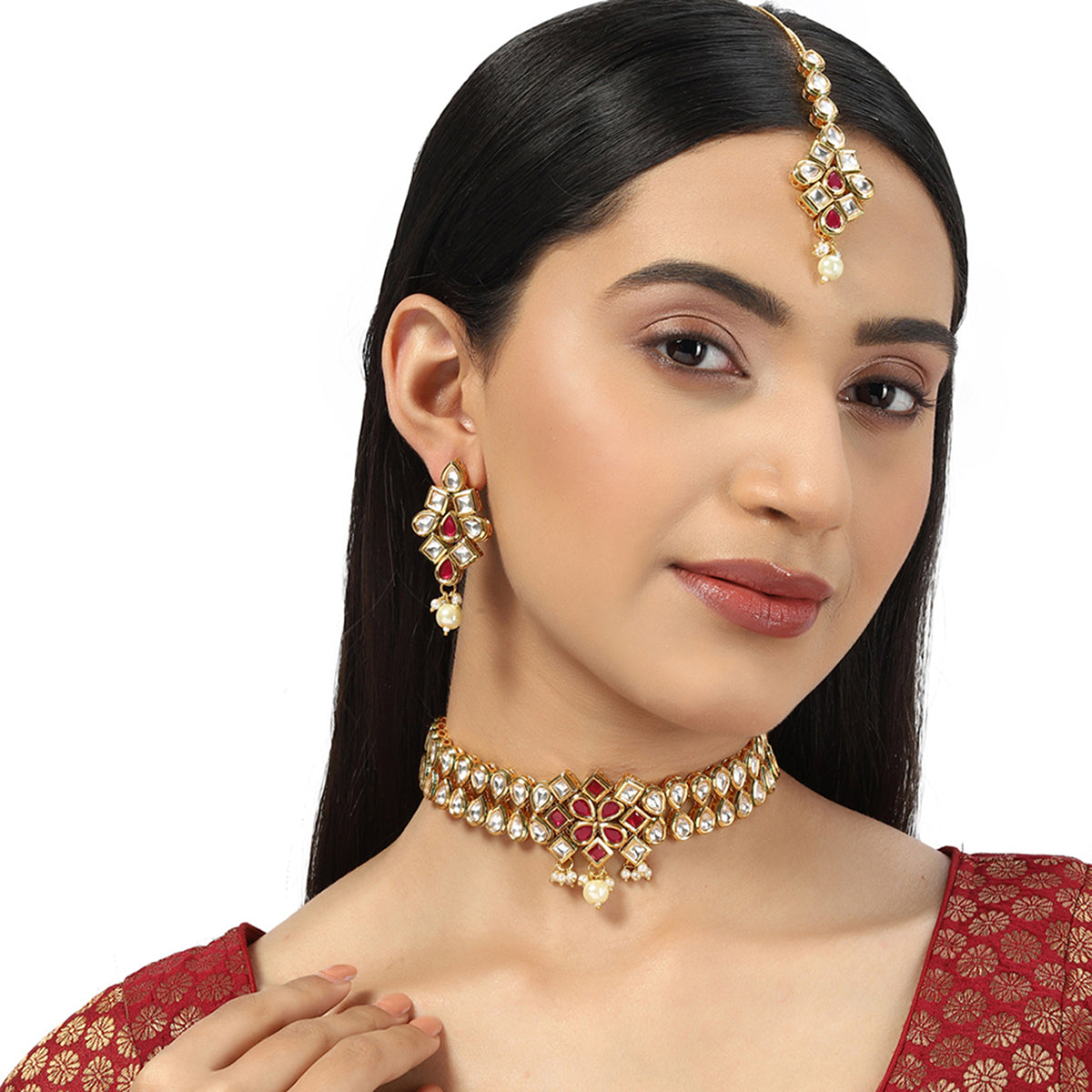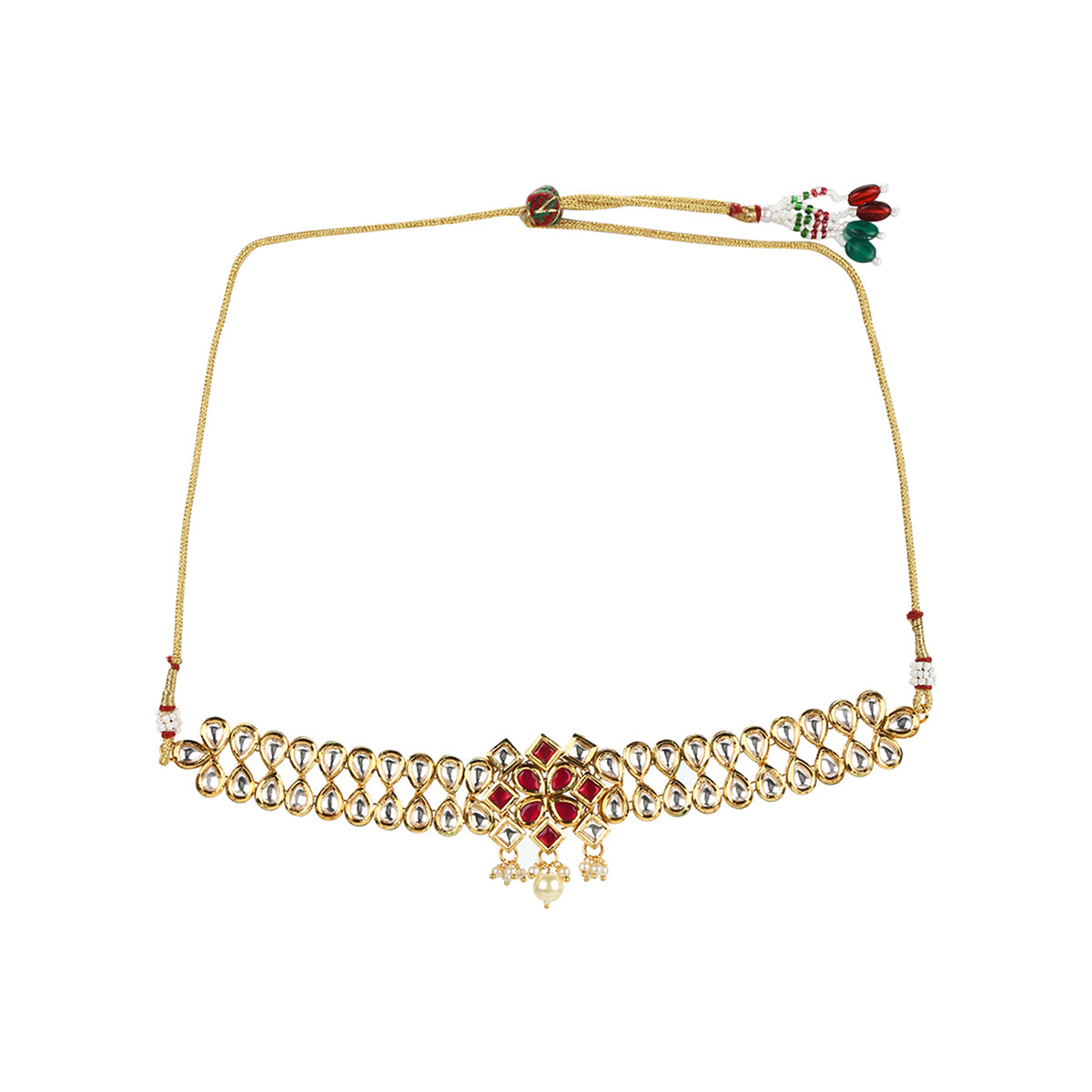 A tightly knitted design that gives the look of a band alongside sleek shaped maangtika is a forever thing to keep with you. Light makeup is our take to carry it well.