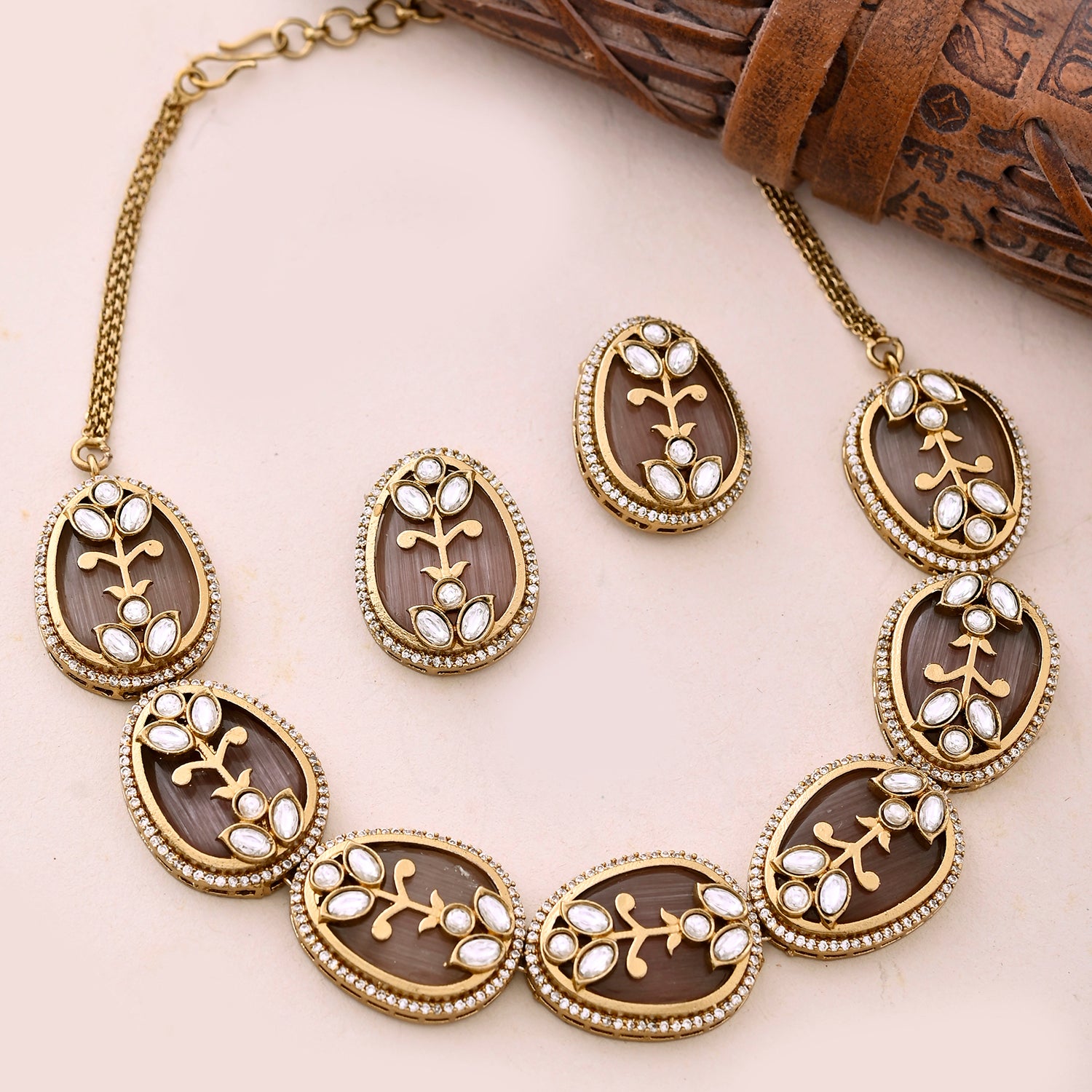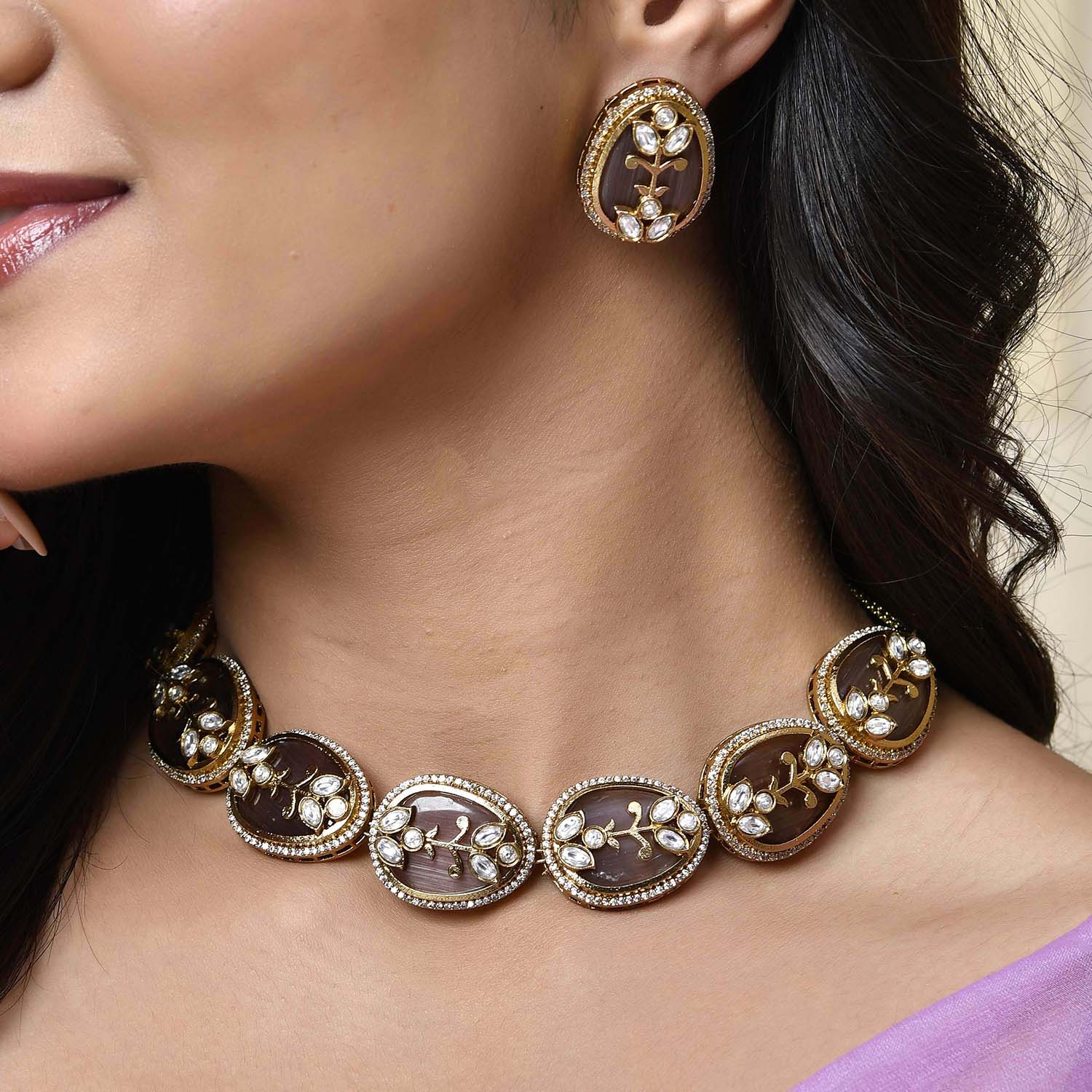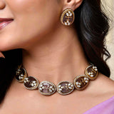 The Regal Garden Kundan Necklace Set from the Kundan Opulence collection is an epitome of luxury and tradition. Crafted from high-quality brass and elegantly plated with gold, this necklace set showcases intricate floral designs adorned with shimmering Kundan stones and American diamonds. Perfect for weddings, festive occasions, and special events, it exudes an air of sophistication and elegance. The versatile design allows you to pair it effortlessly with traditional ethnic wear like sarees and lehengas, or even contemporary dresses, adding a touch of regality to your ensemble. The warm, earthy tones make it an ideal gift for occasions such as Valentine's Day, Diwali, Rakshabandhan, Christmas, and New Year, making it a cherished present for your loved ones, be it your wife, girlfriend, mother, sister, or friend. This statement necklace set is sure to be admired and treasured for its timeless beauty and quality craftsmanship.
