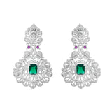 The Emerald Plume American Diamond Necklace Set boasts a truly exquisite design, crafted to captivate and enchant. This stunning piece features intricately detailed peacock motifs, each feather meticulously adorned with sparkling American diamonds that catch the light with every movement. The centerpiece of the necklace is a radiant Emerald gemstone, perfectly cut to enhance its brilliance and set in a delicate prong setting that highlights its vibrant color.The necklace's chain is designed with a series of elegantly interlinked loops, each one encrusted with shimmering American diamonds, creating a seamless flow of sparkle and shine. The matching earrings echo the peacock motif.Perfect for party wear, weddings, and festive occasions, this versatile set can be styled with both traditional and western outfits. It makes an ideal gift for women on special occasions such as Valentine's Day, Diwali, Rakshabandhan, Christmas, and New Year. Whether for a girlfriend, wife, mother, or sister, this glamorous necklace set is sure to make a memorable impression.
