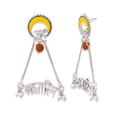 Drop style earrings, fashioned out of brass and inspired by the ancient Indian practices of yoga and self exploration. Featuring “Aham Brahmasmi” inscription, these oxidised plated earrings have been lightly embellished. Pair with causal Indian or Indo-Western looks.