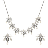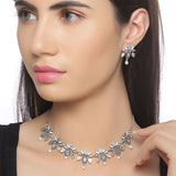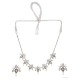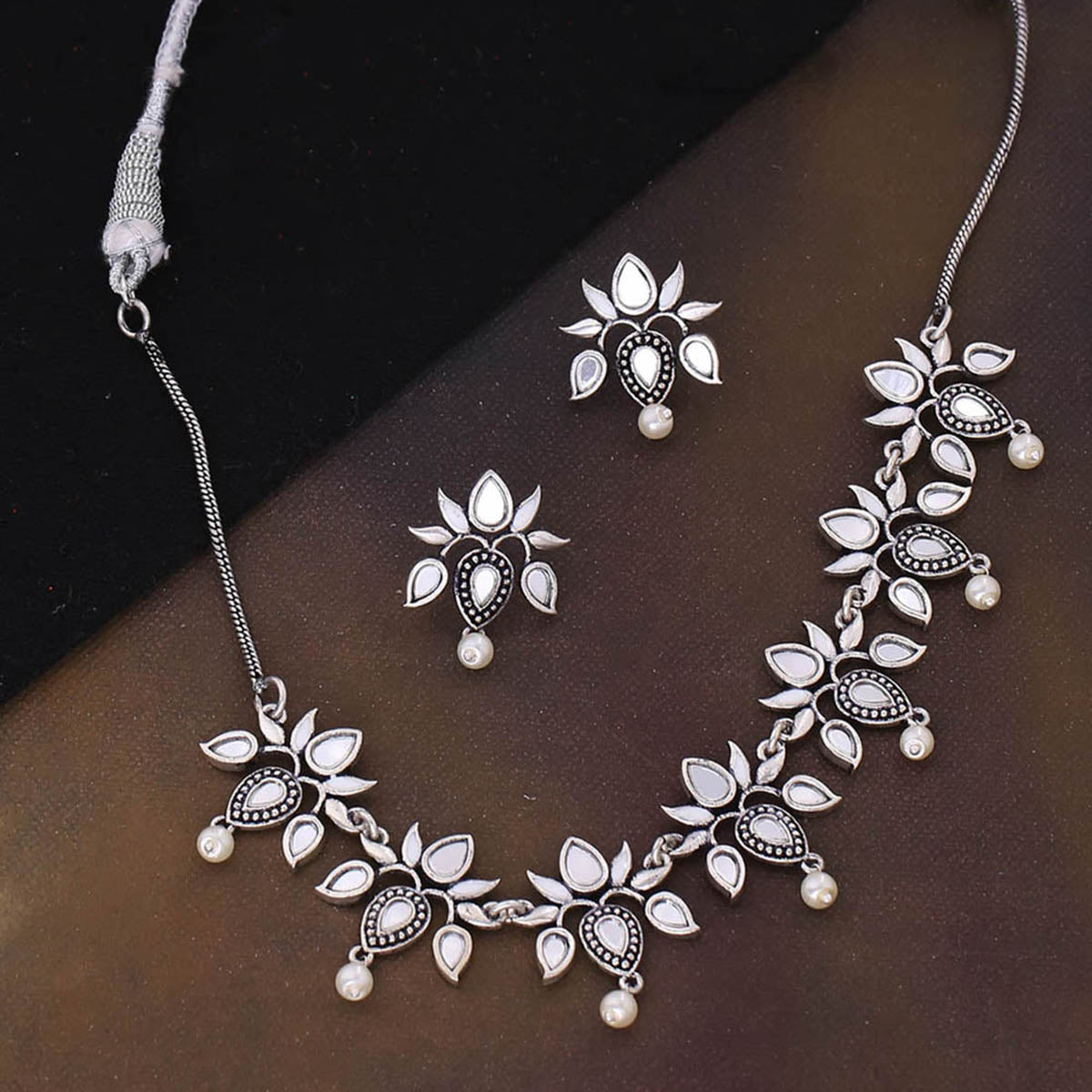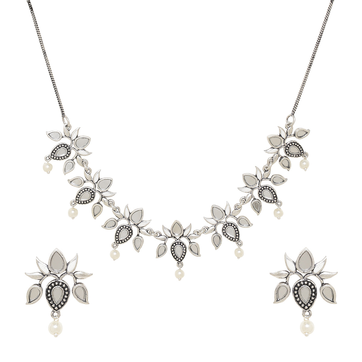 The brass necklace set with mirror details and faux pearls has been inspired by the grace of Sheesh Mahal. Oxidized silver plated, the set is a perfect match for casual ethnic and Indo-Western looks. This piece of jewelry comes with the Voylla assurance of quality and durability.