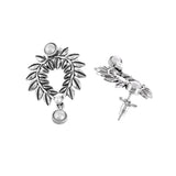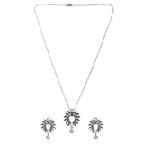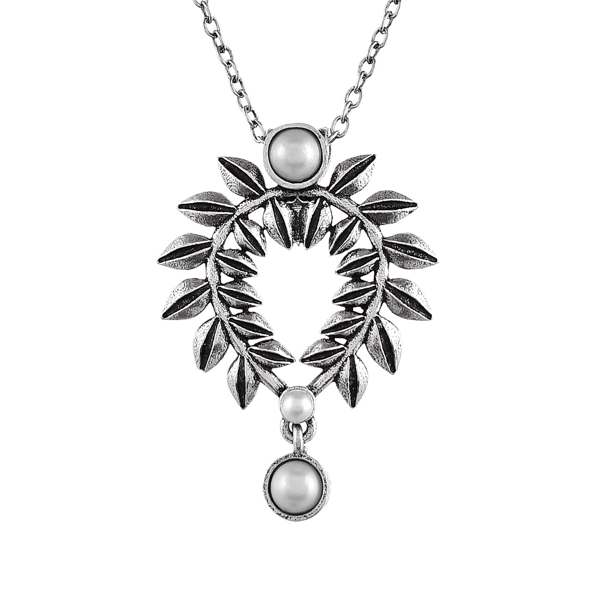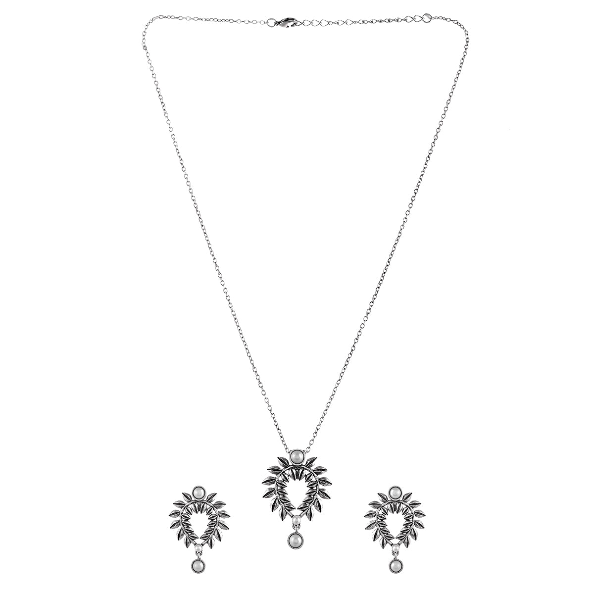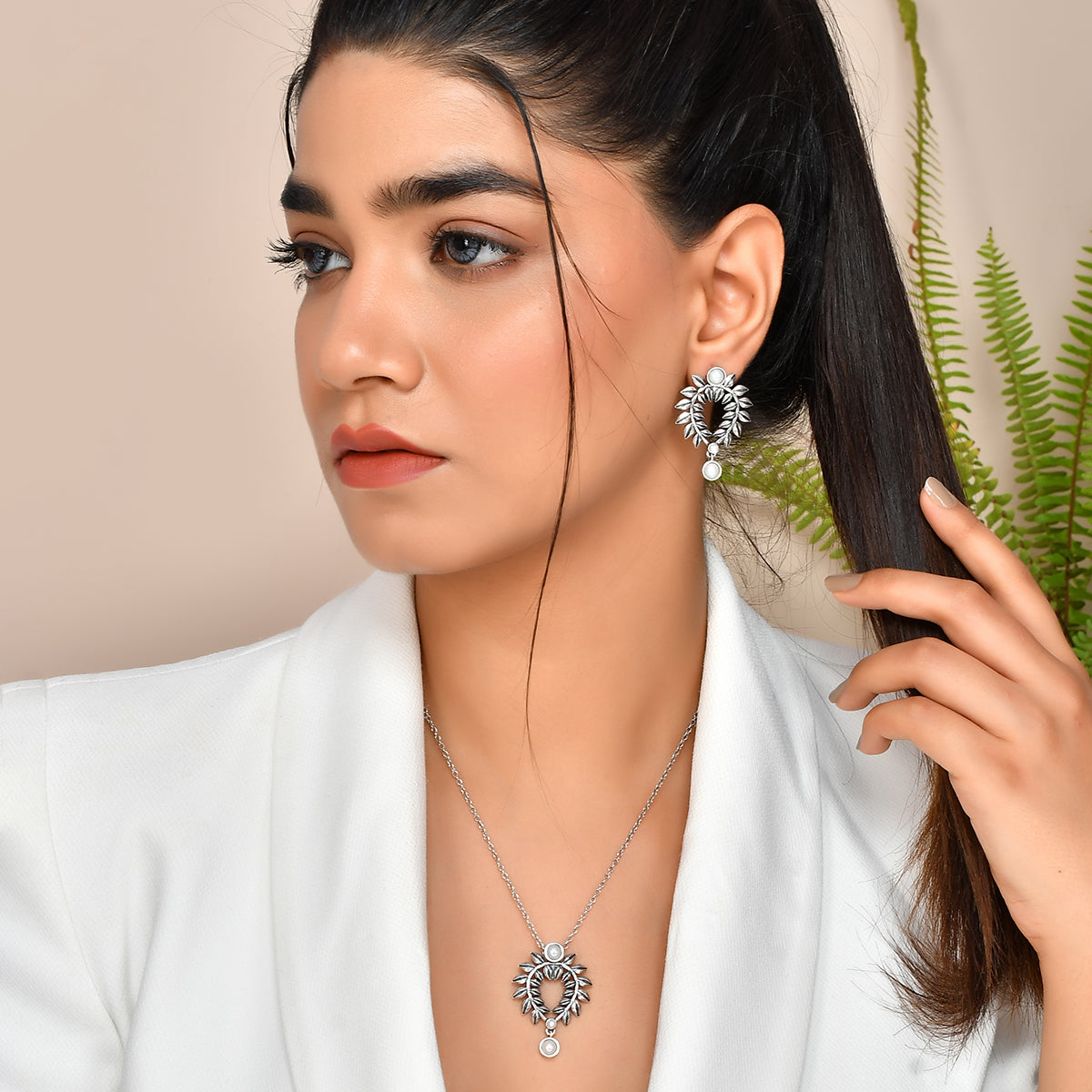 A brass jewellery set, fashioned into a contemporary design with leaf motifs inspired by the fern leaf which is a symbol of strength and new beginnings. Oxidized silver plated and versatile enough to be paired with just about everything, the set been adorned with white pearls..